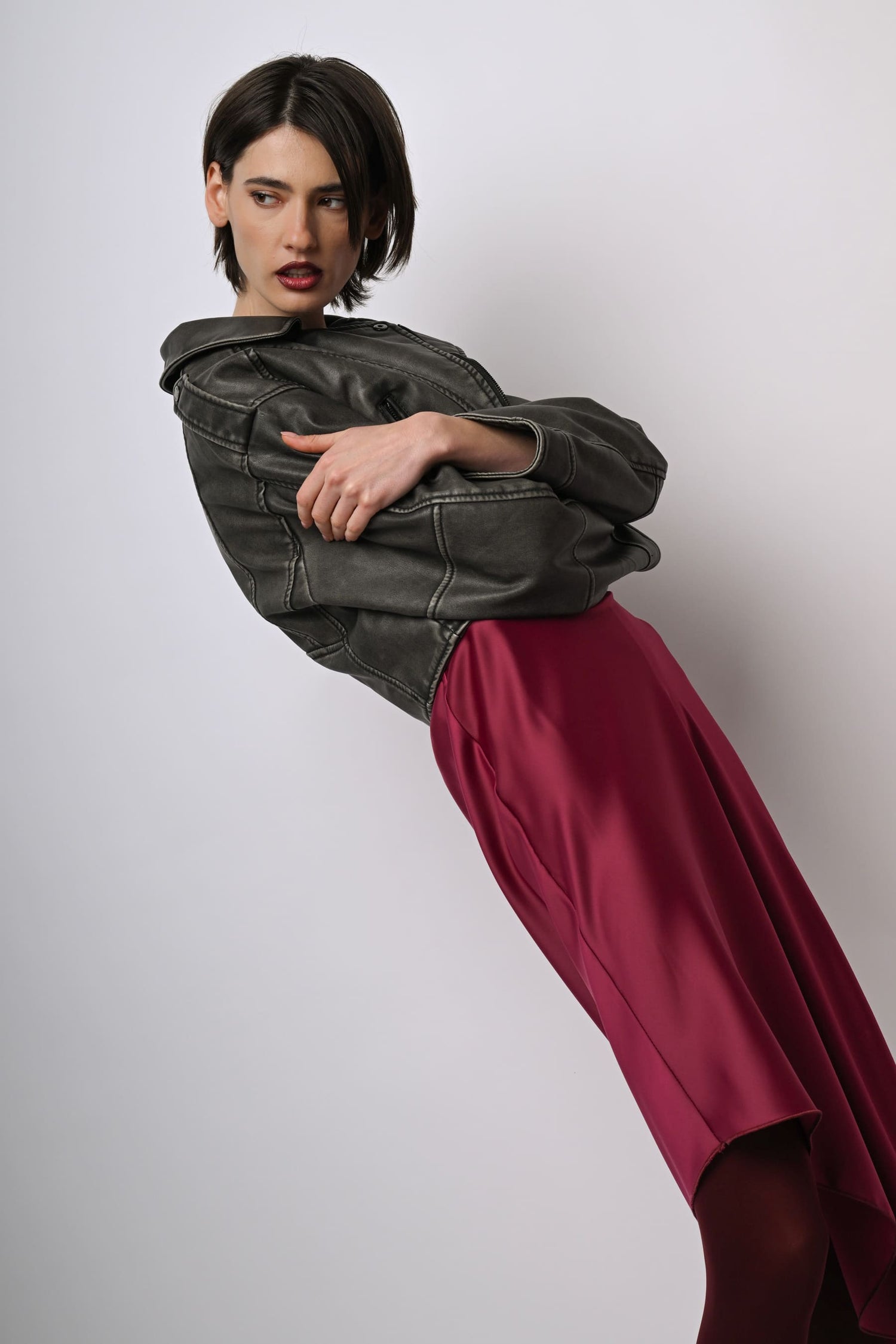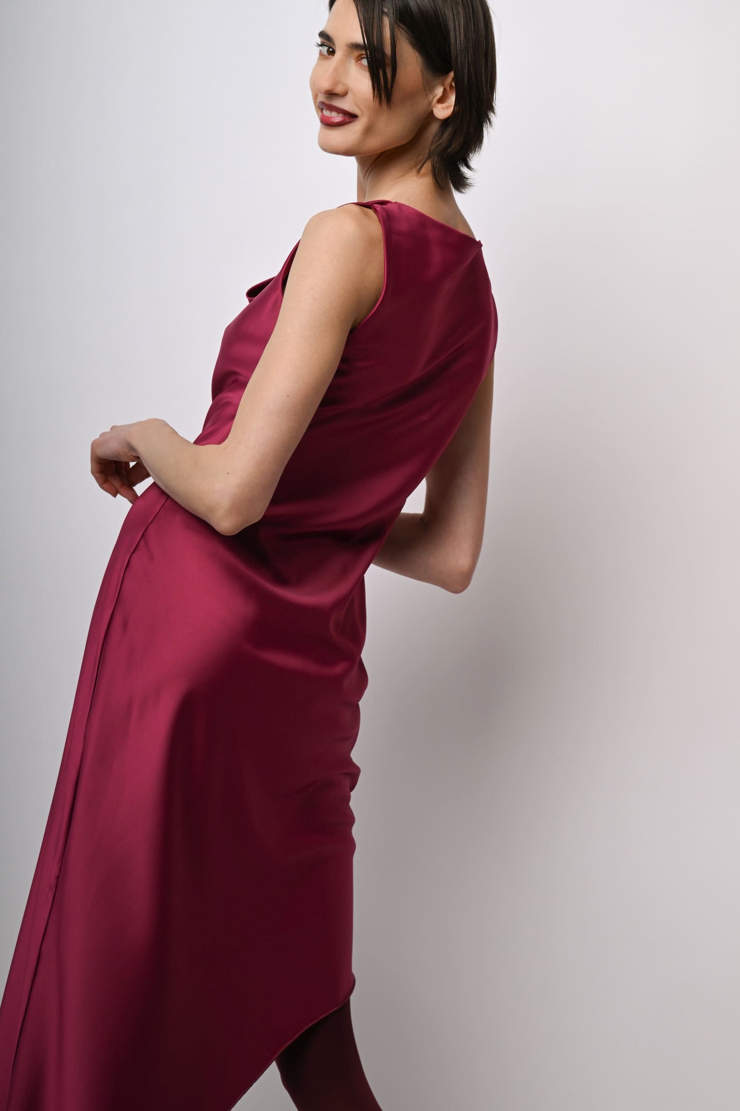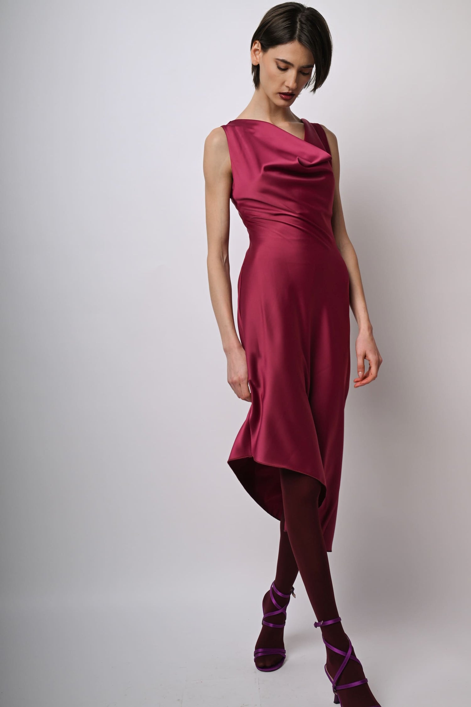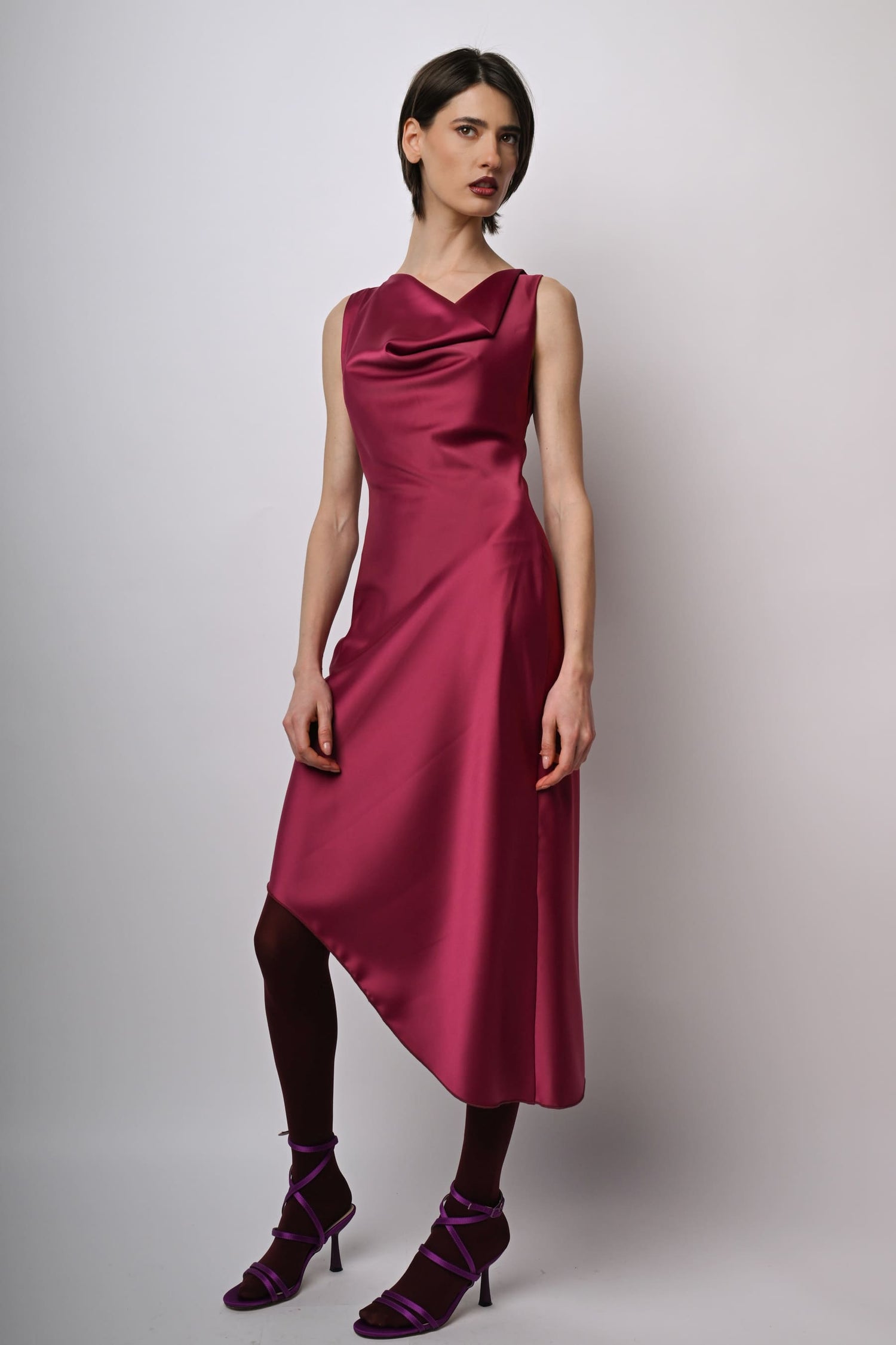 Abito midi in raso stretch fucsia con scollo drappeggiato, silhouette aderente svasata al fondo e orlo asimmetrico.