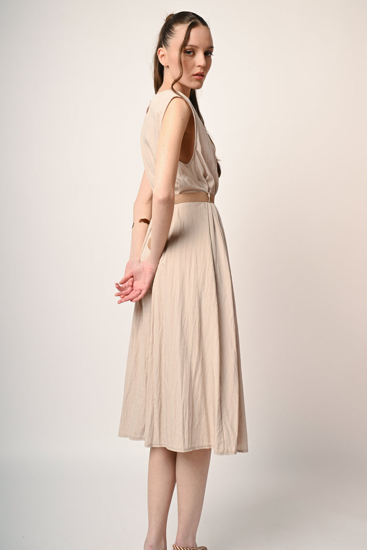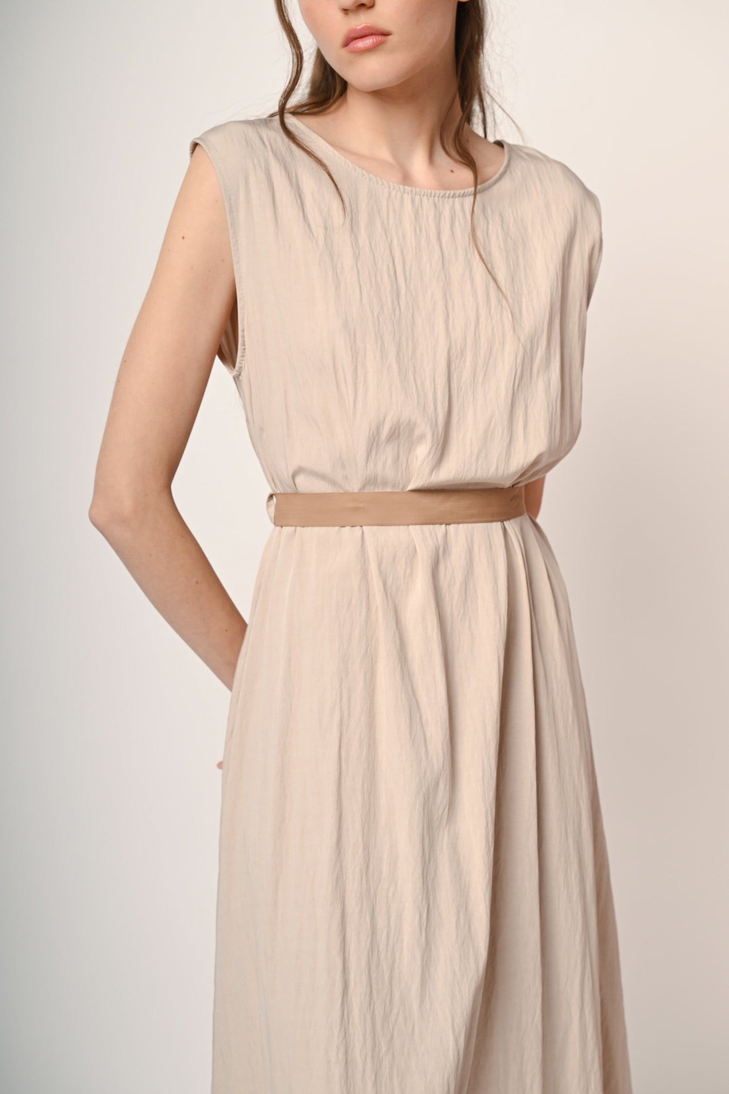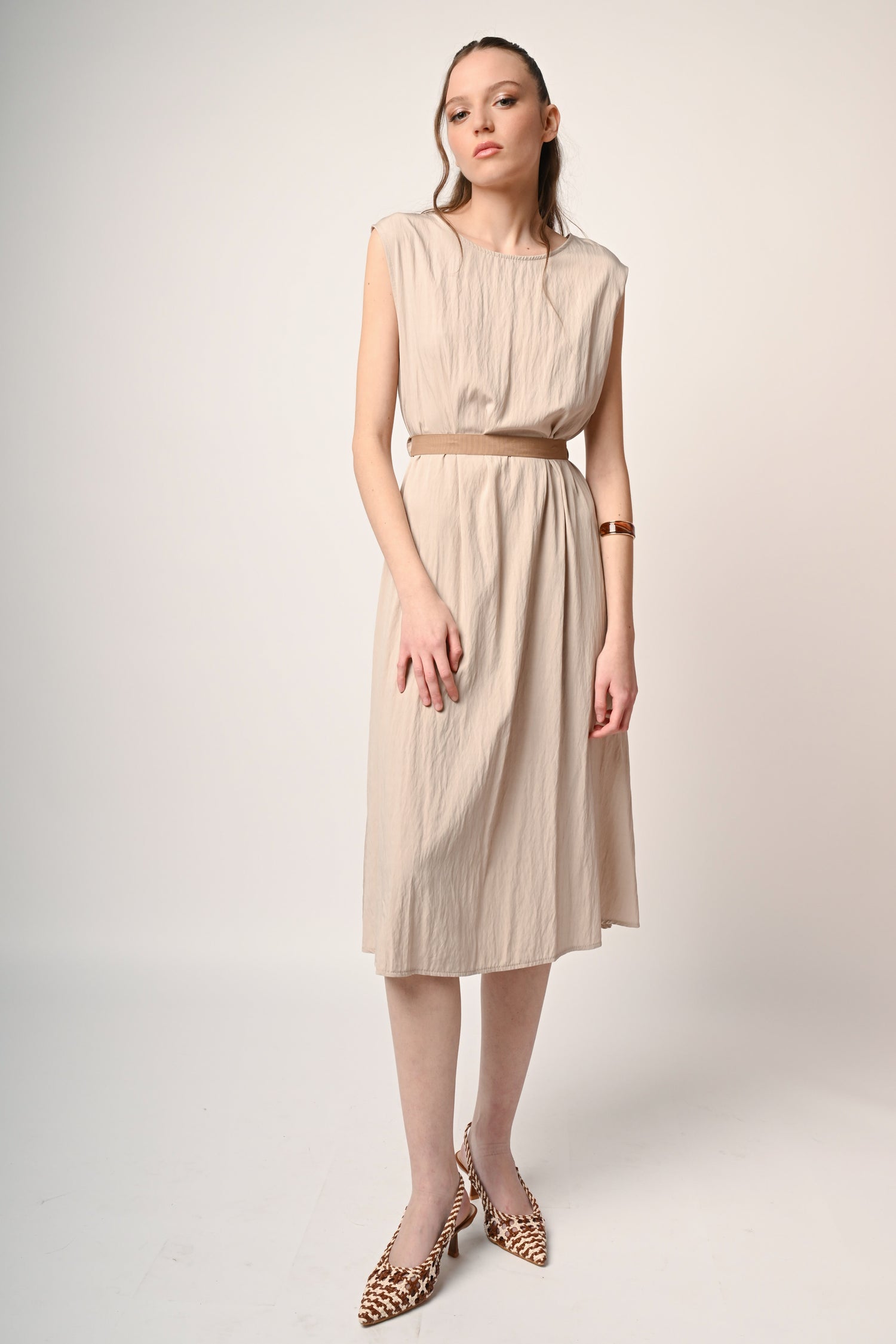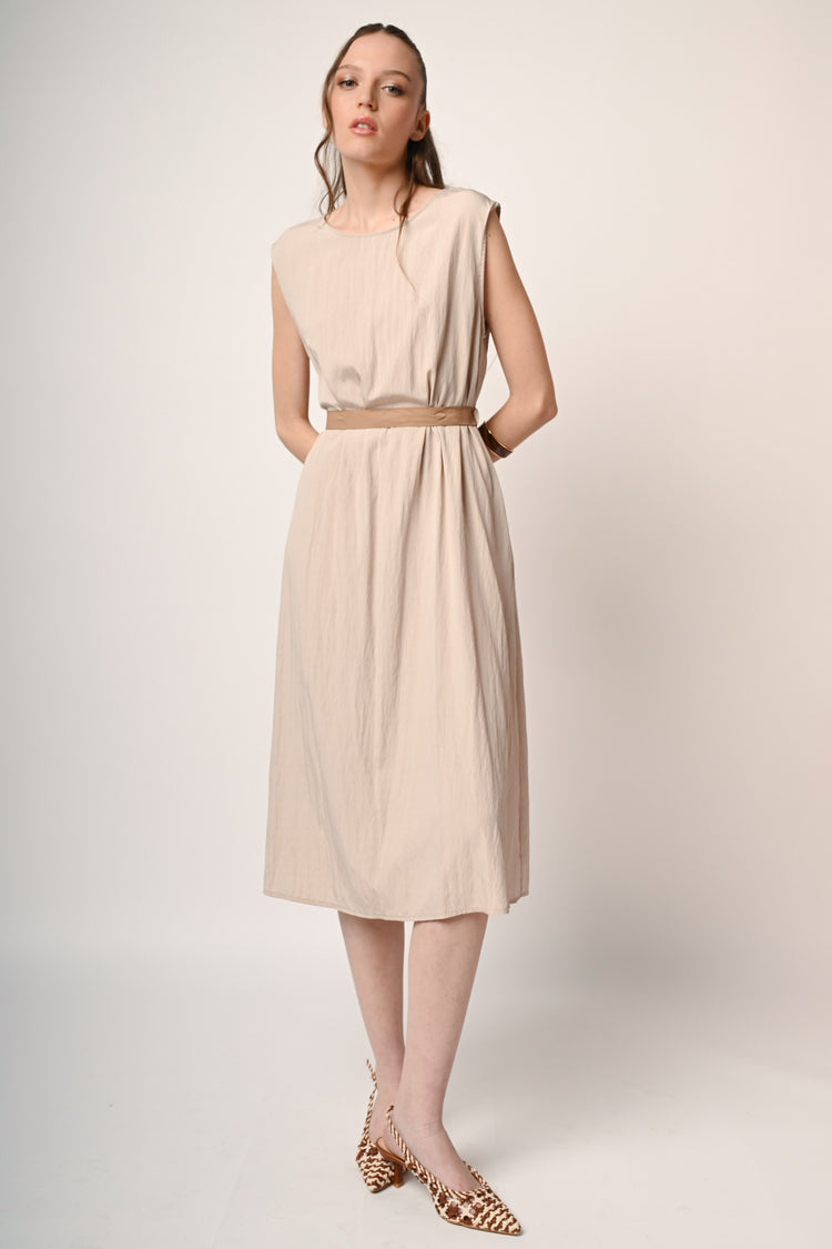 Abito midi misto viscosa beige con scollo tondo, maniche ad aletta, cintura da annodare in grosgrain alla vita, chiusura a goccia con bottone sul retro e taglio svasato.