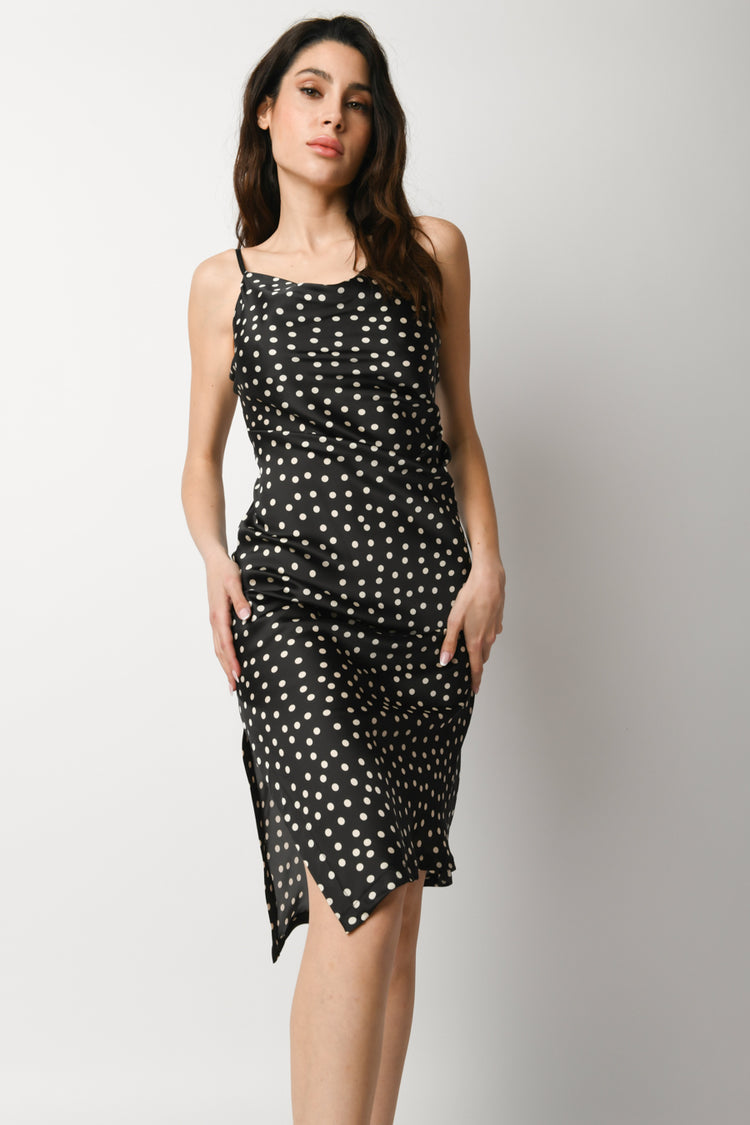 Abito midi in raso a stampa pois bianchi su fondo nero con spalline sottili regolabili, scollo drappeggiato spacco laterale.