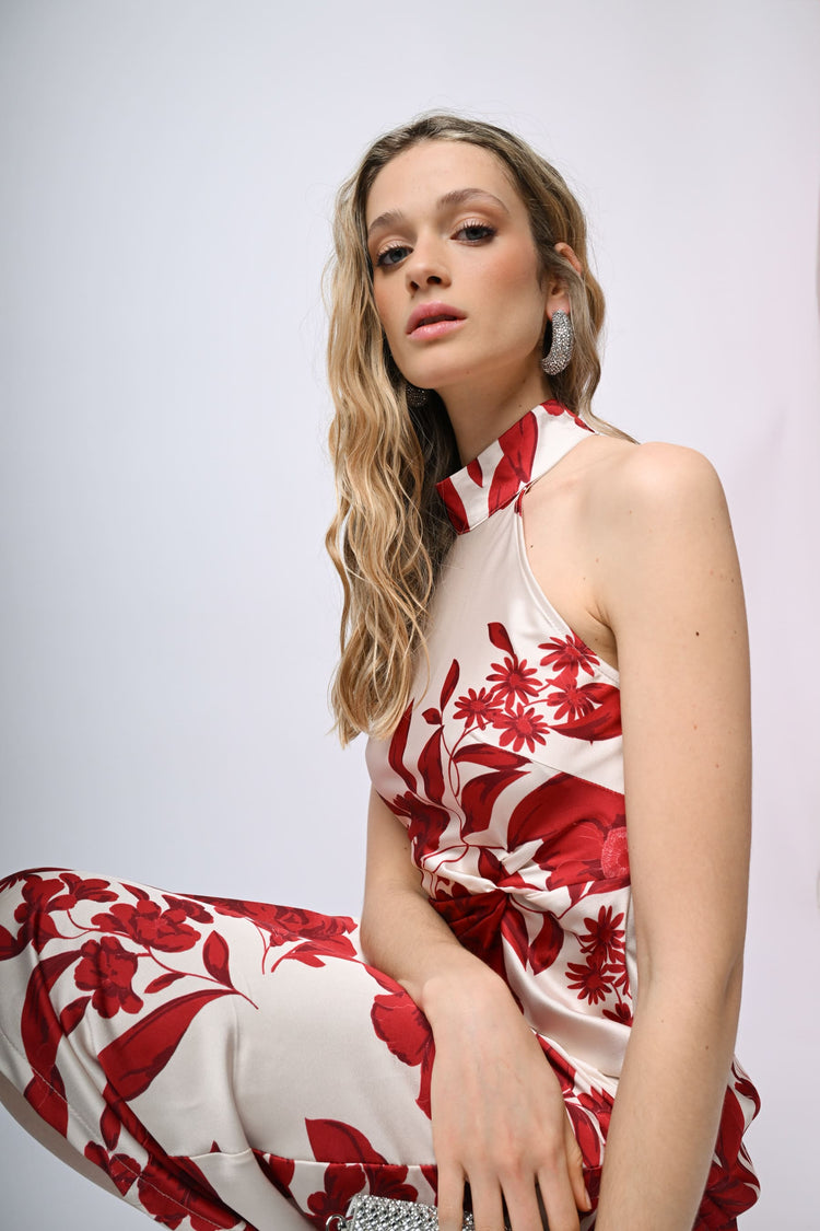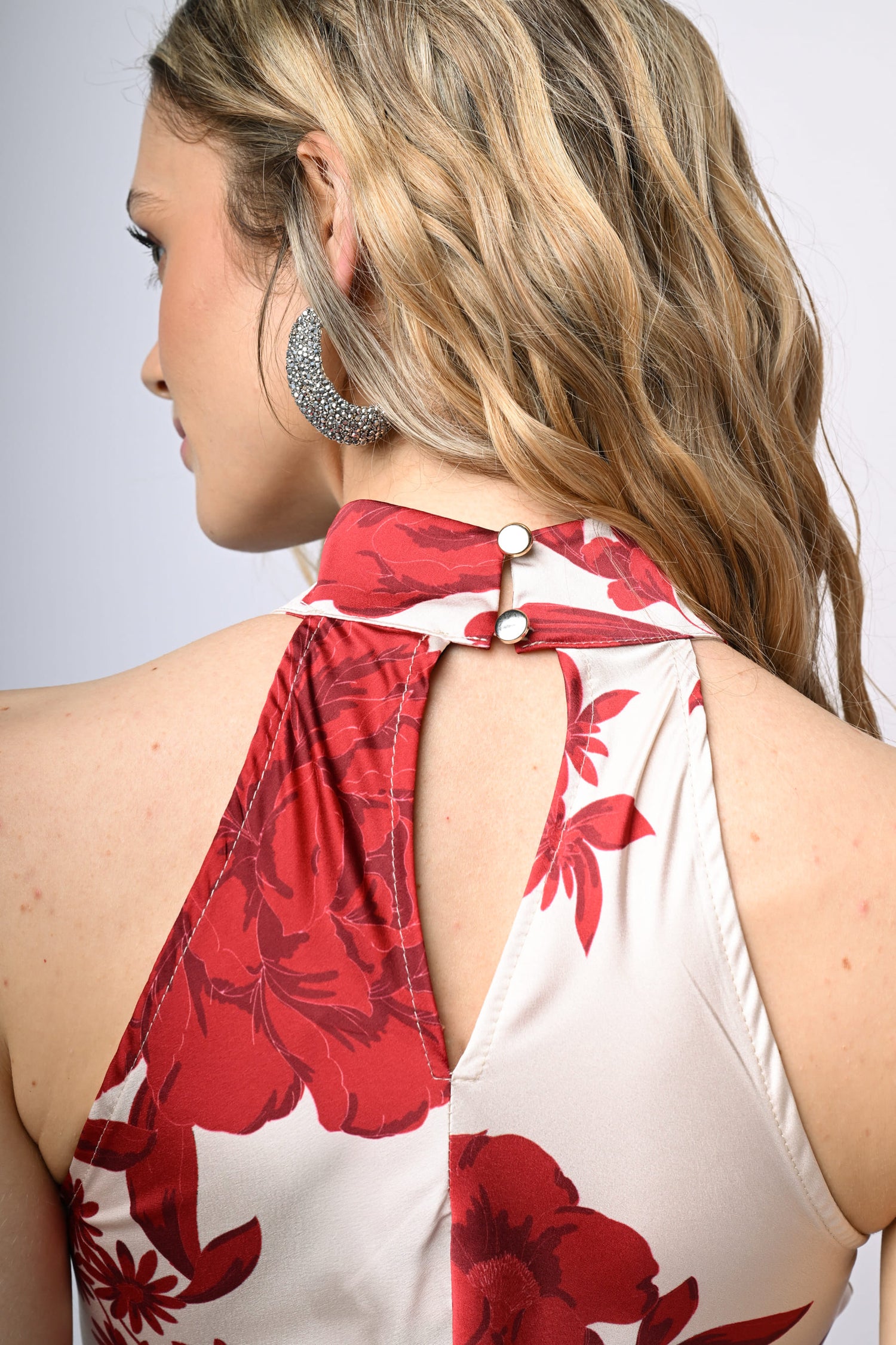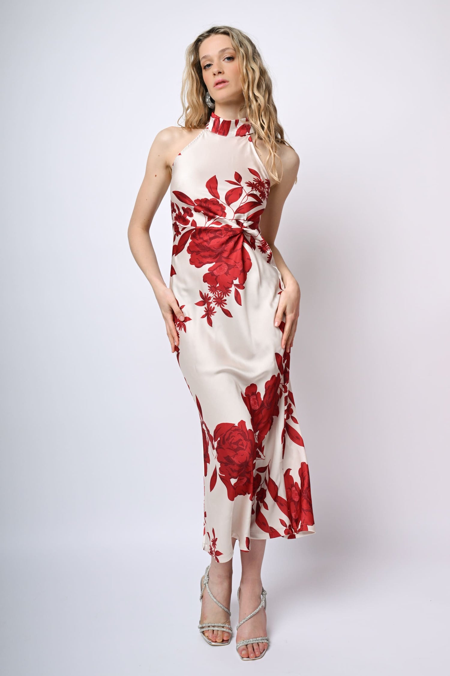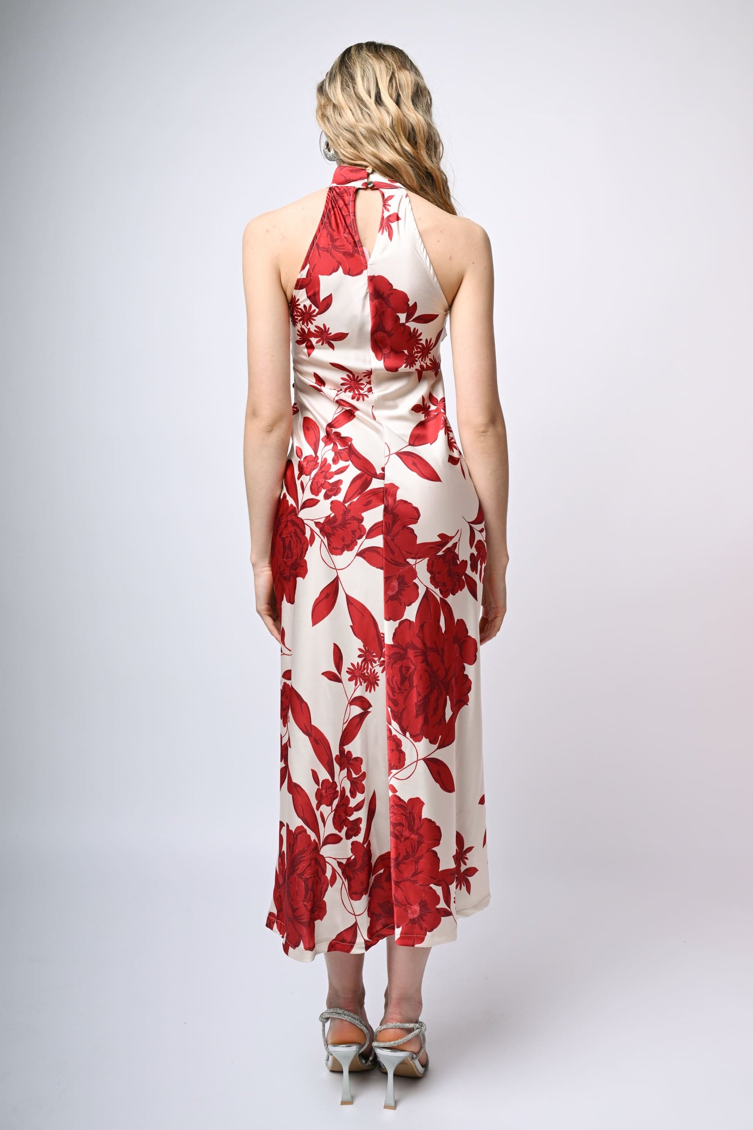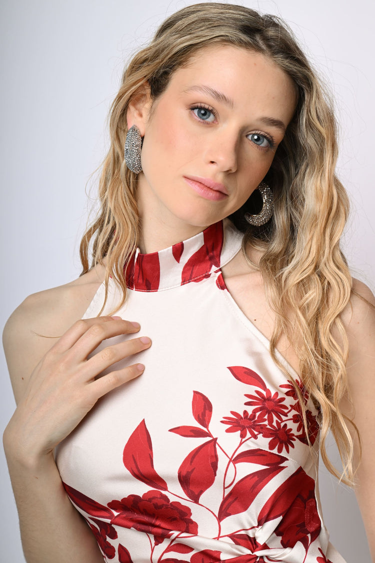 Abito lungo in raso con taglio allamericana, stampa floreale nei toni del rosso su fondo bianco, scollo a goccia sul retro con bottoni di chiusura, nodo drappeggiato alla vita, zip laterale di chiusura e gonna svasata.