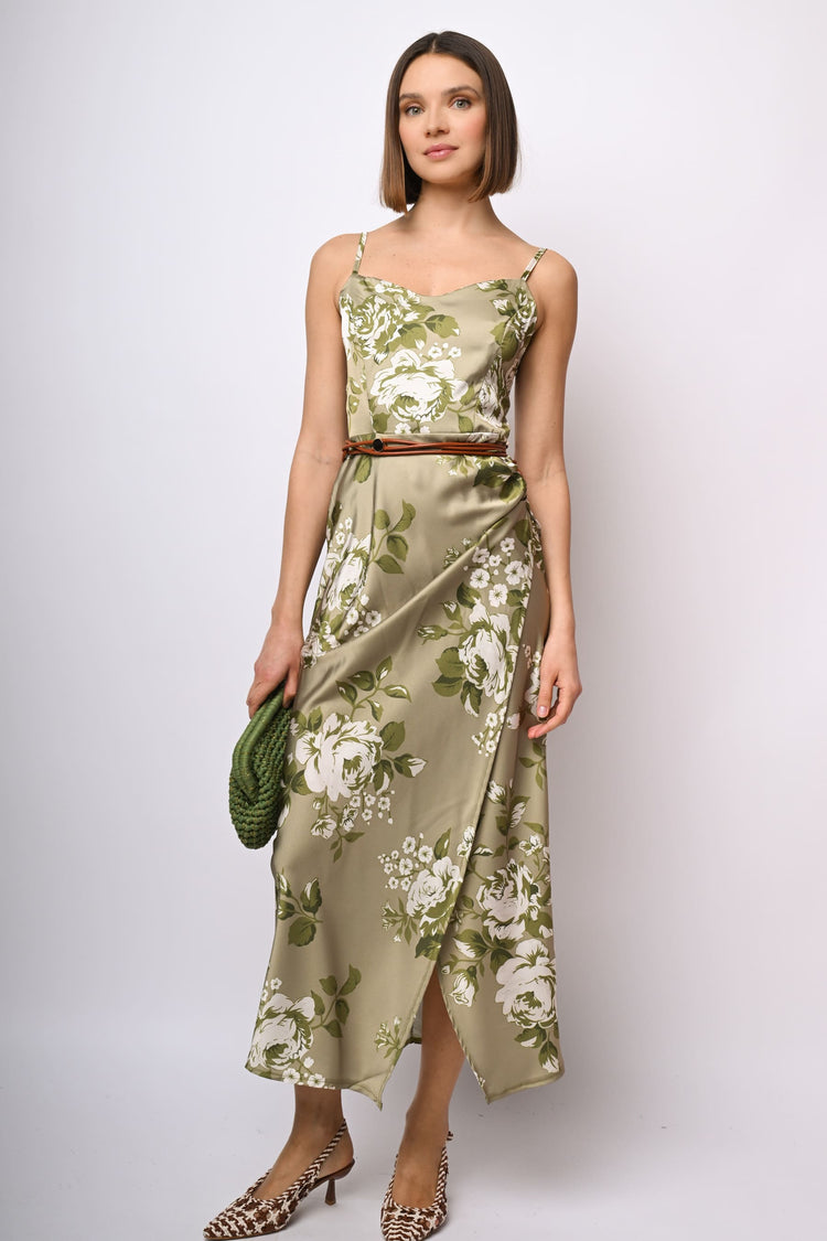 Abito lungo in raso a stampa floreale nei toni del verde con spalline sottili regolabili, scollo a cuore, bustino elasticizzato a punto smock sul retro e gonna sovrapposta con drappeggio sil fianco e spacco.