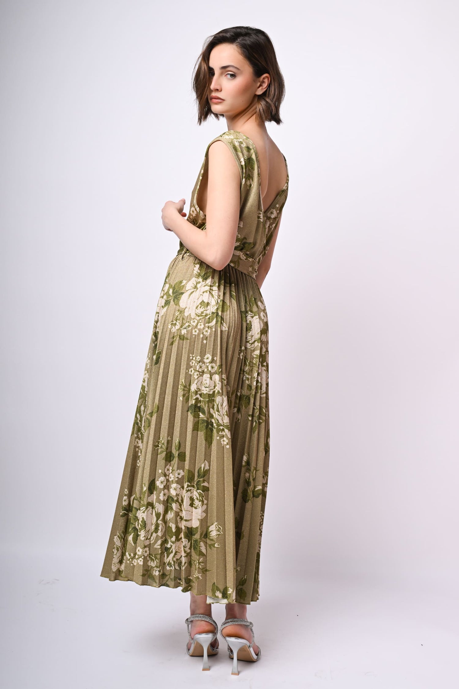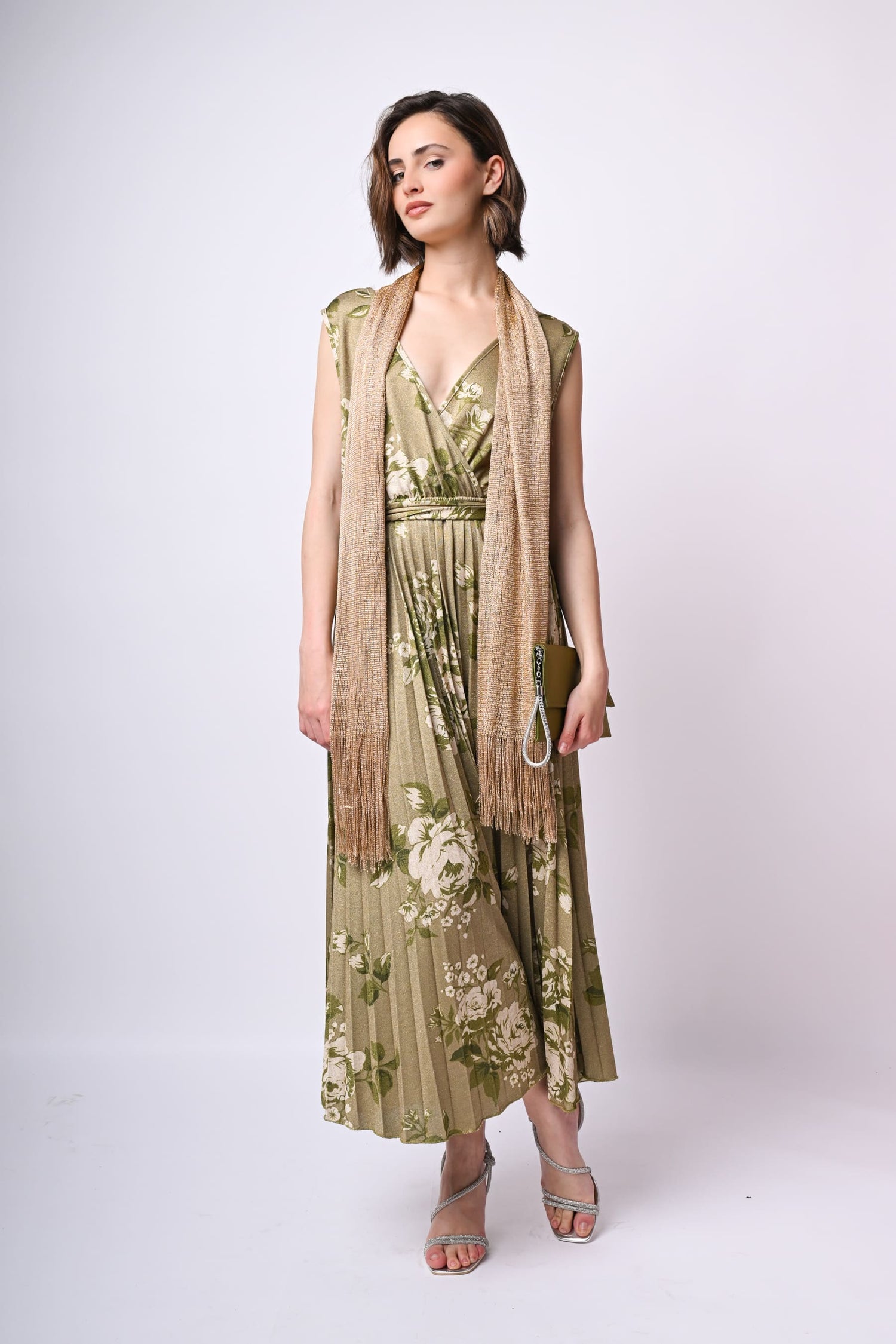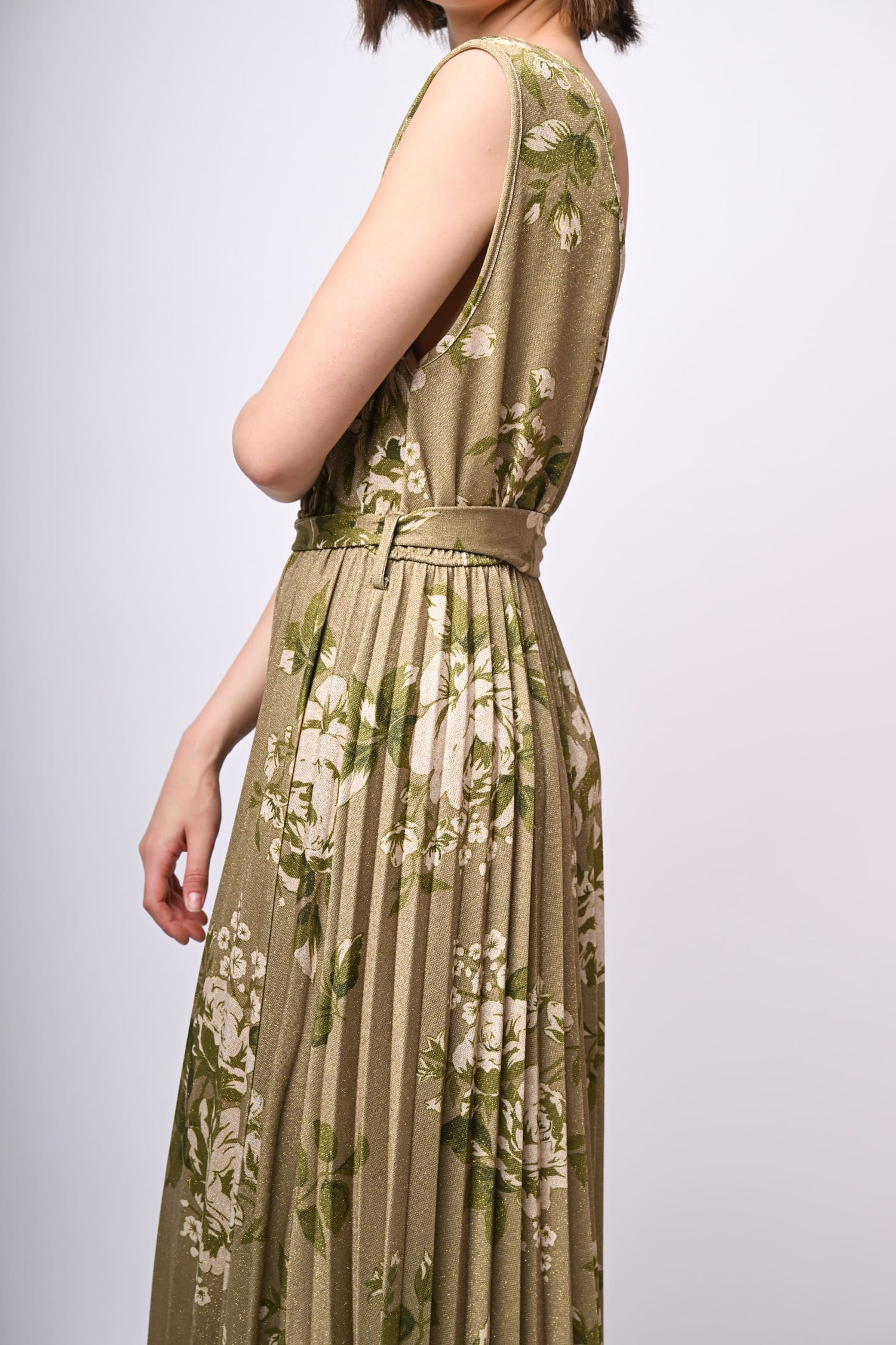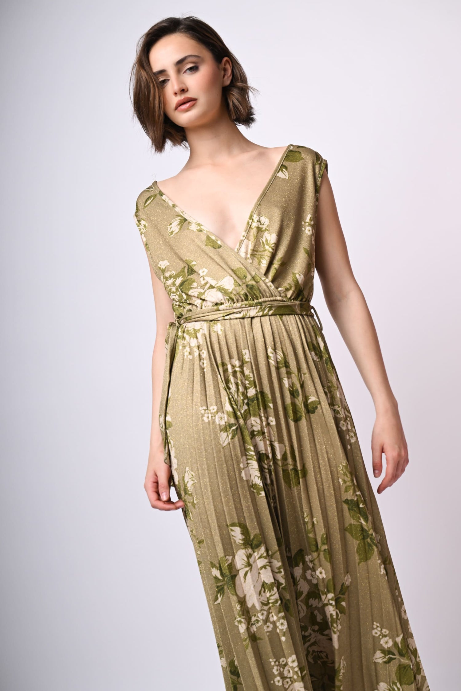 Abito lungo in maglia lurex stretch verde con stampa floreale, scollo a V incrociato, vita elasticizzata con cintura coordinata da annodare e gonna plissé.