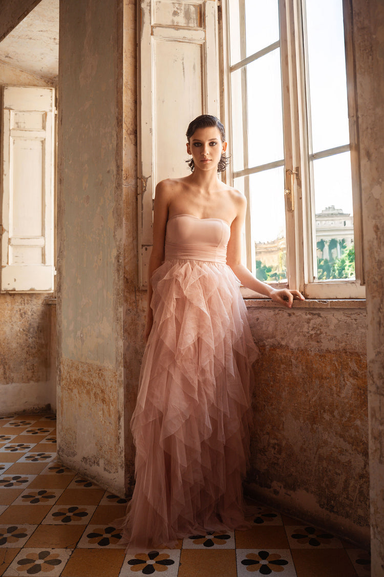 Abito lungo a bustier in tulle rosa pastello con corpetto aderente elasticizzato a punto smock sul retro e gonna svasata impreziosita da volants a balze.