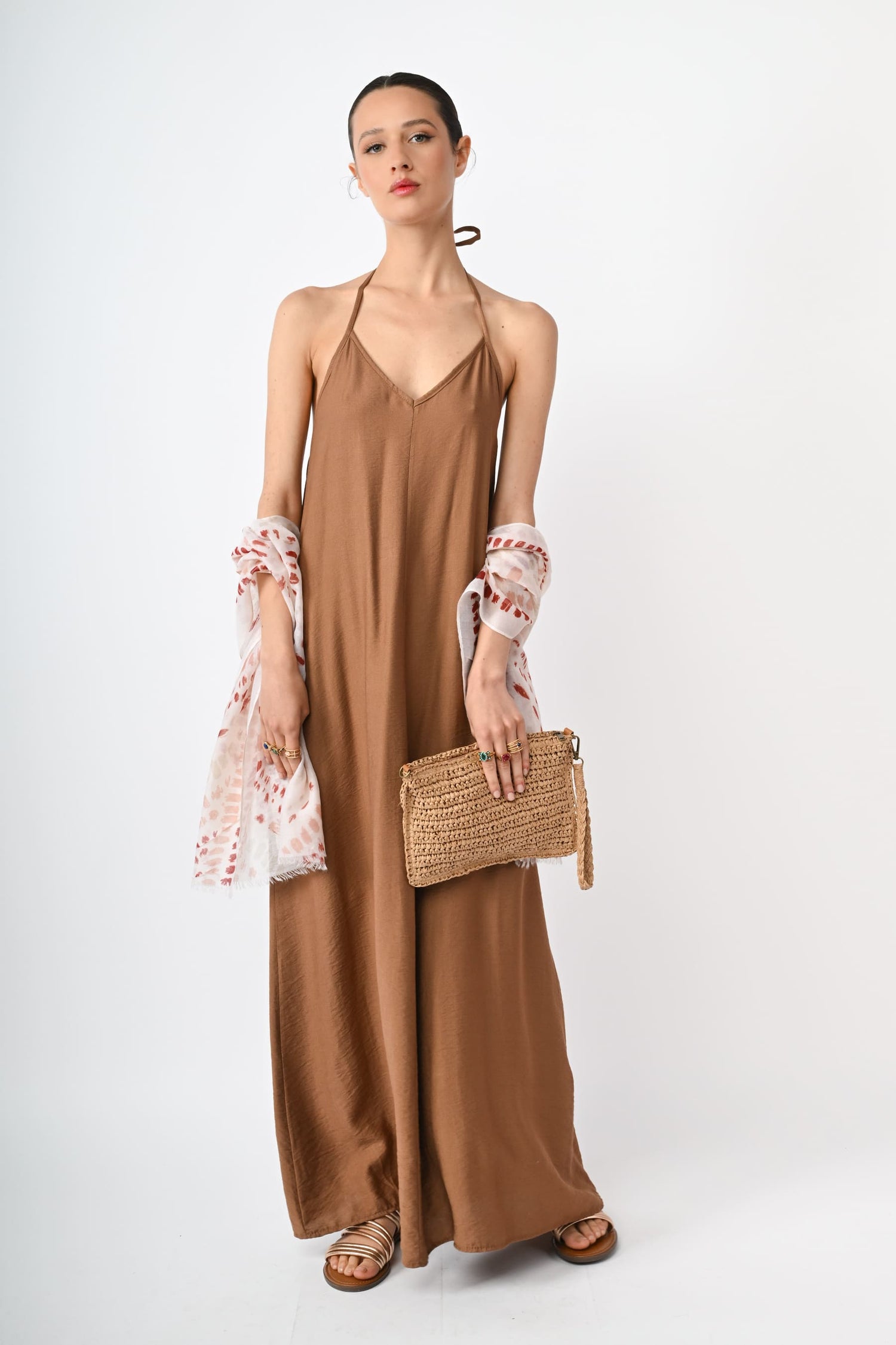 Abito lungo all'americana misto viscosa e nylon marrone chiaro con ampio scollo a V, laccetti da annodare sul retro del collo e silhouette ampia e morbida.