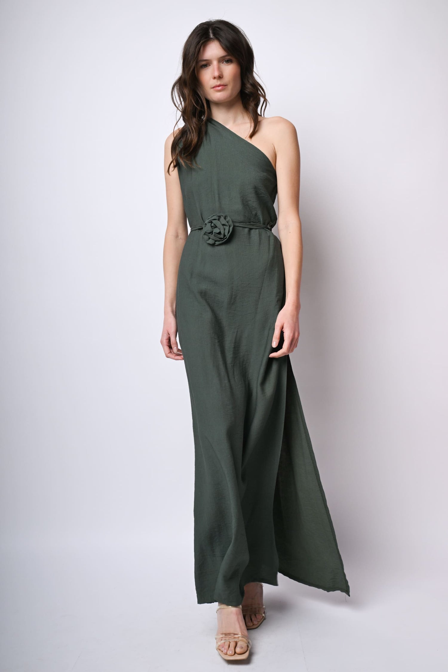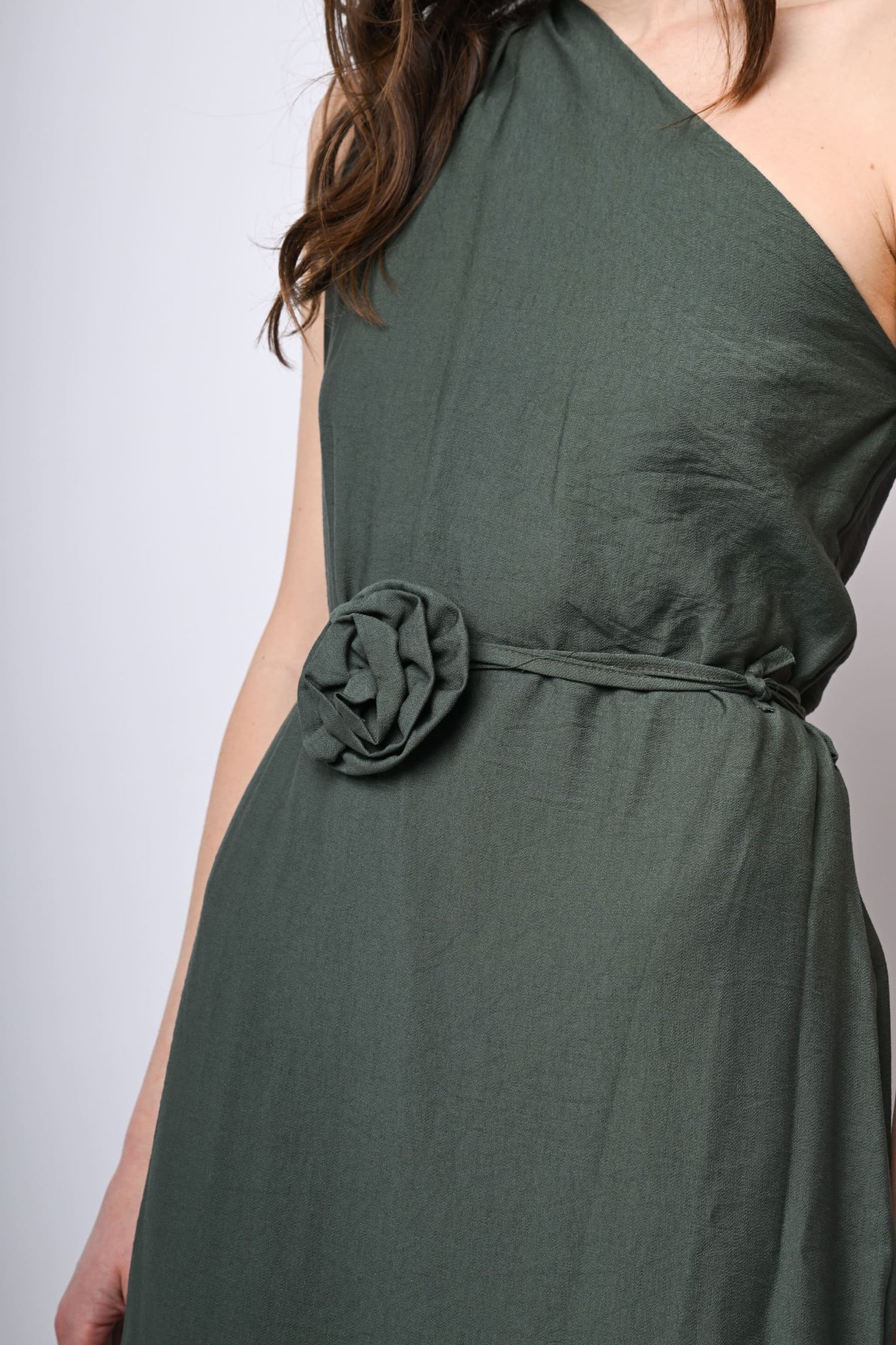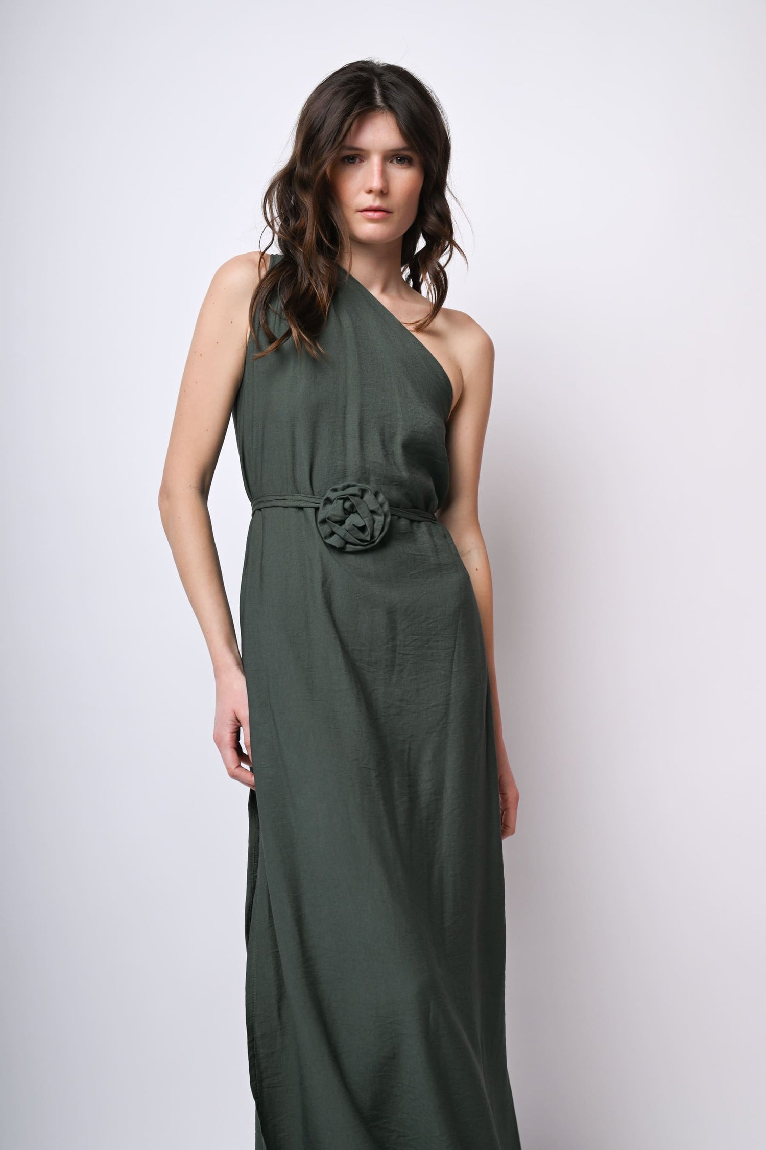 Abito lungo monospalla in viscosa fiammata verde militare con cintura sottile alla vita impreziosita da rosa 3D in tessuto e spacco laterale.