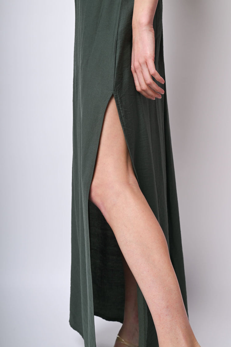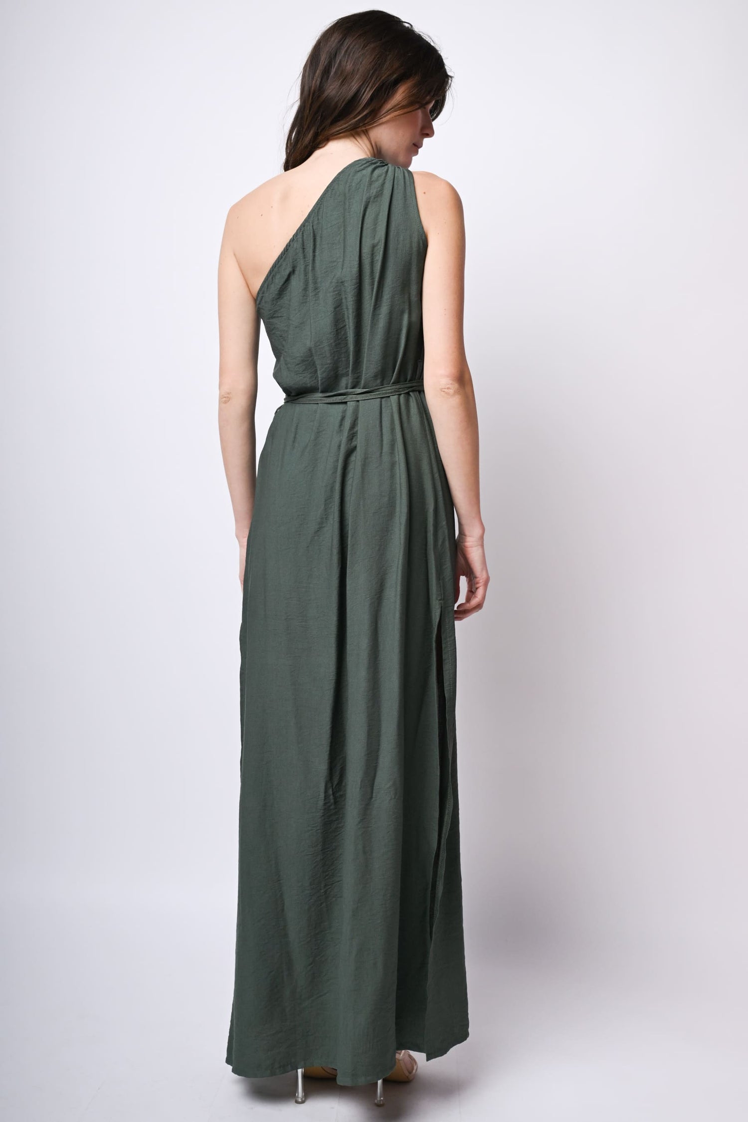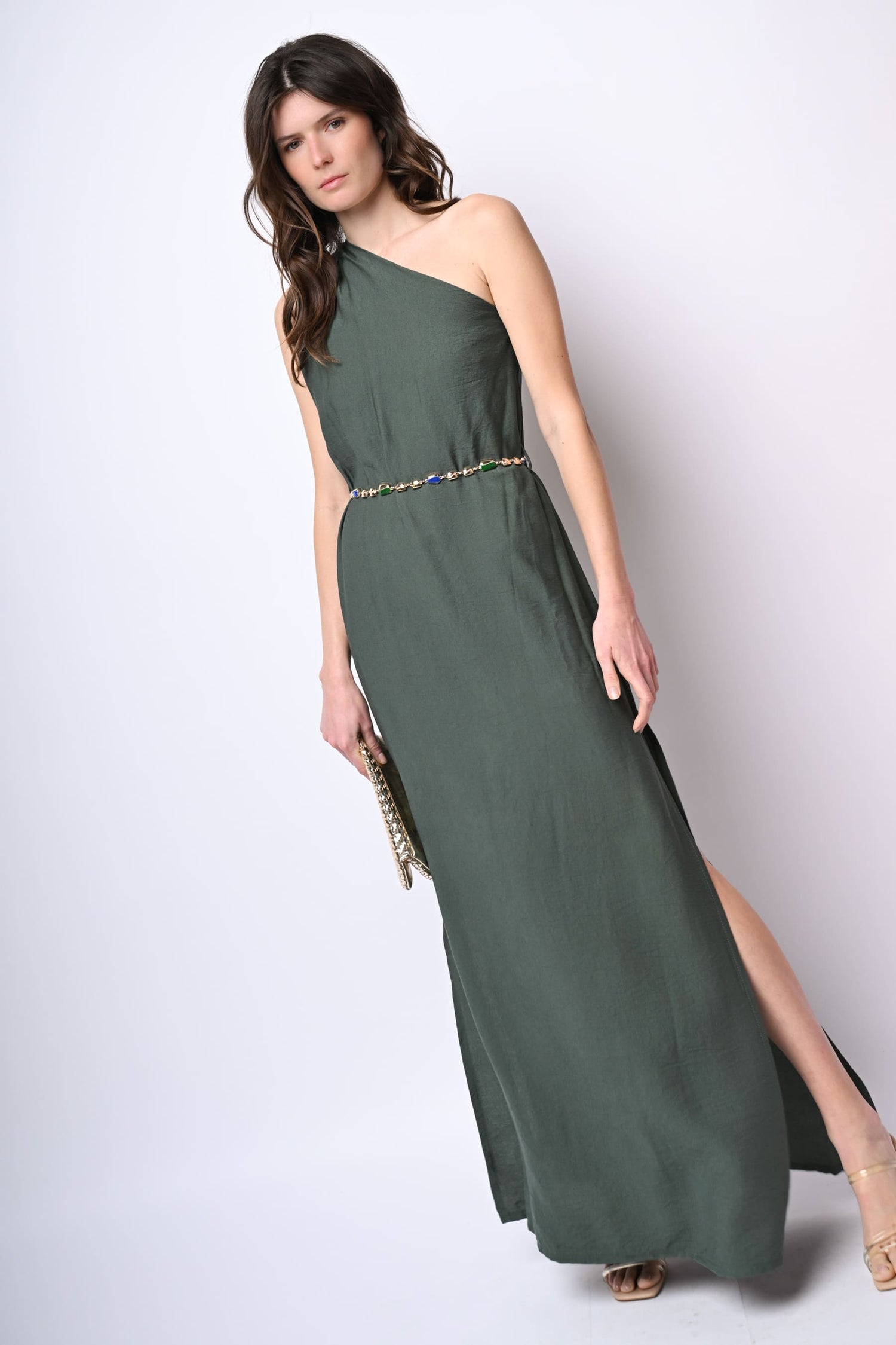 Abito lungo monospalla in viscosa fiammata verde militare con cintura sottile alla vita impreziosita da rosa 3D in tessuto e spacco laterale.
