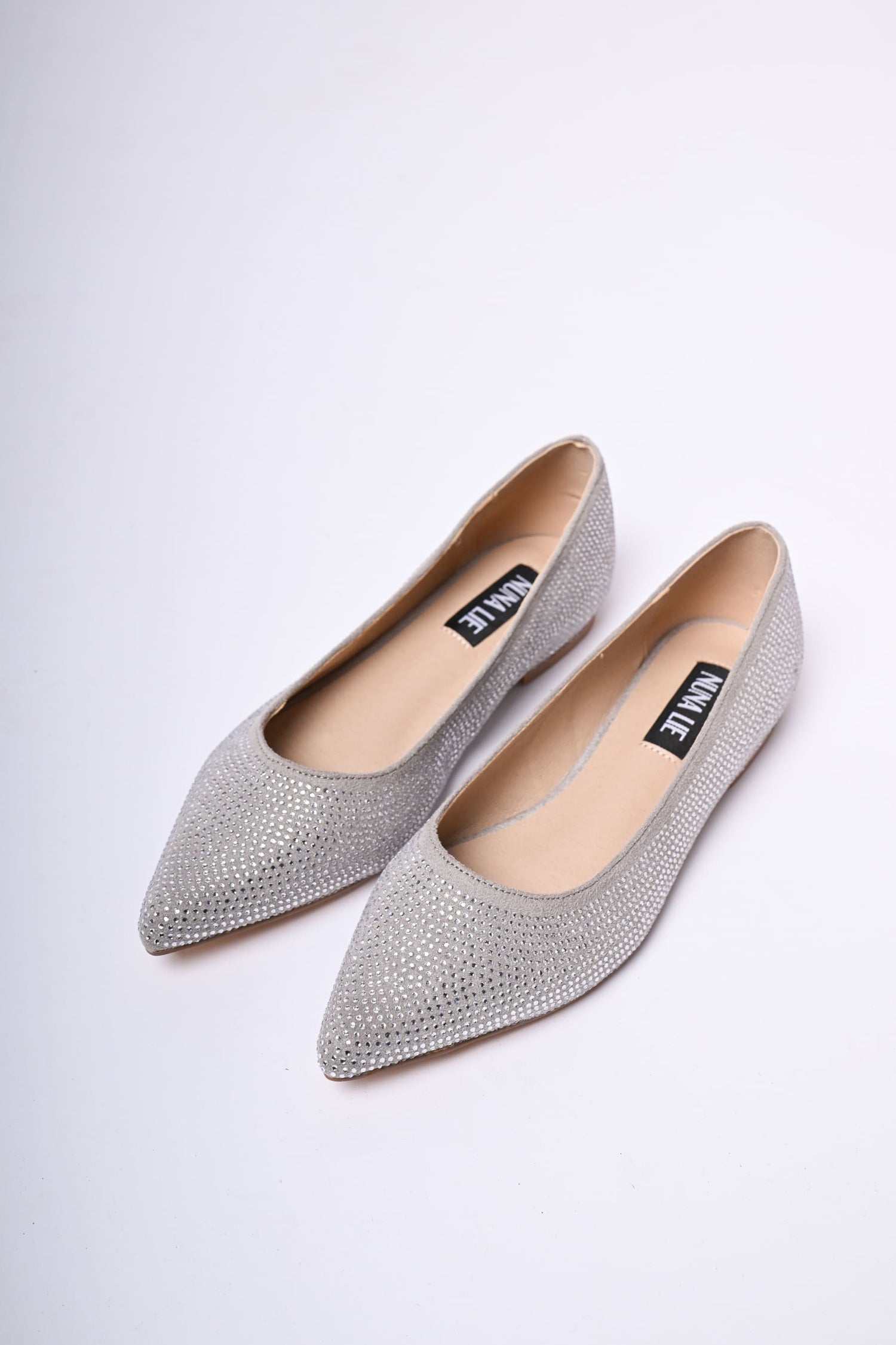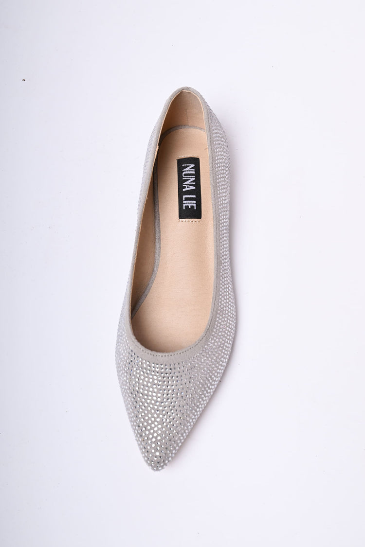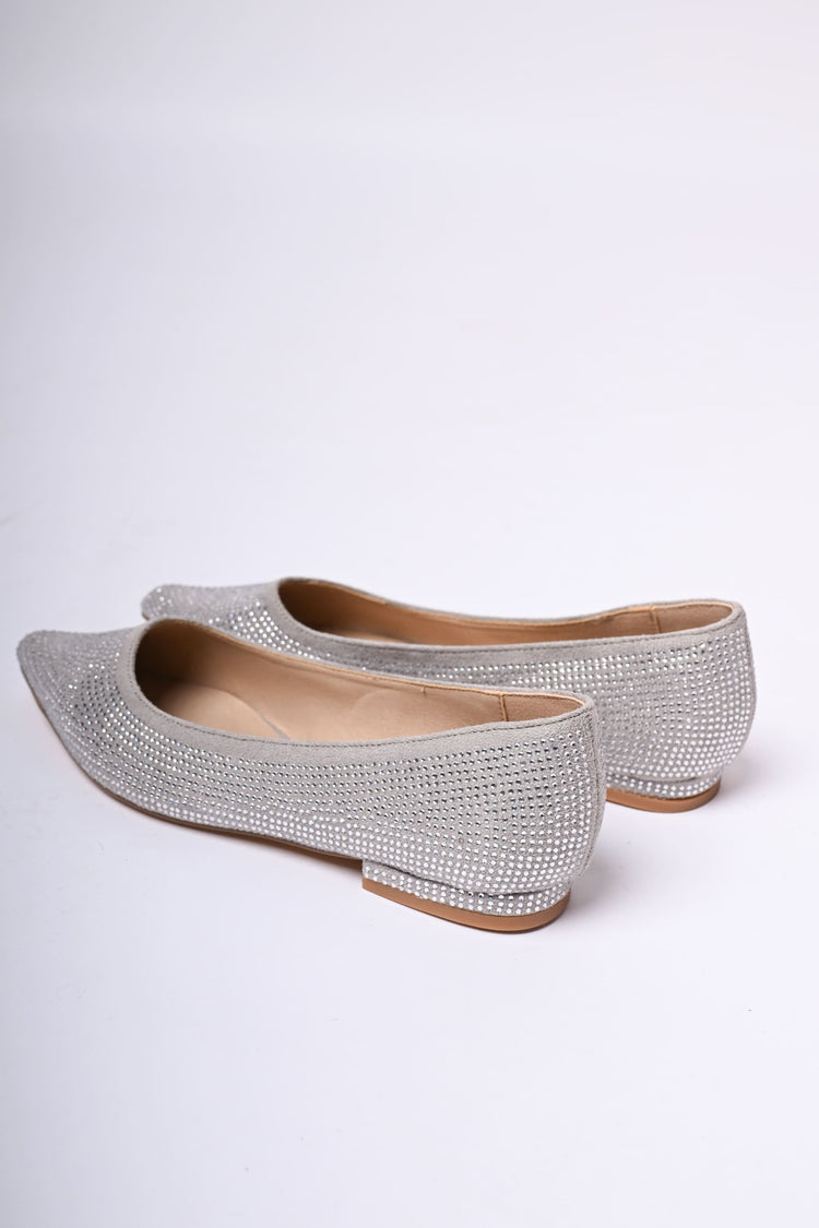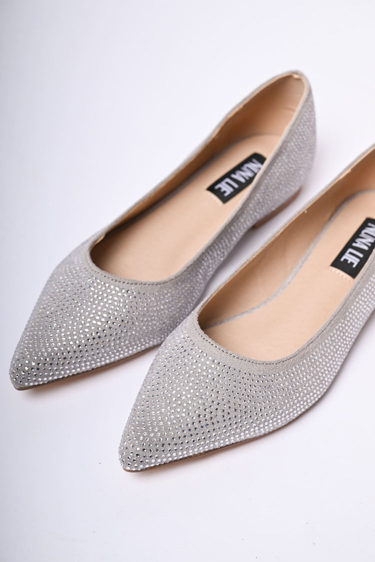 Ballerine in similpelle scamosciata grigio argento impreziosite da strass all-over, con punta affusolata e tacco basso.