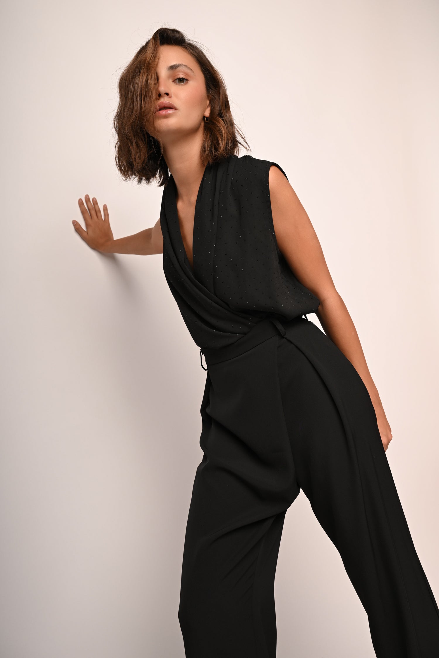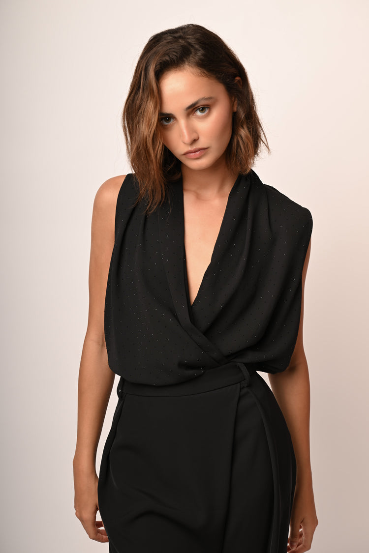 Body in tessuto nero con scollo a V incrociato e drappeggiato, mini borchie decorative sul davanti e taglio smanicato.