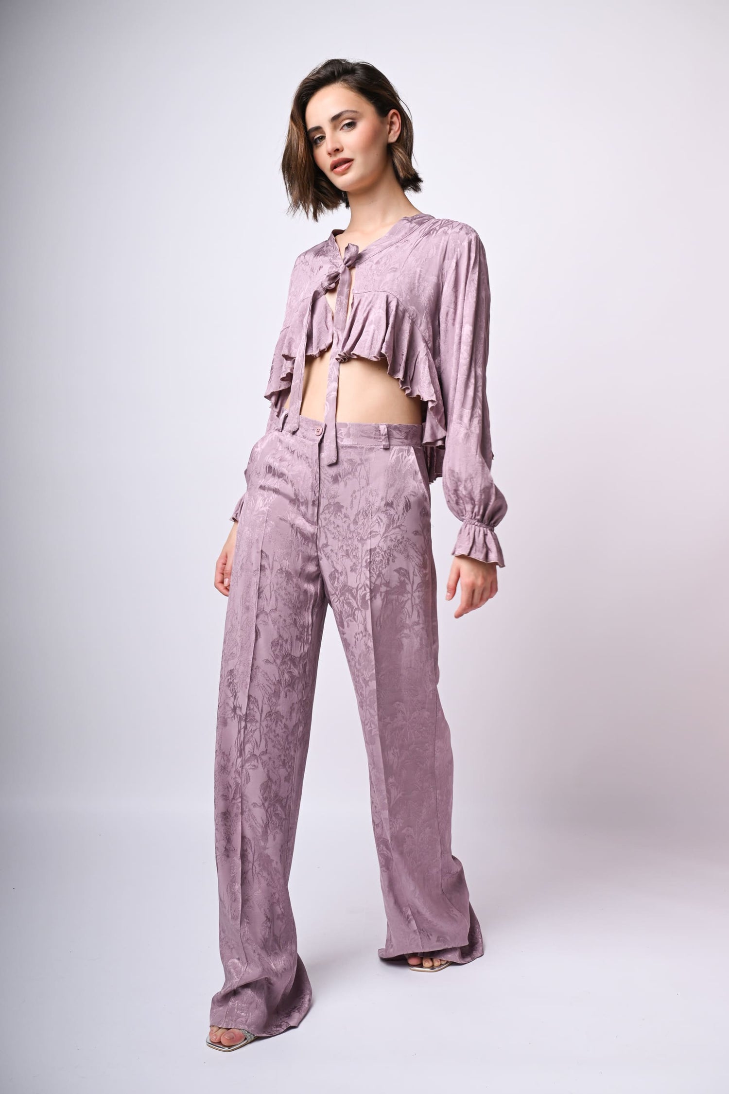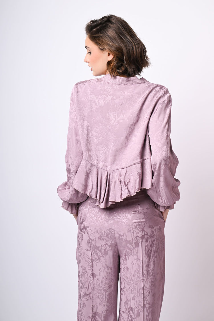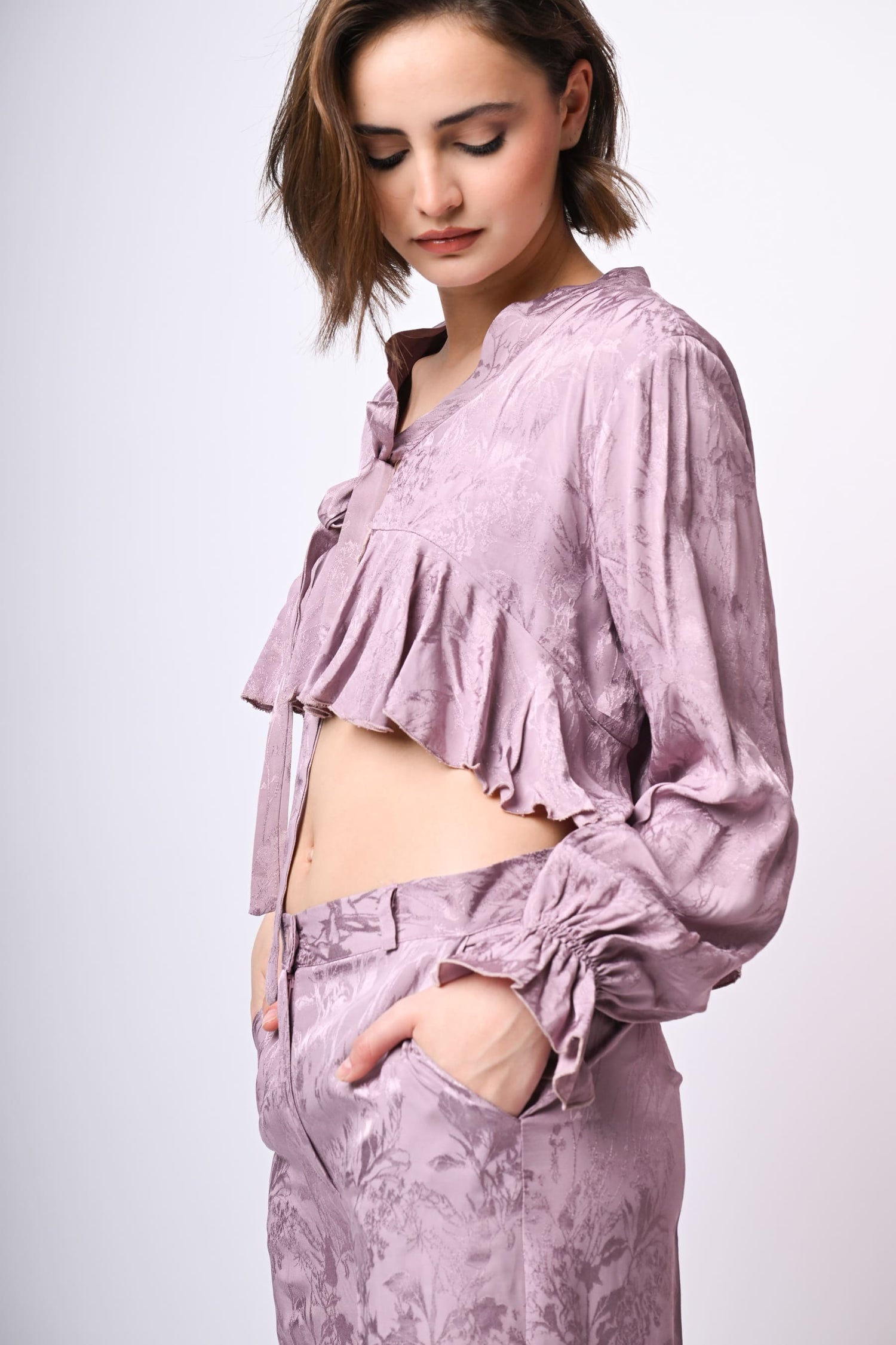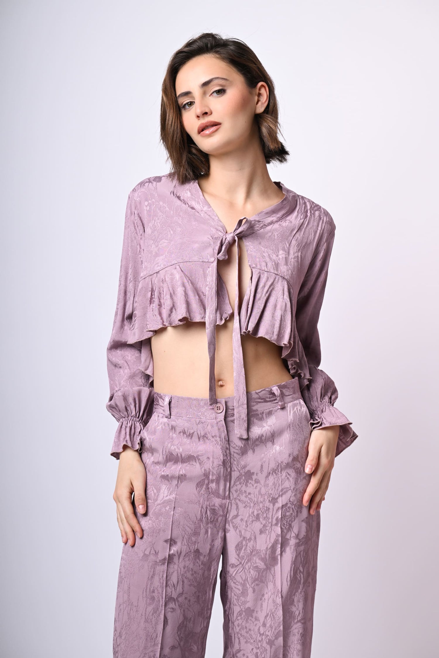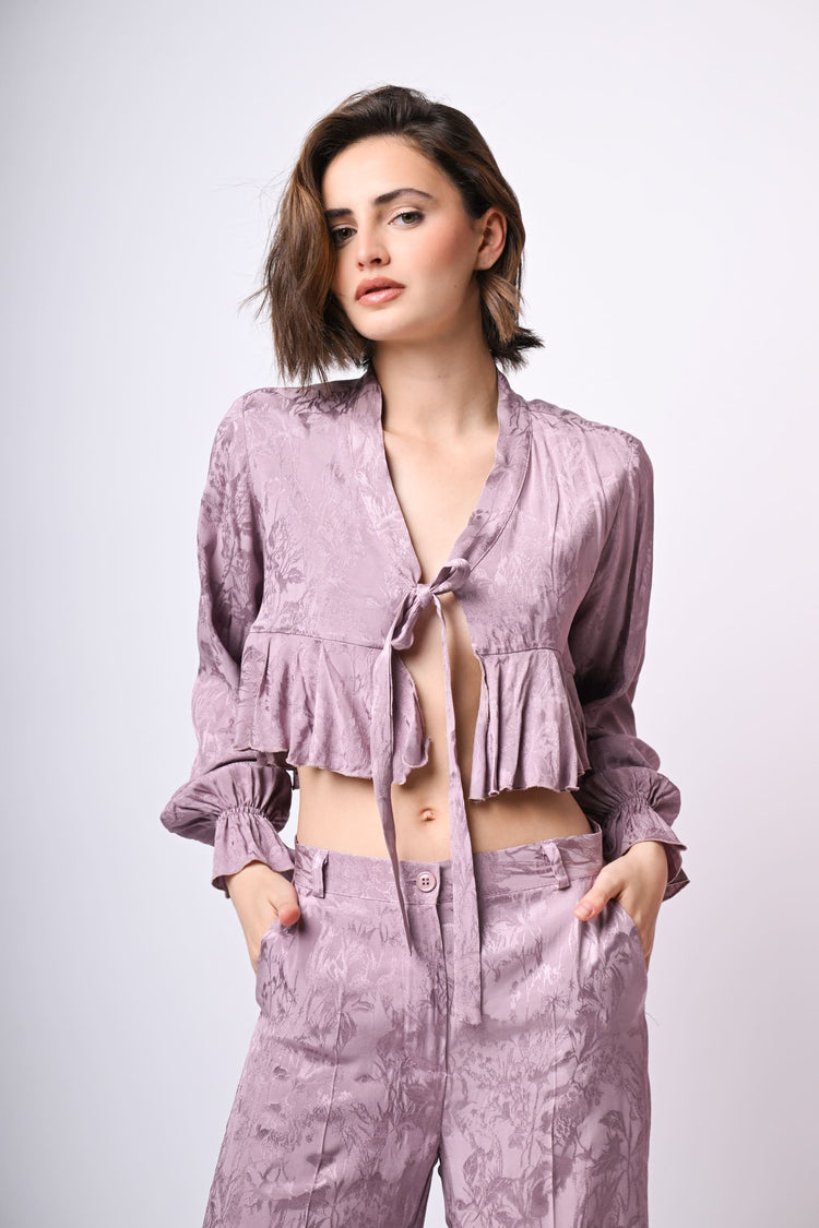Top crop in jacquard di viscosa a motivo floreale nei toni del lilla con scollo a V, nastrini da annodare sul davanti, volant lungo il bordo, maniche lunghe a palloncino con polsini elasticizzati e volants.