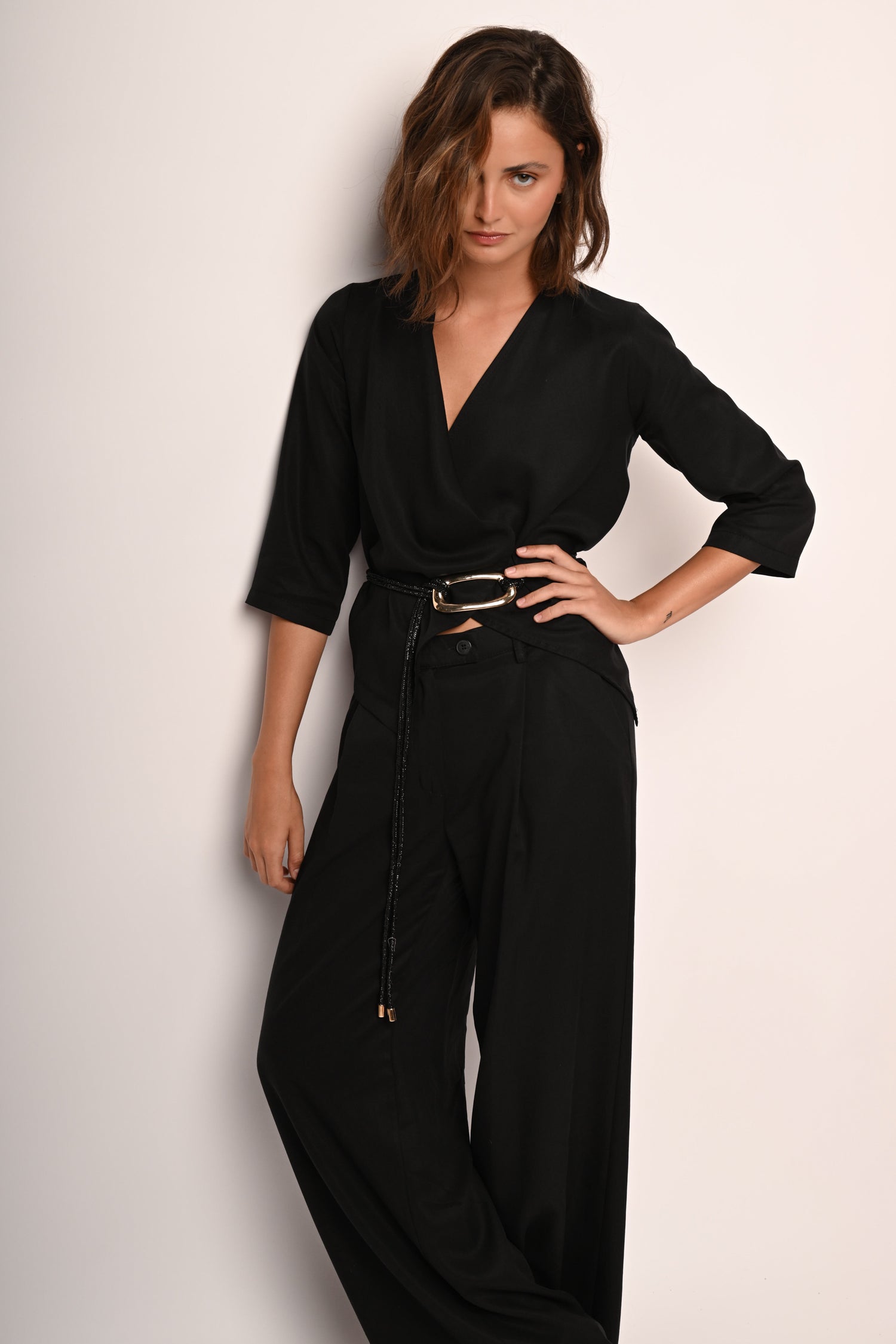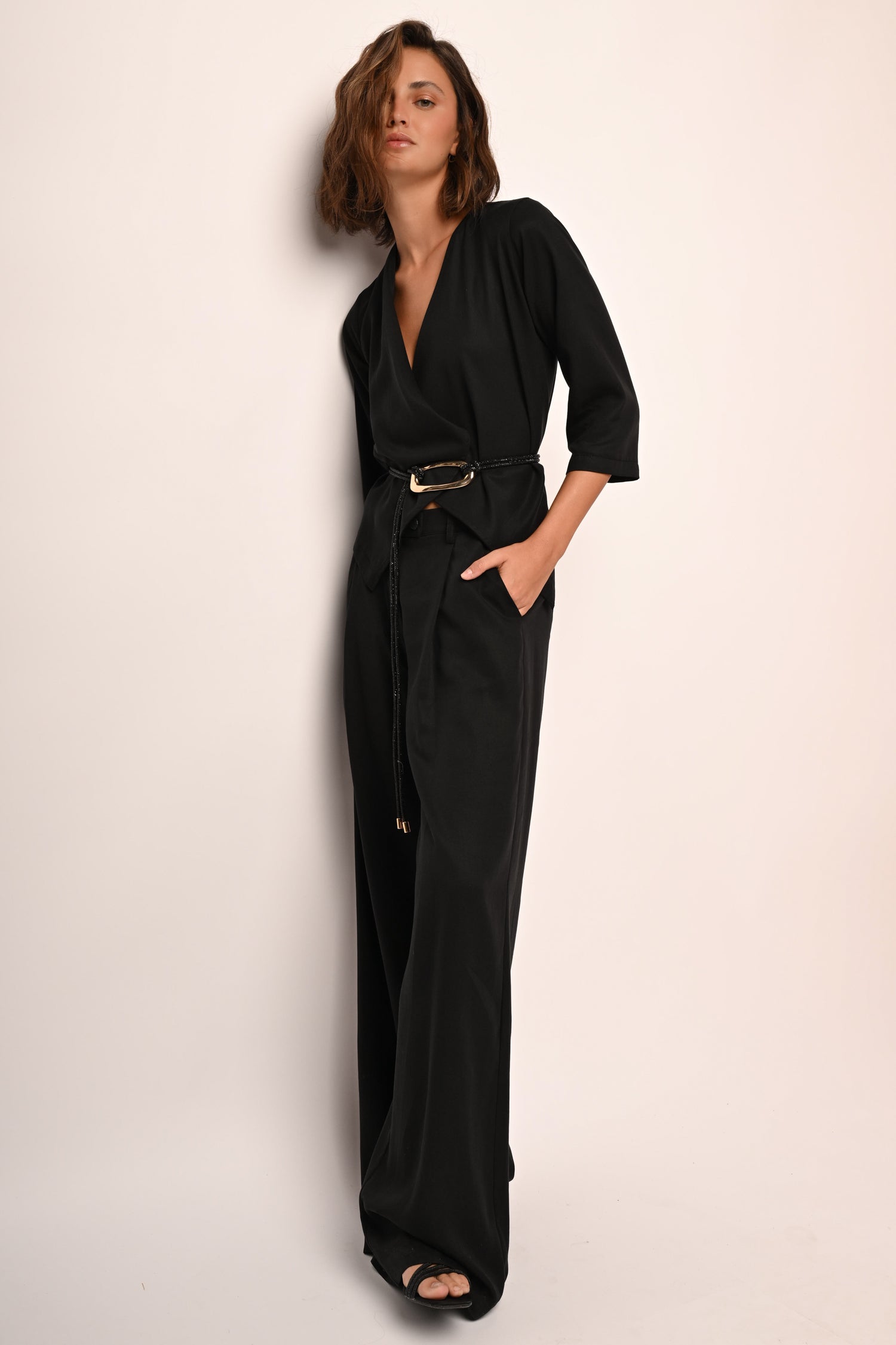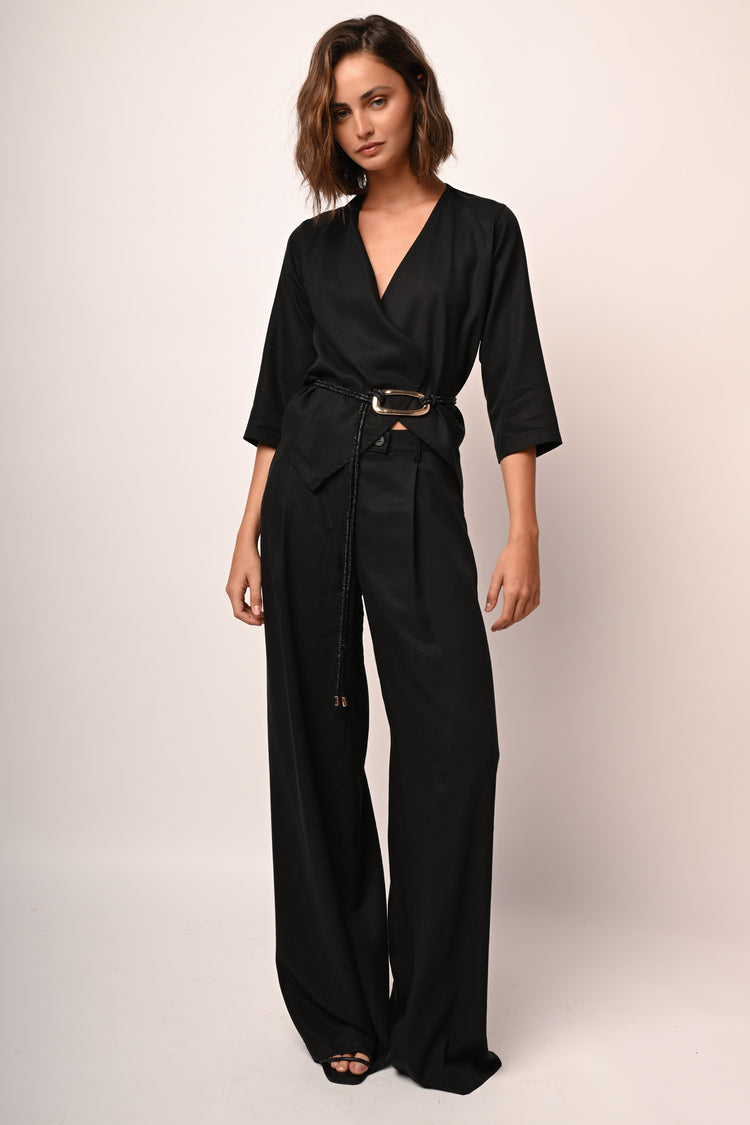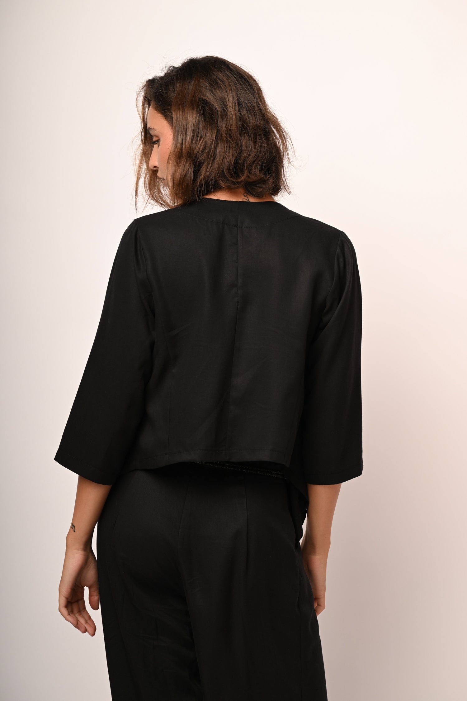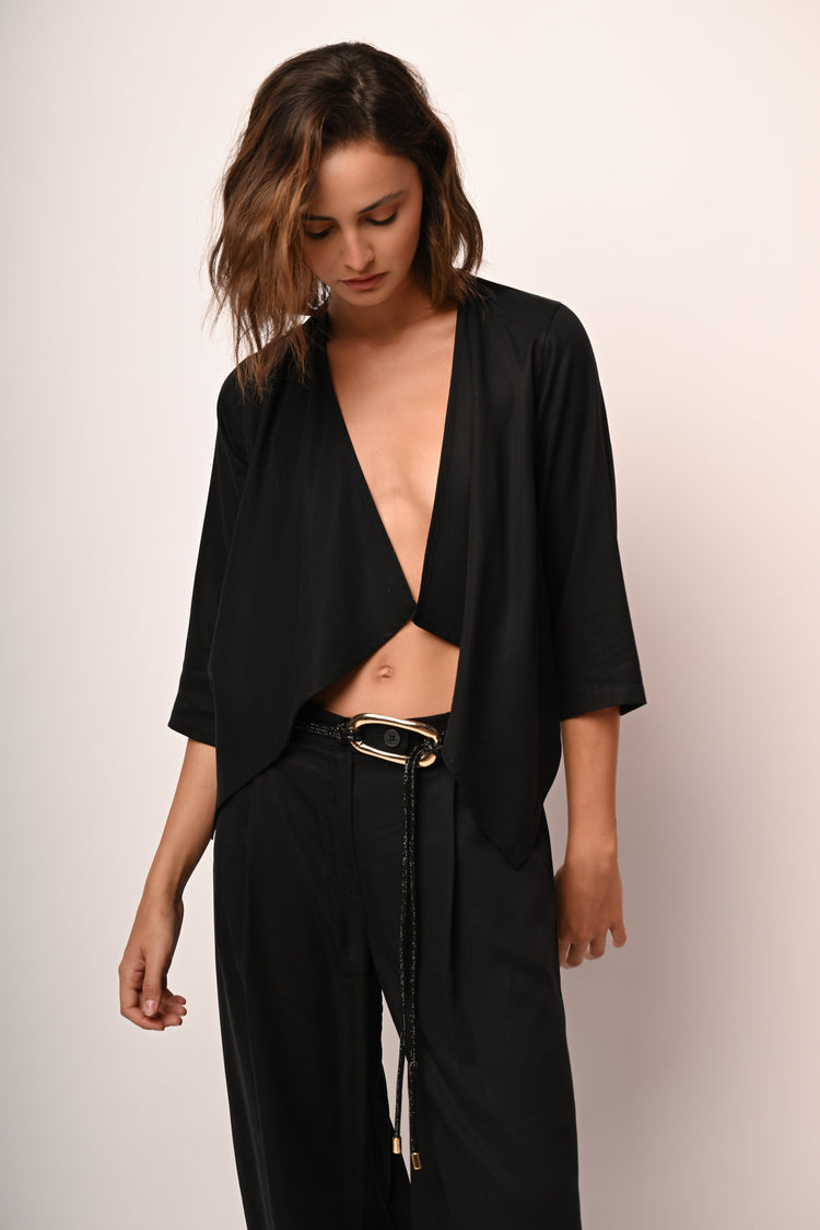 Giacca corta in lyocell nero con taglio aperto, revers a punta morbidi e fluenti, maniche tre quarti.