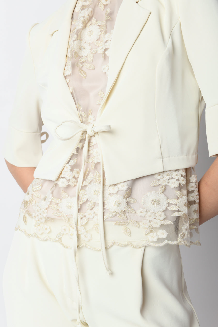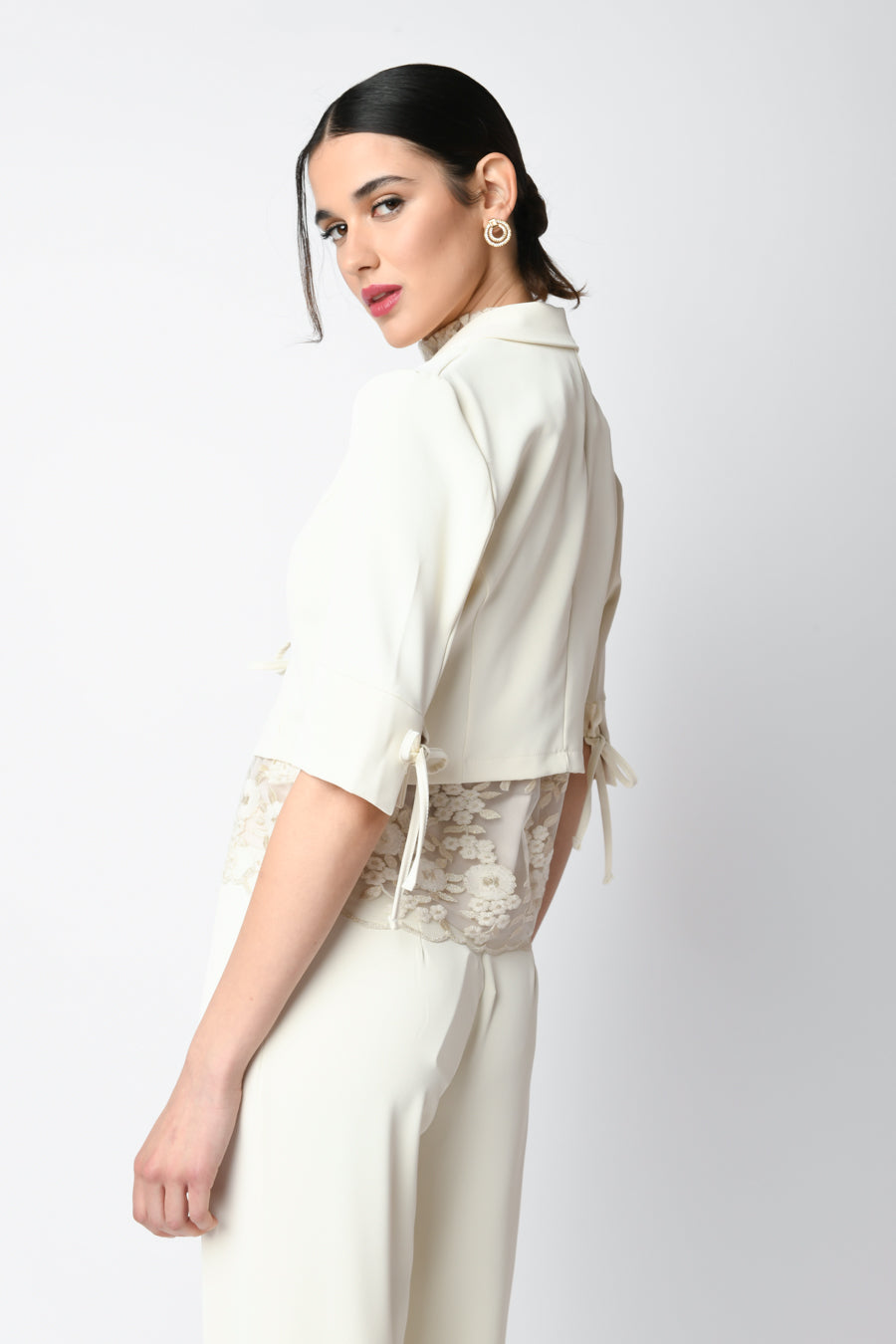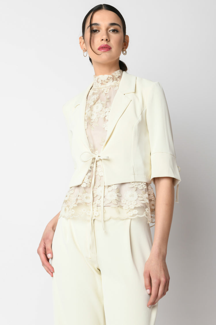 Blazer crop in tessuto stretch avorio con revers classici, laccetti da annodare sul davanti e alle maniche tre quarti.