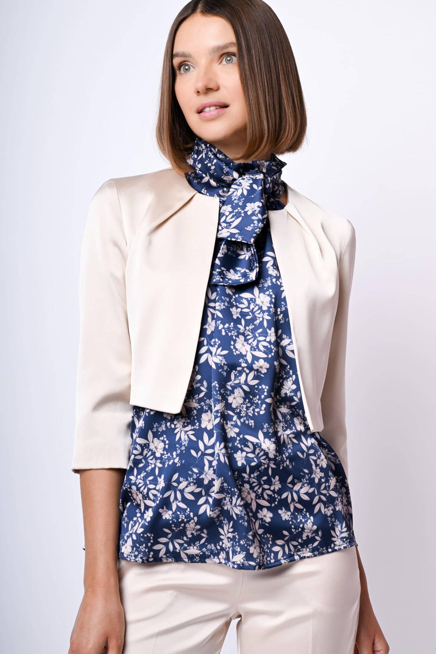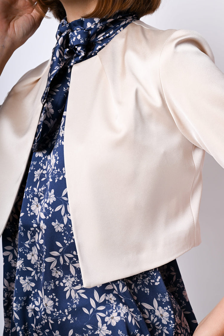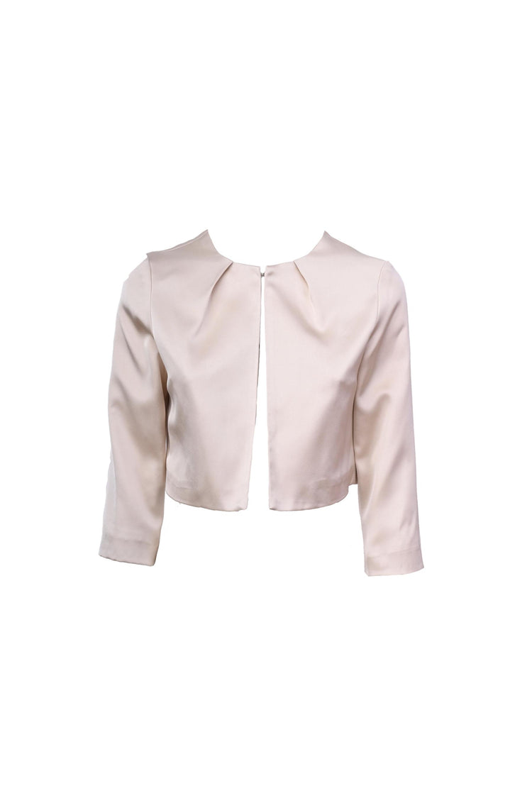 Bolero in raso stretch avorio con scollo tondo impreziosito da pieghe a raggiera, nessuna chiusura e maniche tre quarti.