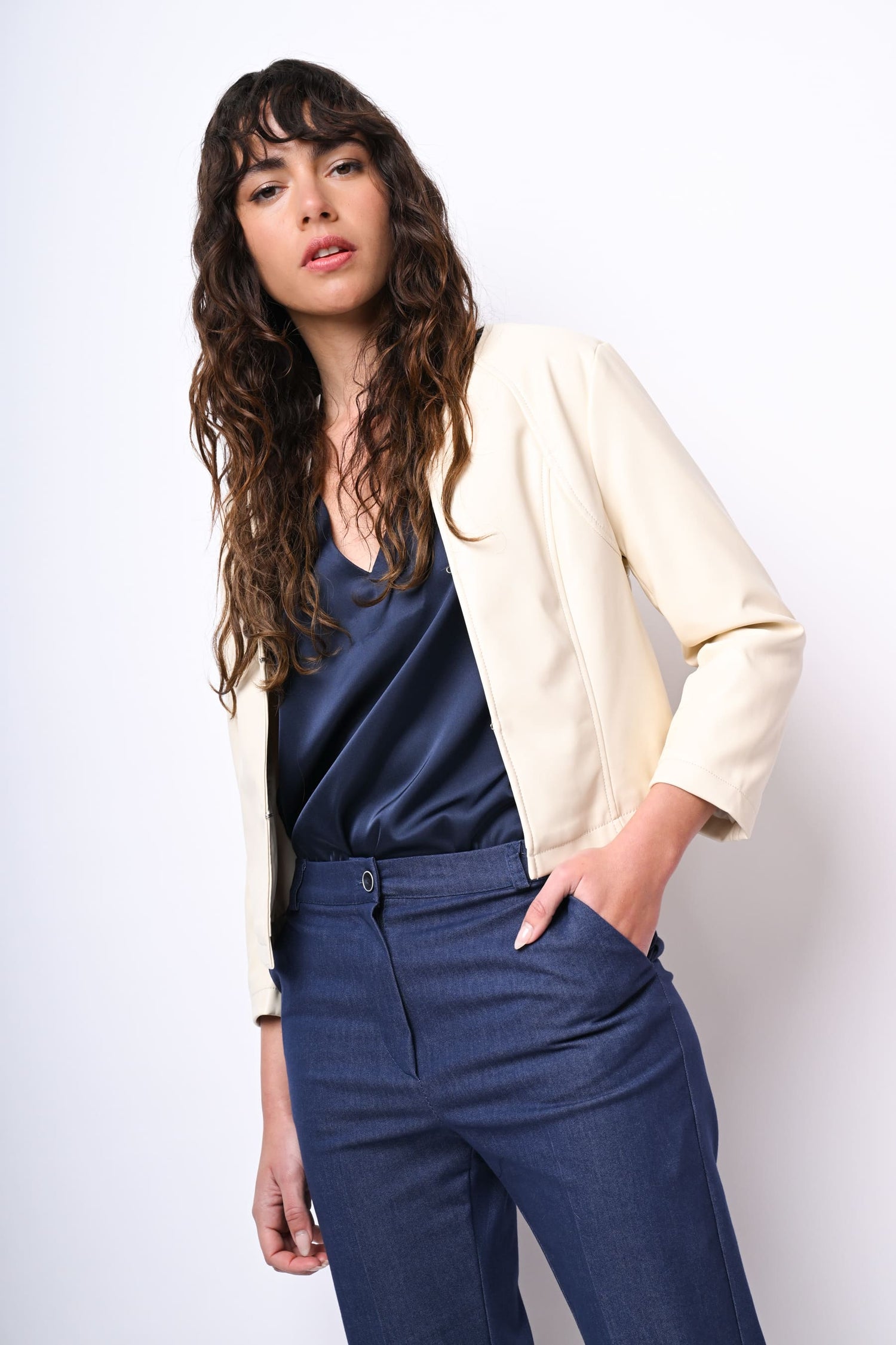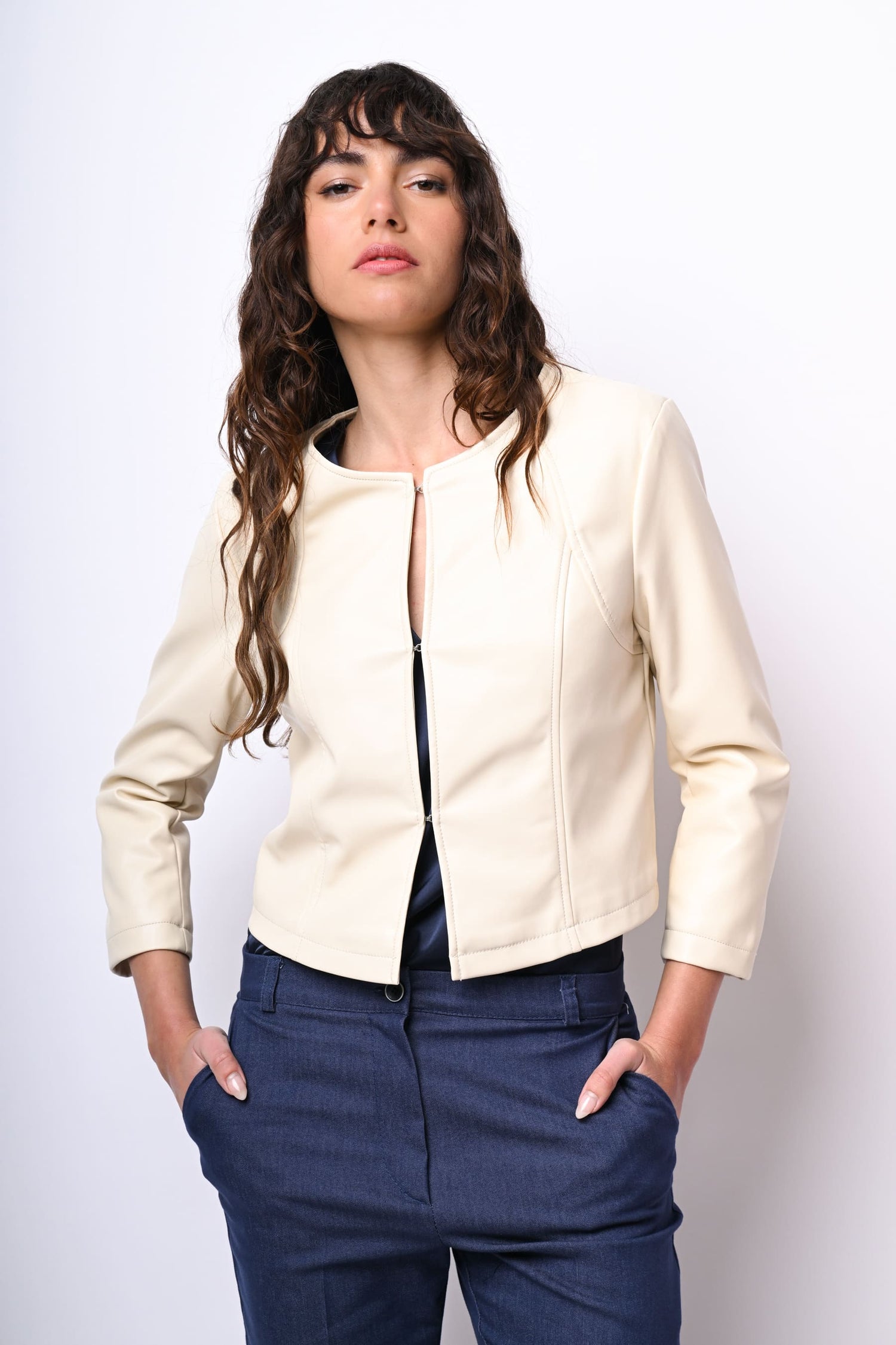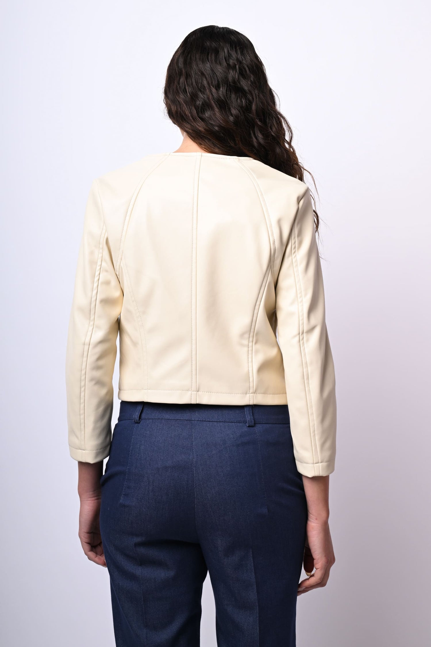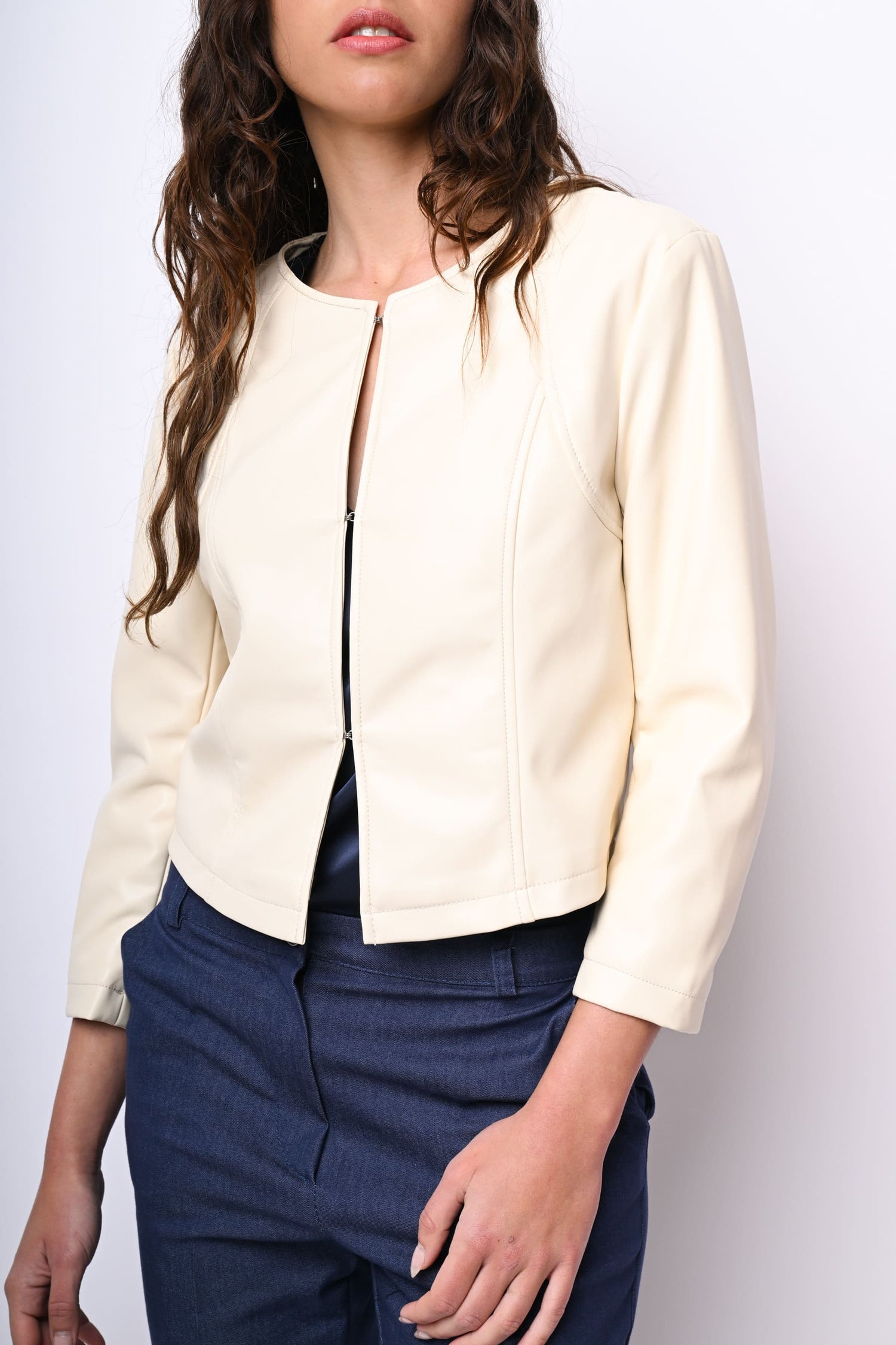 Giacca in similpelle bianca con scollo tondo, gancetti di chiusura frontali e maniche tre quarti.