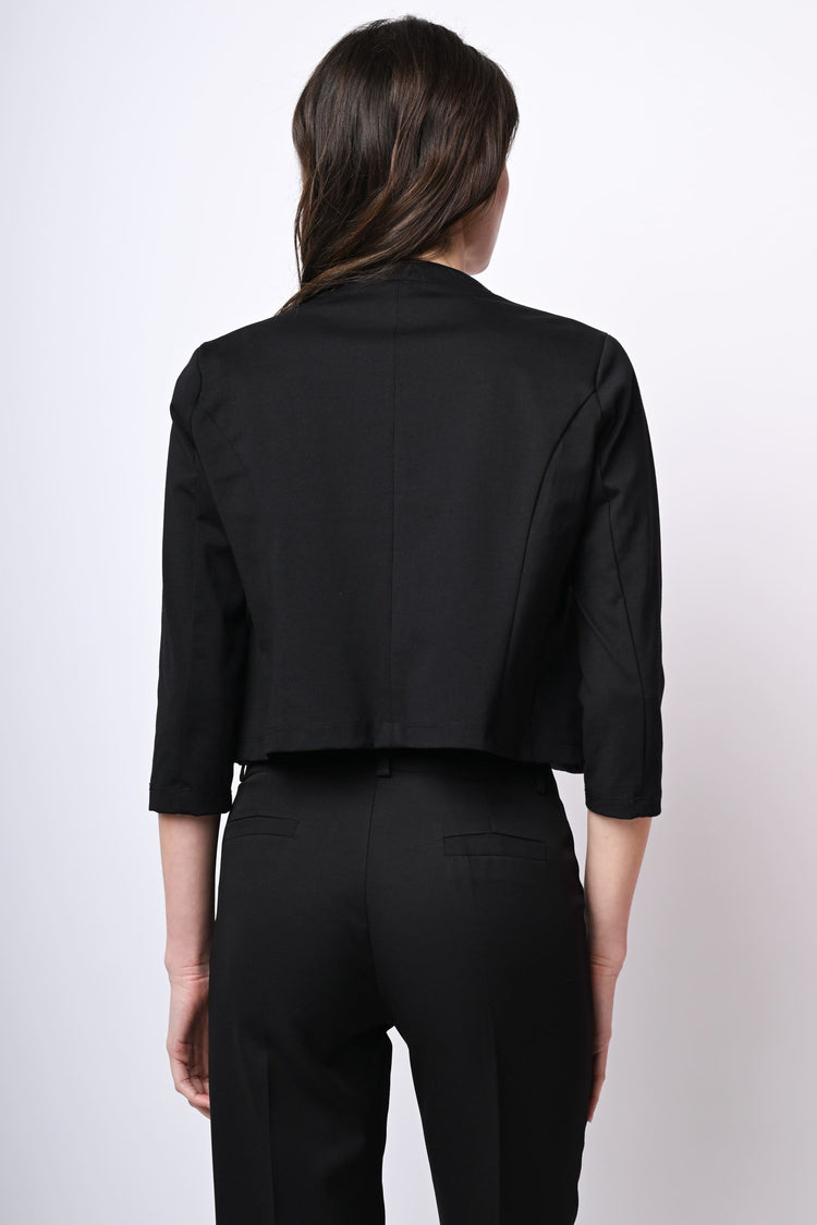 Bolero misto cotone e nylon stretch nero con revers piatti, spilla con rosa in tessuto 3D tono su tono e maniche tre quarti.