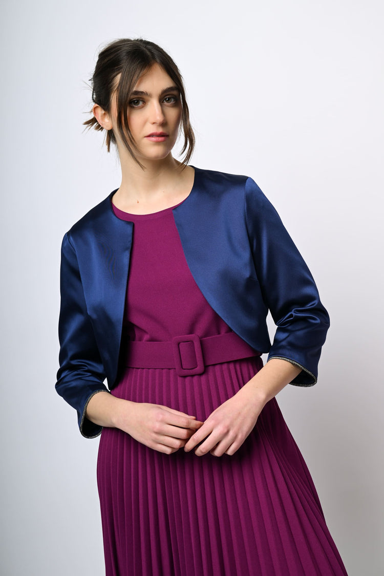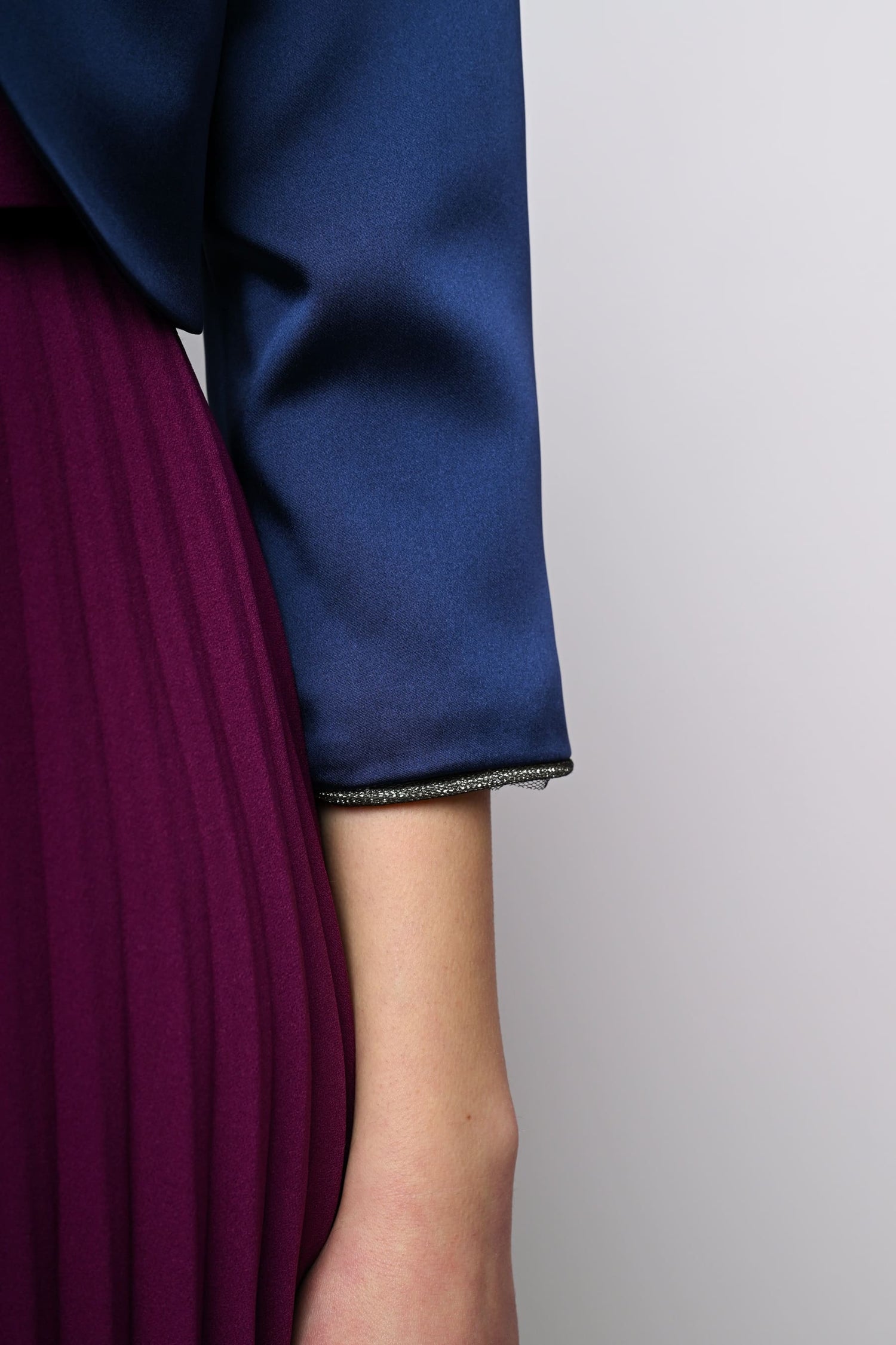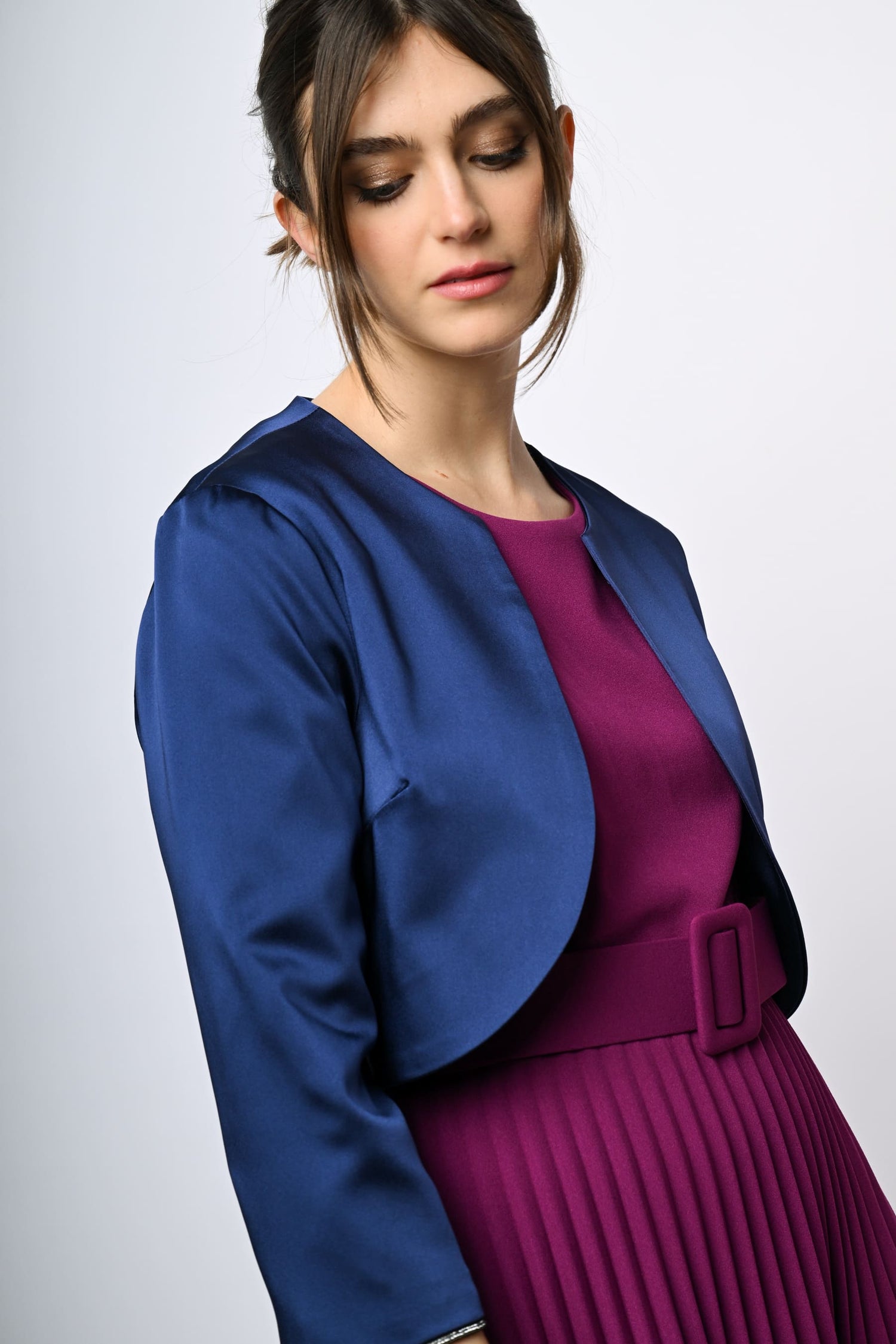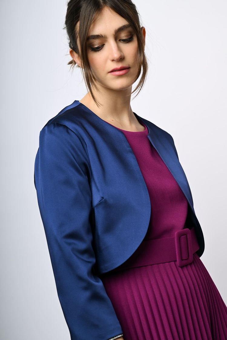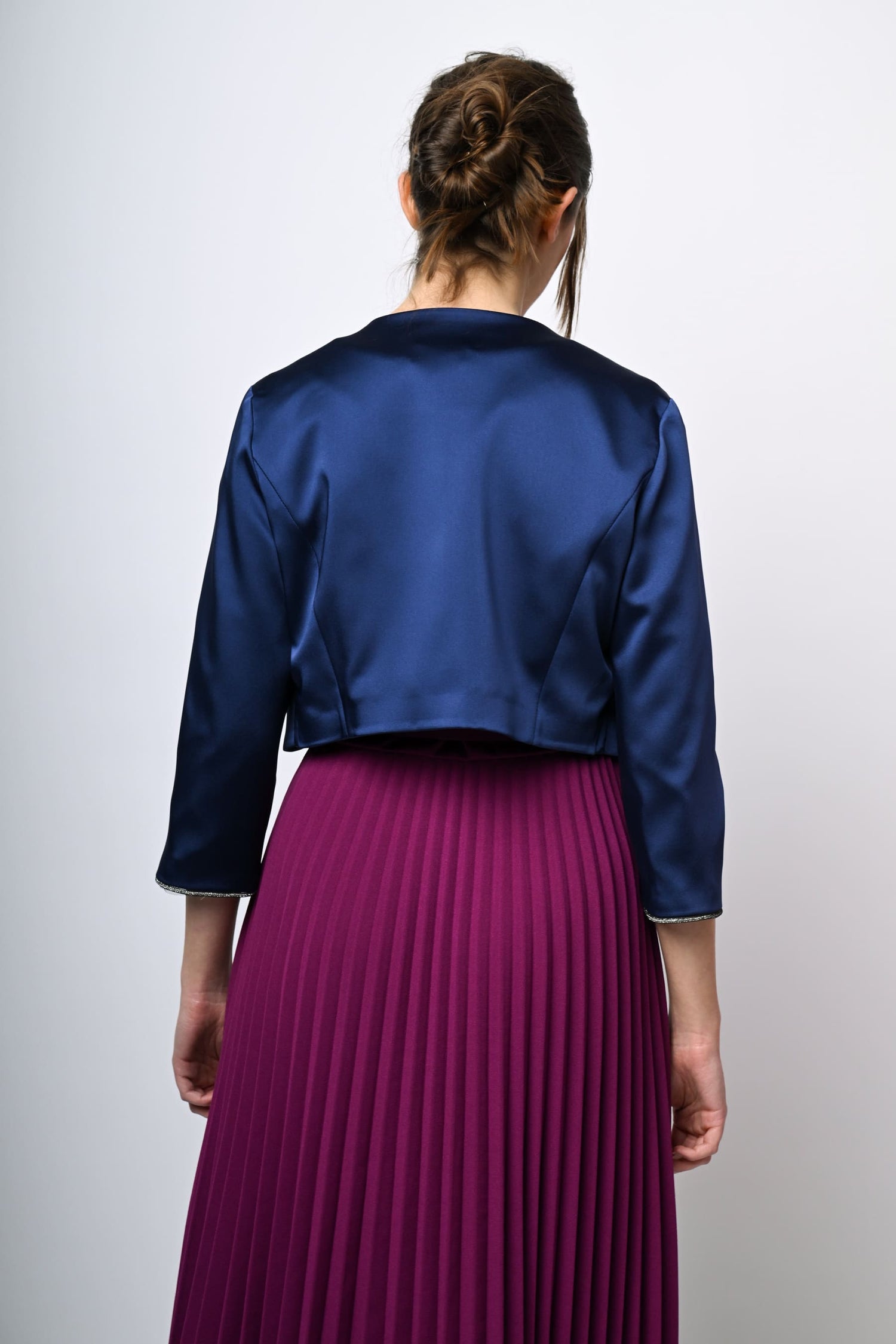 Bolero in raso blu con scollo e revers stondati, nessuna chiusura e maniche tre quarti con profili in lurex.