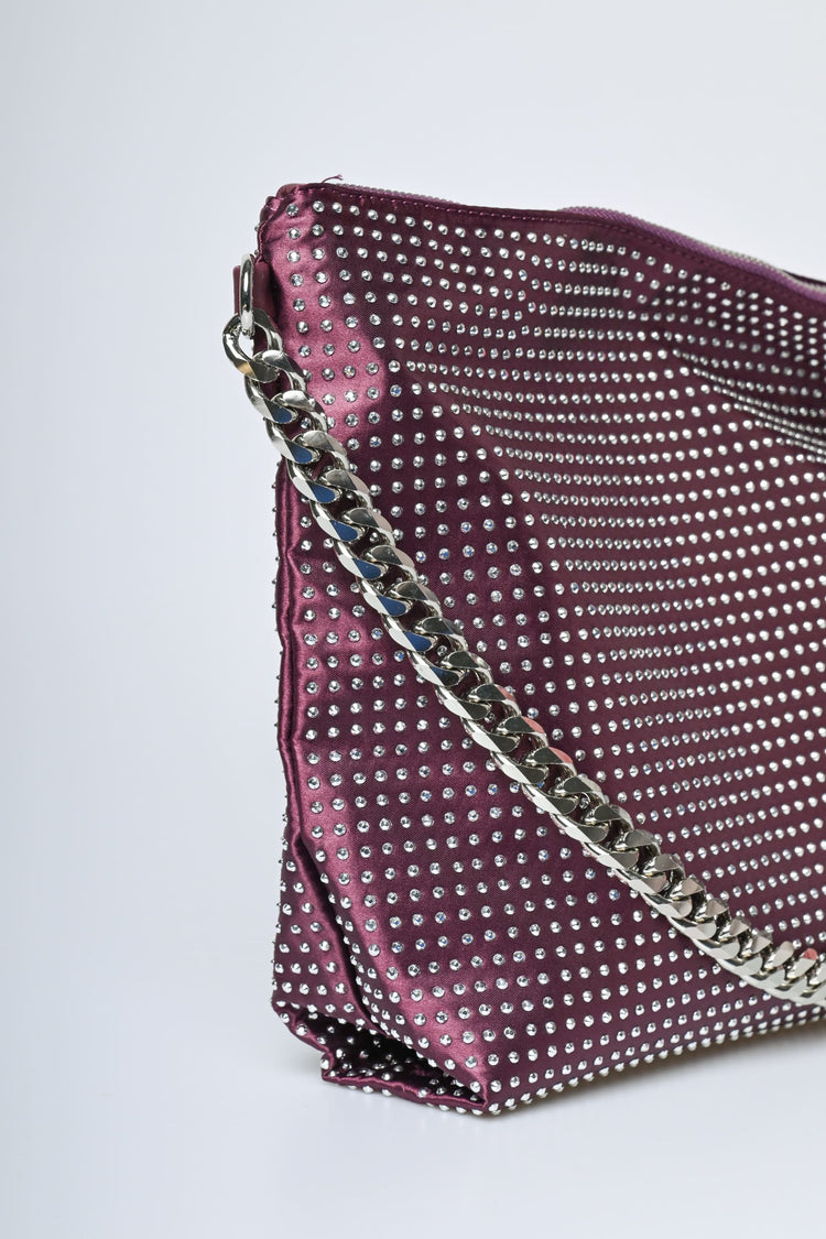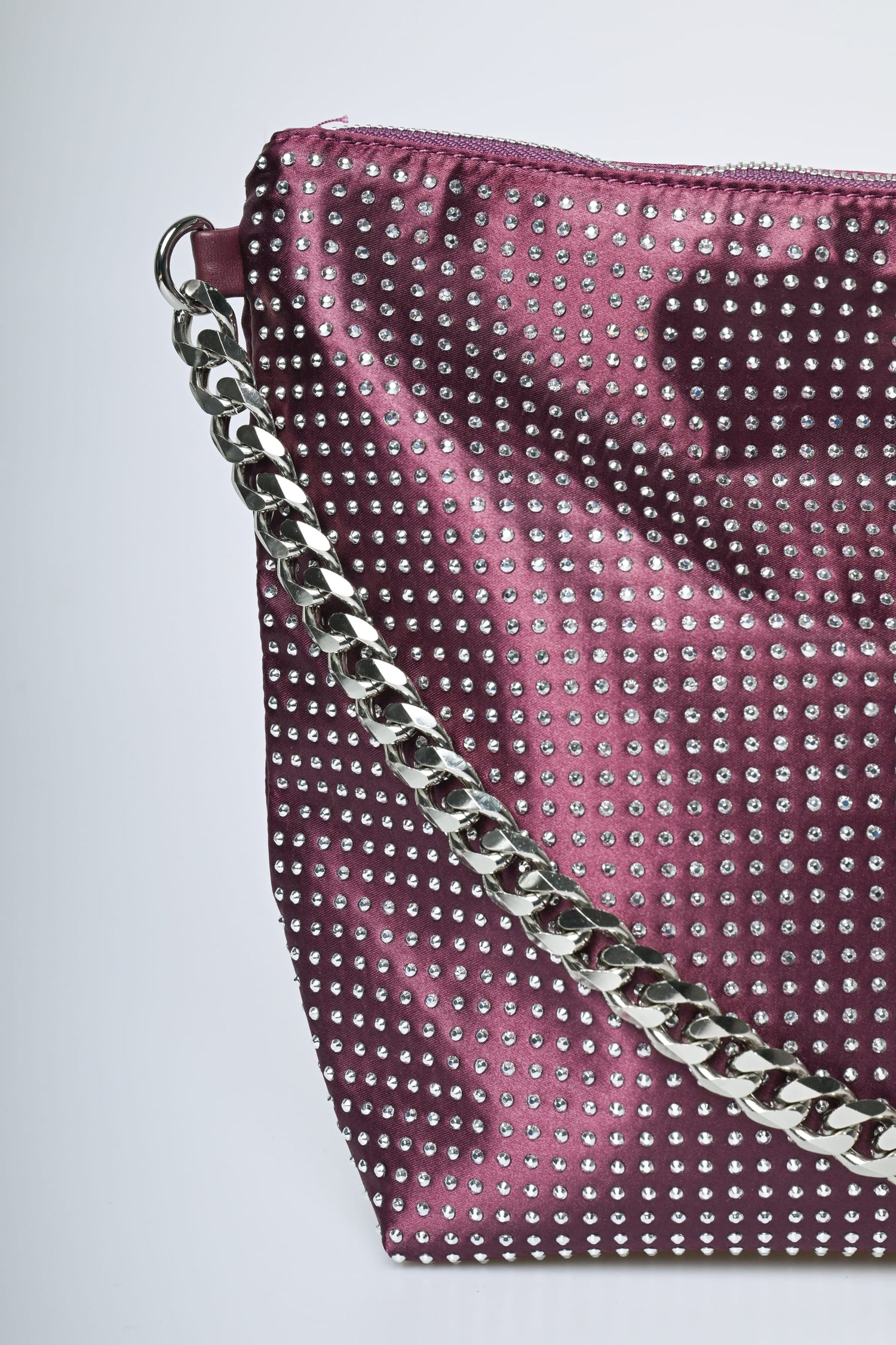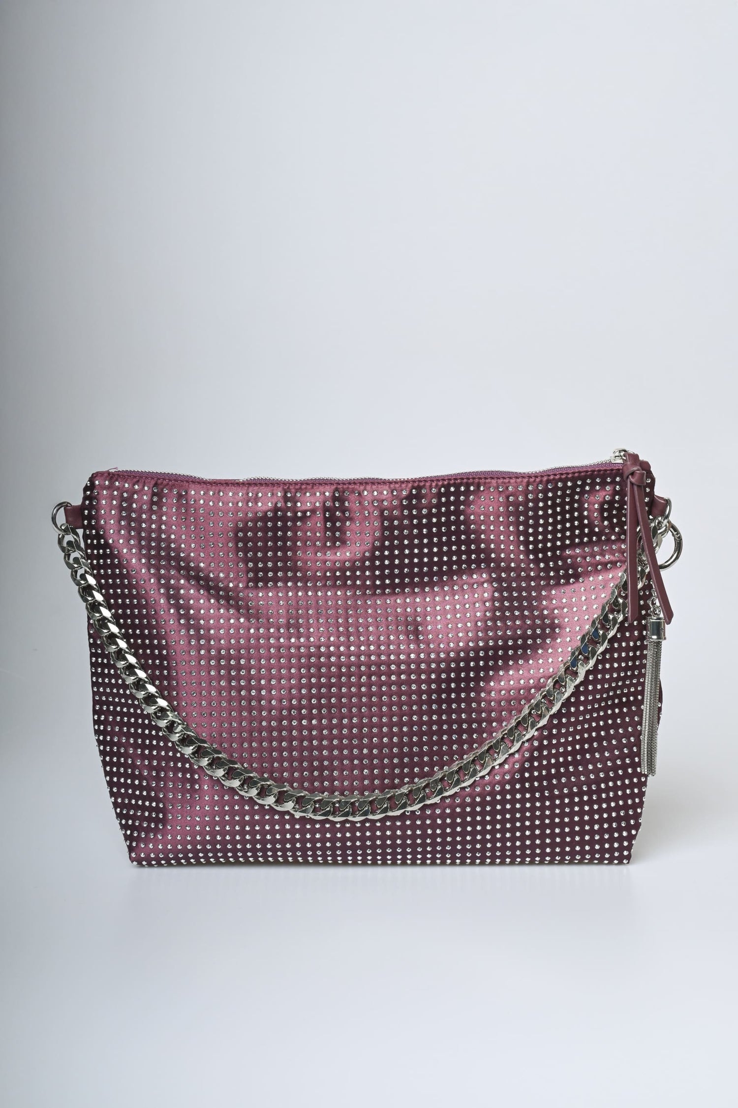 Borsa a spalla in raso bordeaux impreziosita da mini borchie all-over, manico a catenella, chiusura con zip, charm portachiavi laterale e hardware in metallo argentato.