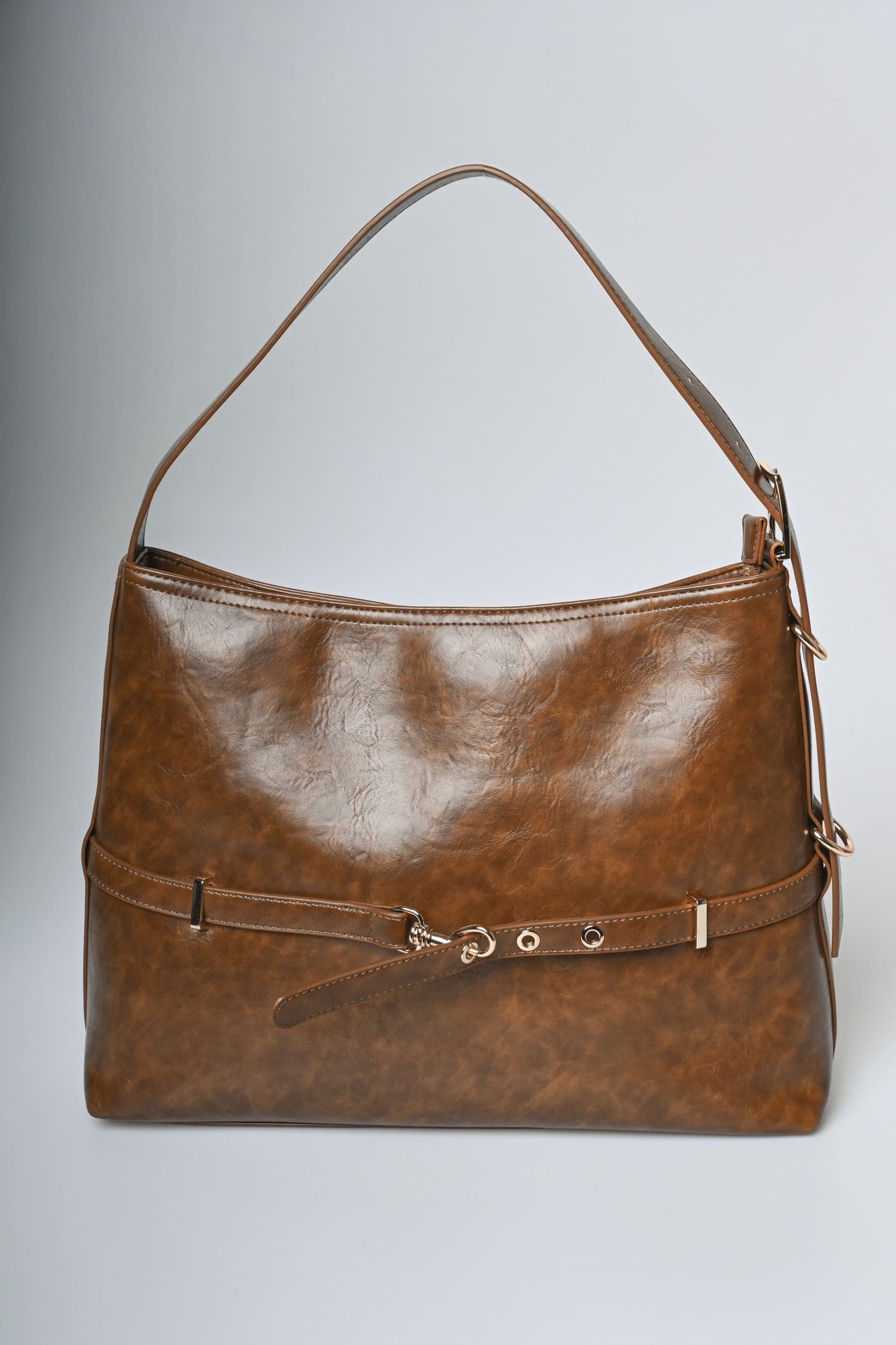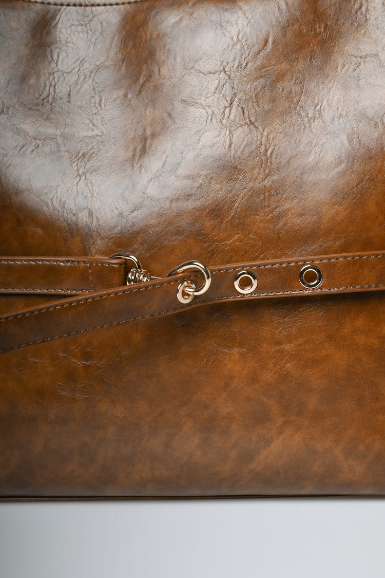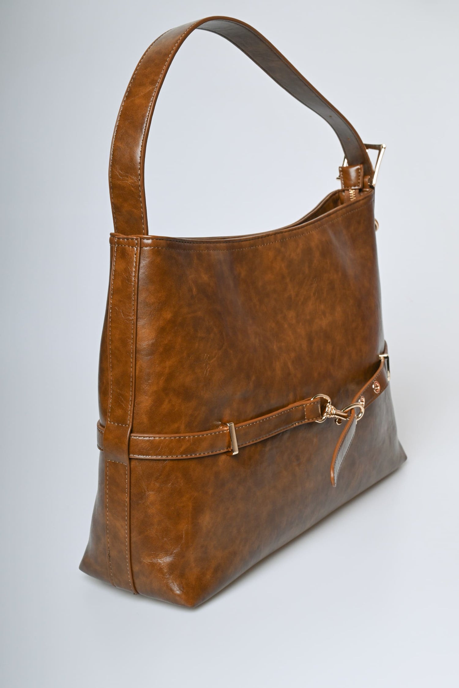 Borsa a spalla in similpelle marrone con manico superiore regolabile, chiusura con zip, cinturino orizzontale regolabile con moschettone e hardware in metallo dorato.