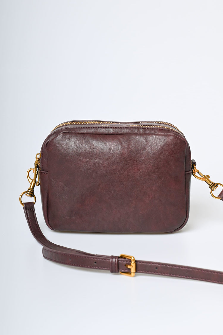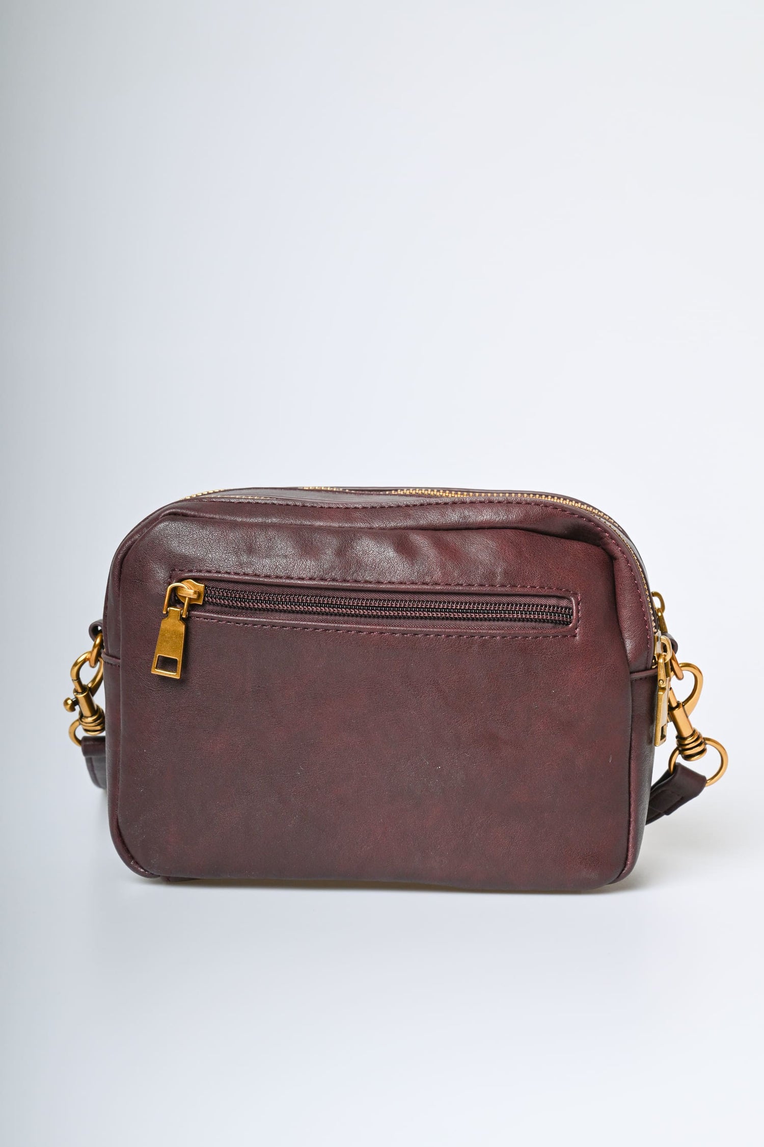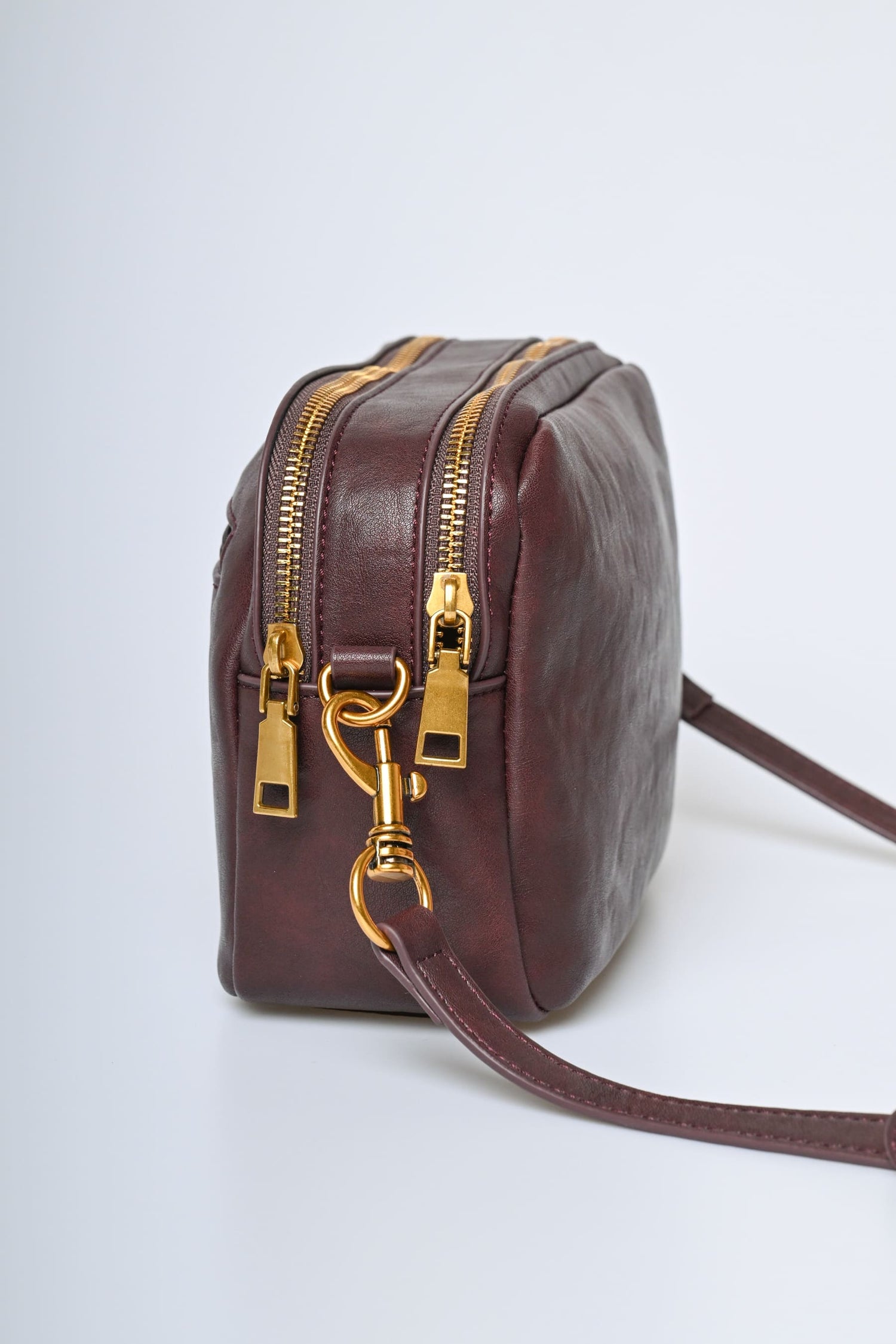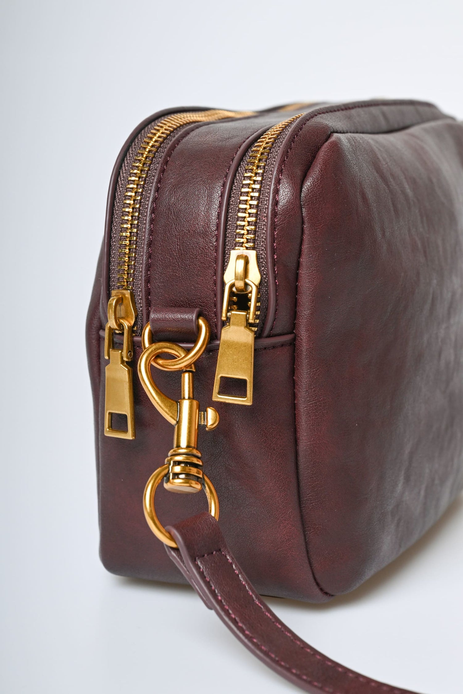 Borsa crossbody in similpelle bordeaux scuro con doppi scomparti chiusi da zip, tracolla regolabile e rimovibile e hardware in metallo dorato.