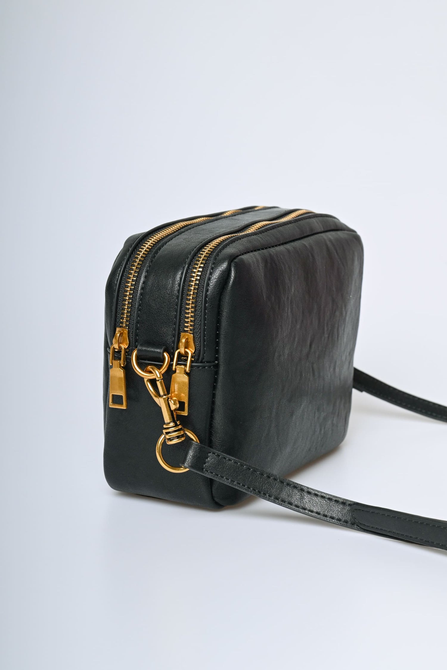 Borsa crossbody in similpelle nera con doppi scomparti chiusi da zip, tracolla regolabile e rimovibile e hardware in metallo dorato.