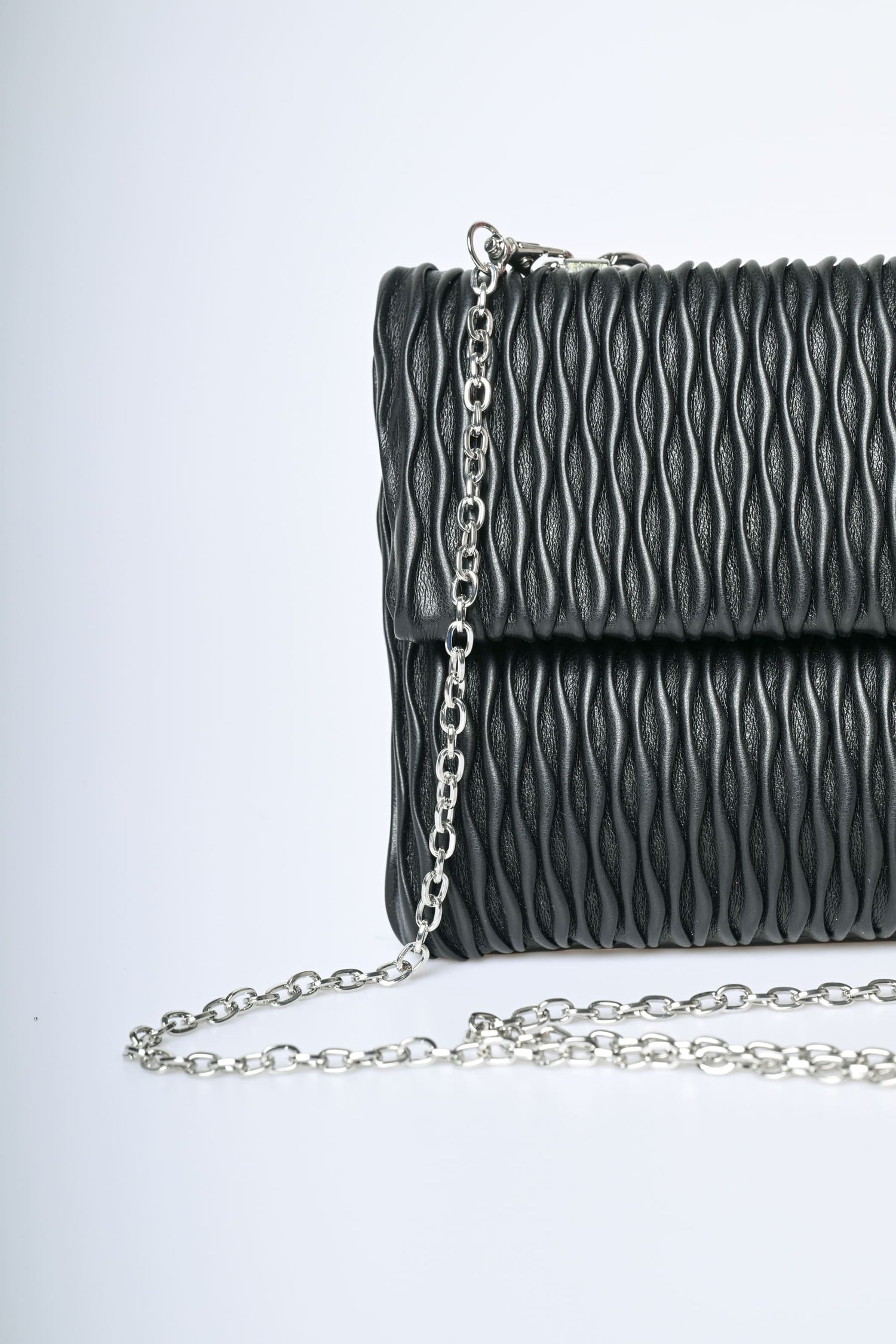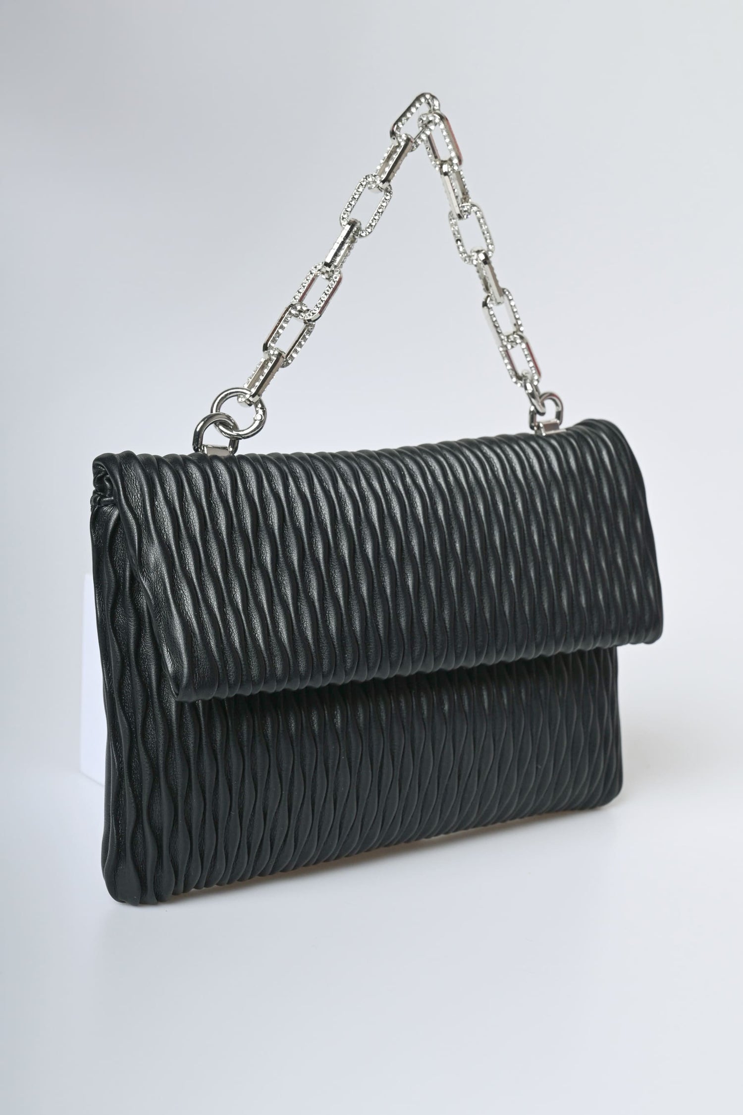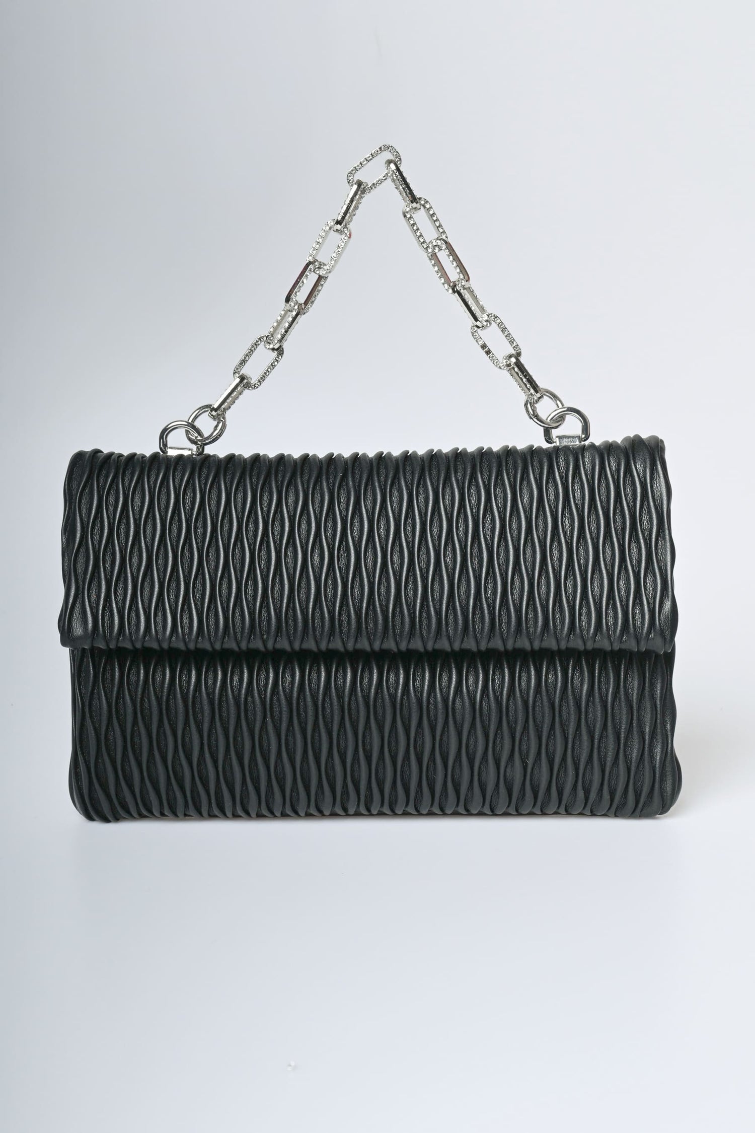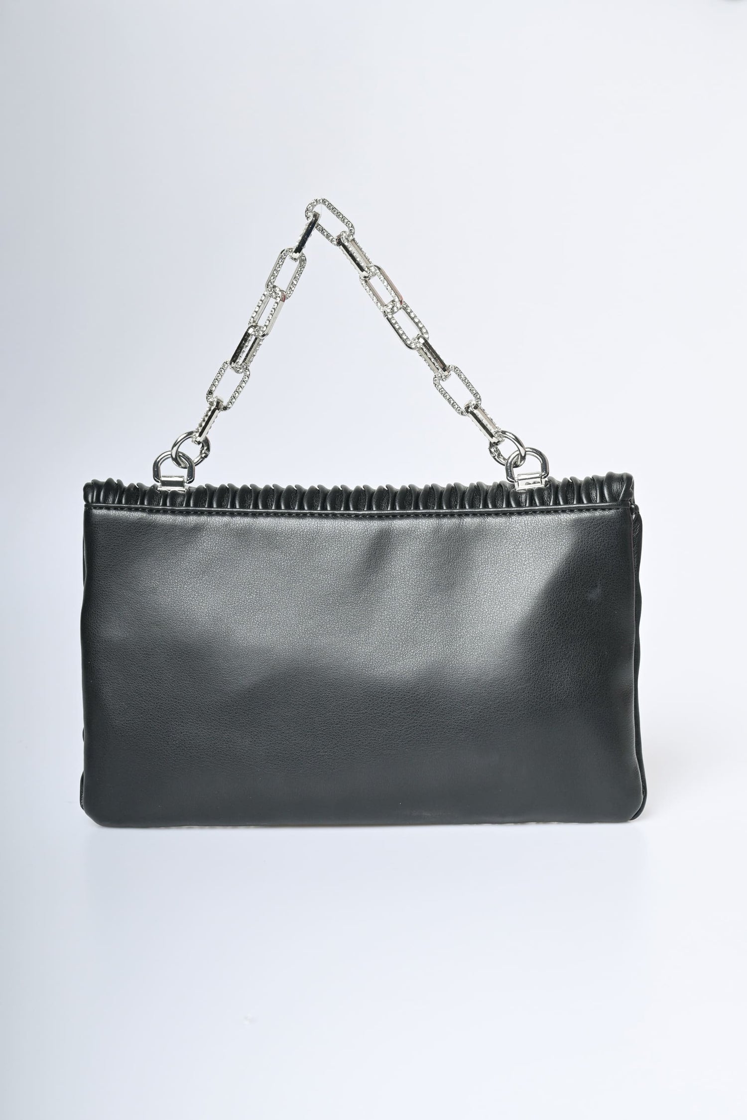 Pochette in similpelle goffrata nera con manico gioiello a catena impreziosito da strass, chiusura magnetica nascosta e hardware in metallo argentato.