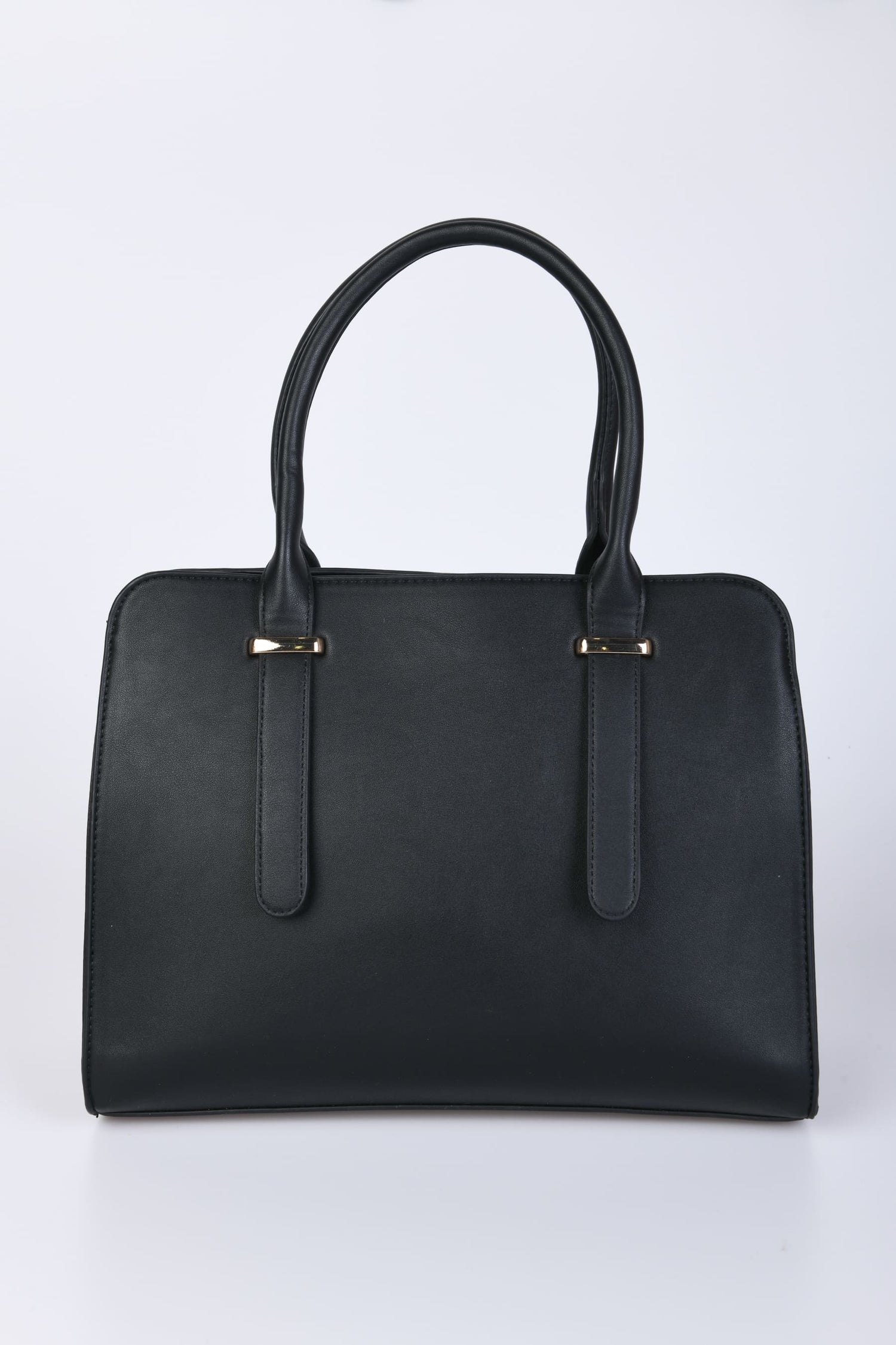 Borsa grande a spalla in similpelle nera con doppi manici superiori, tracolla regolabile e rimovibile, chiusura con zip, tasca piatta frontale e hardware in metallo dorato.