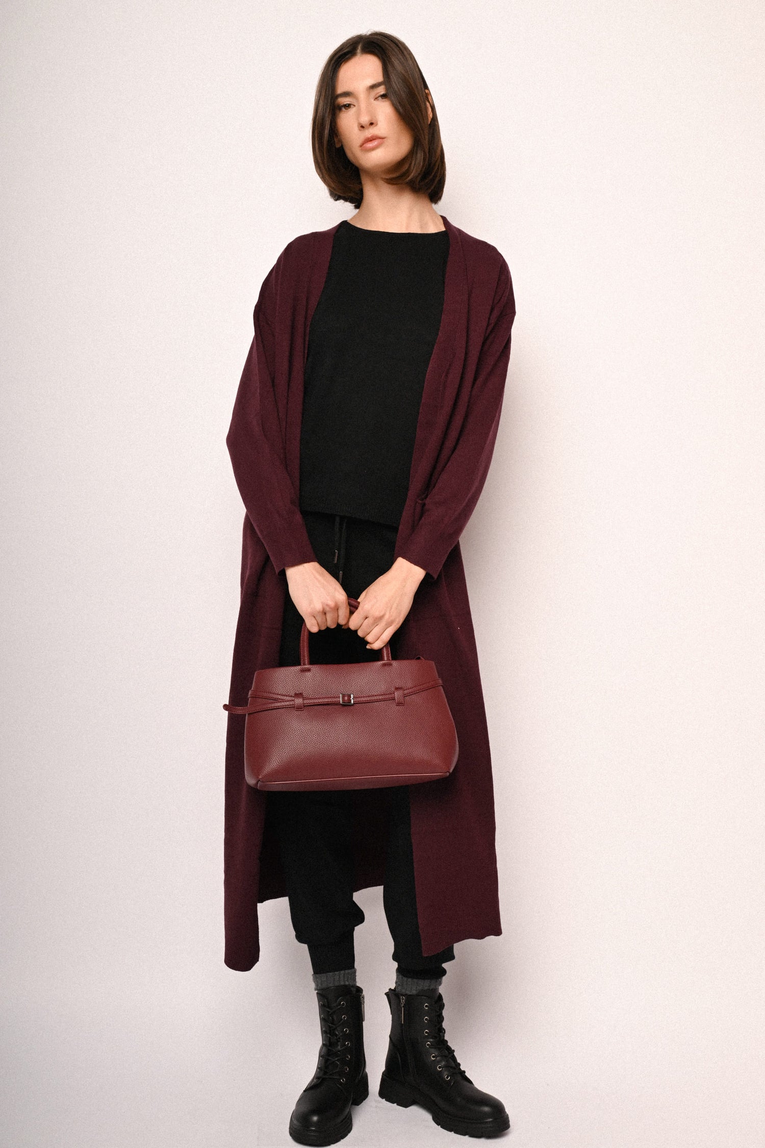 Borsa a mano in similpelle bordeaux con doppi manici superiori, chiusura interna con zip, cinturino decorativo orizzontale con fibbia e passanti.