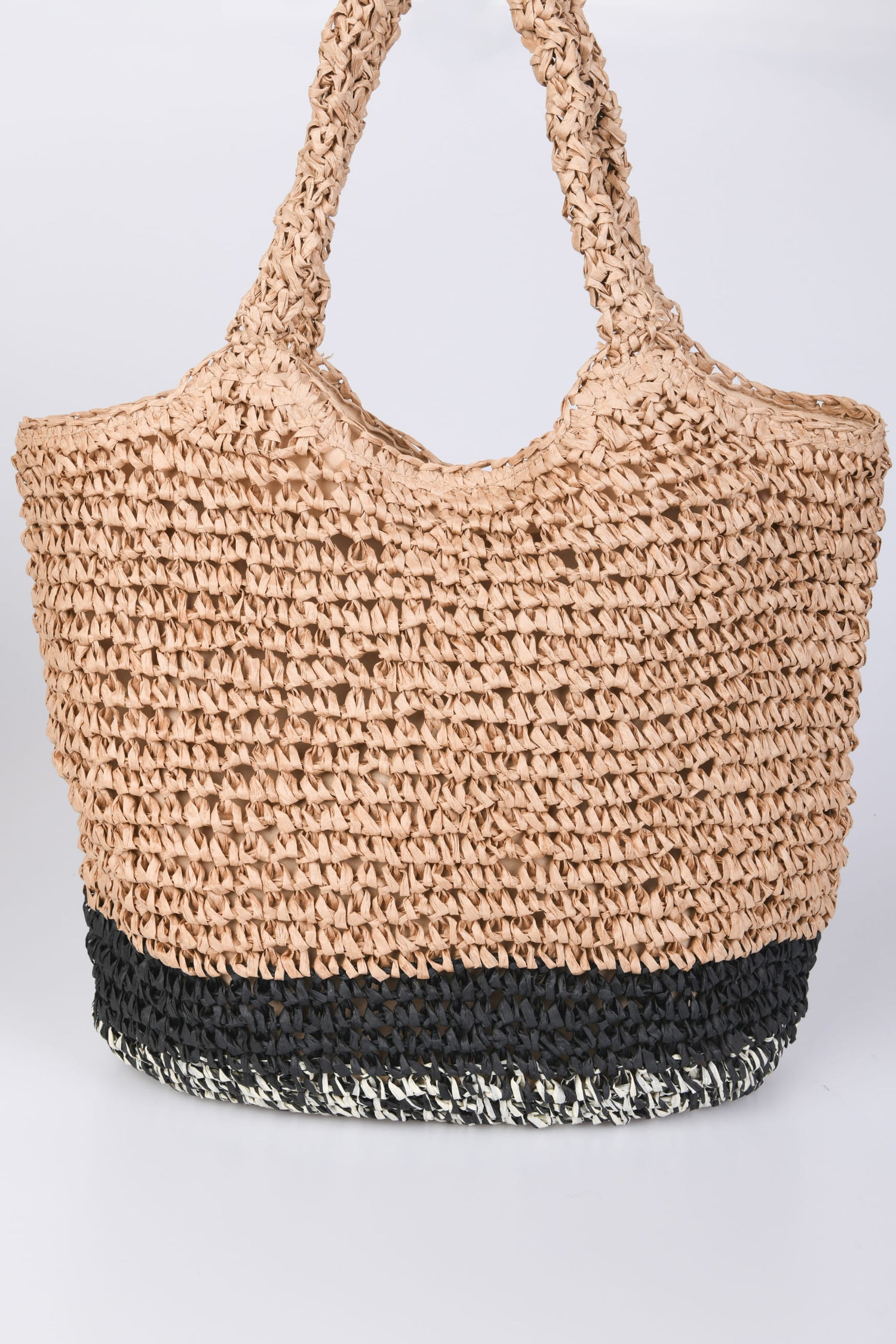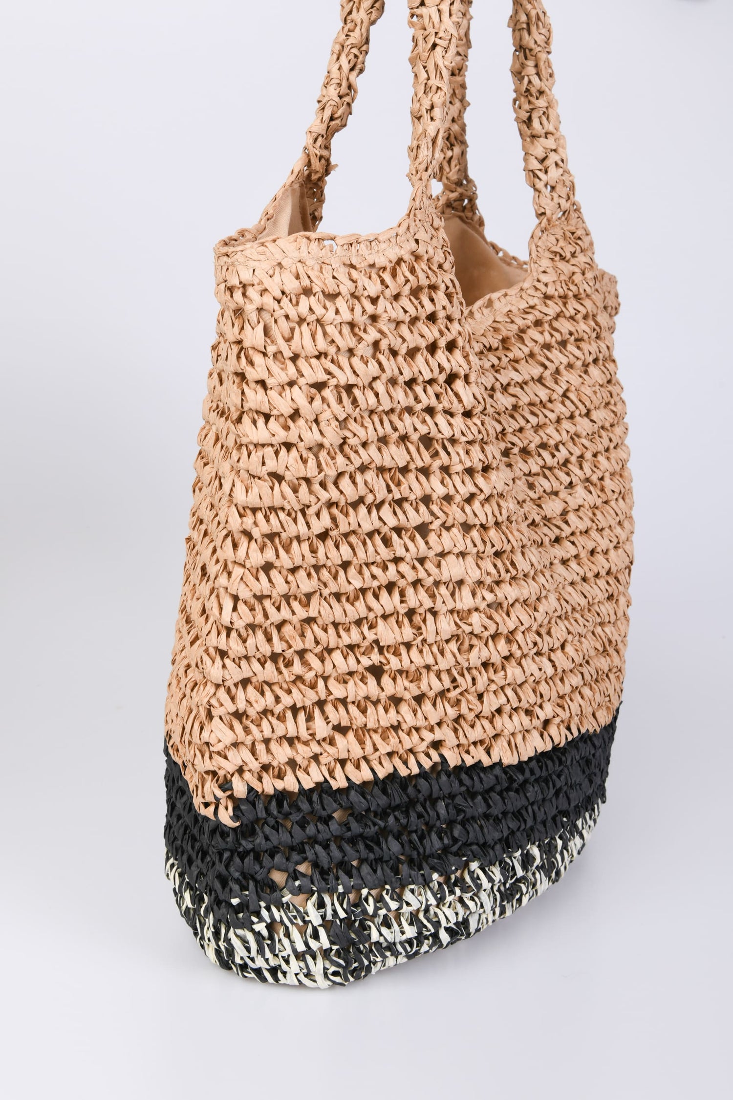 Borsa shopper in rafia intrecciata beige naturale con banda nera e mélange al fondo, doppi manici, fodera in tessuto, chiusura con zip e tasca piatta interna.