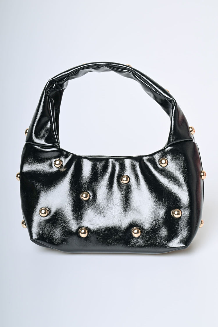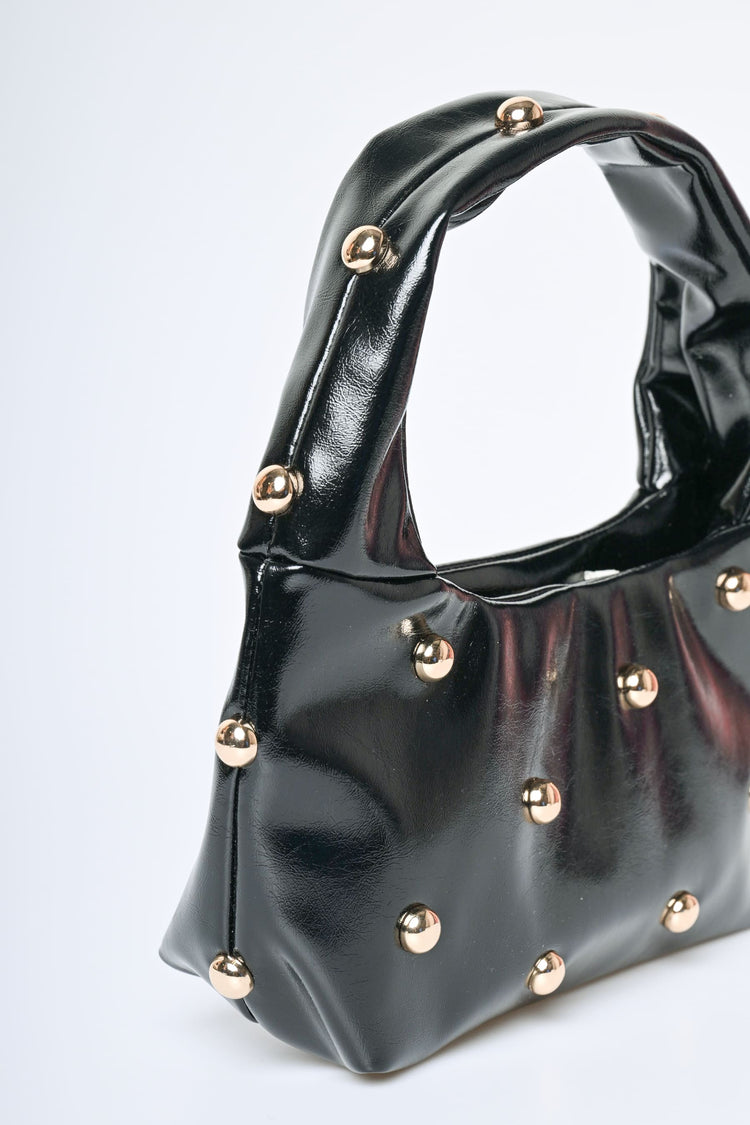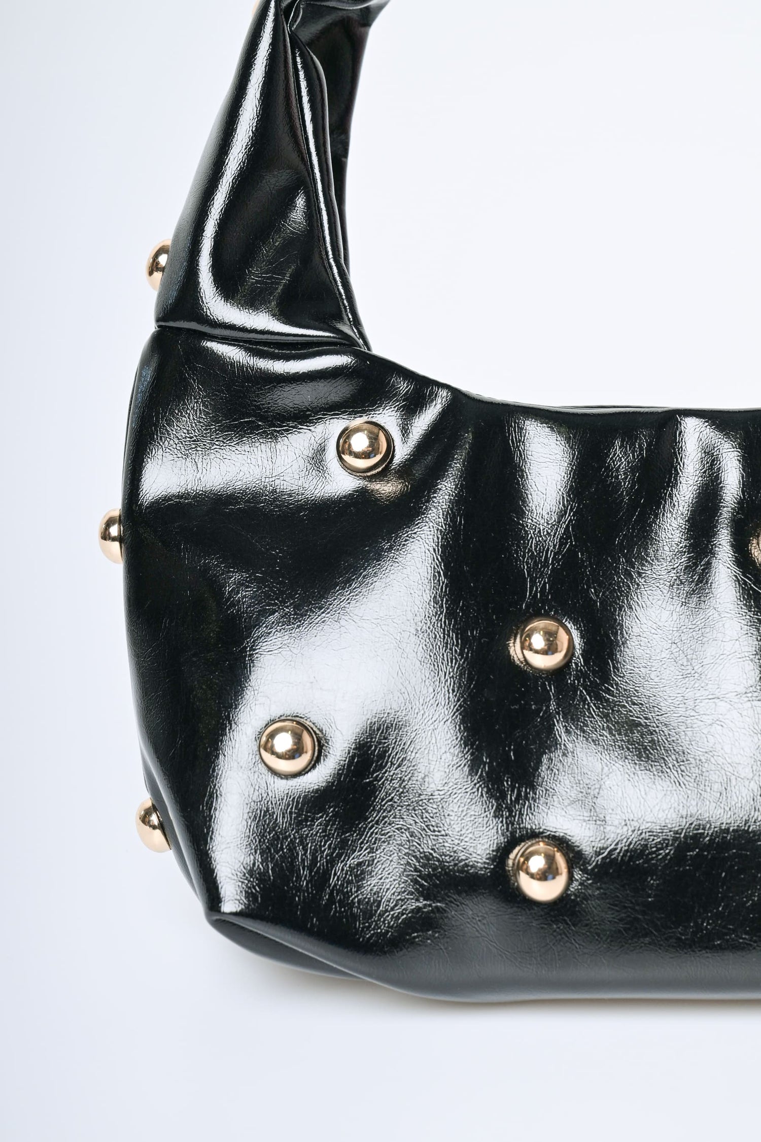 Borsa piccola hobo a mezzaluna in similpelle lucida nera con borchie decorative, manico superiore, chiusura con zip e hardware in metallo dorato.