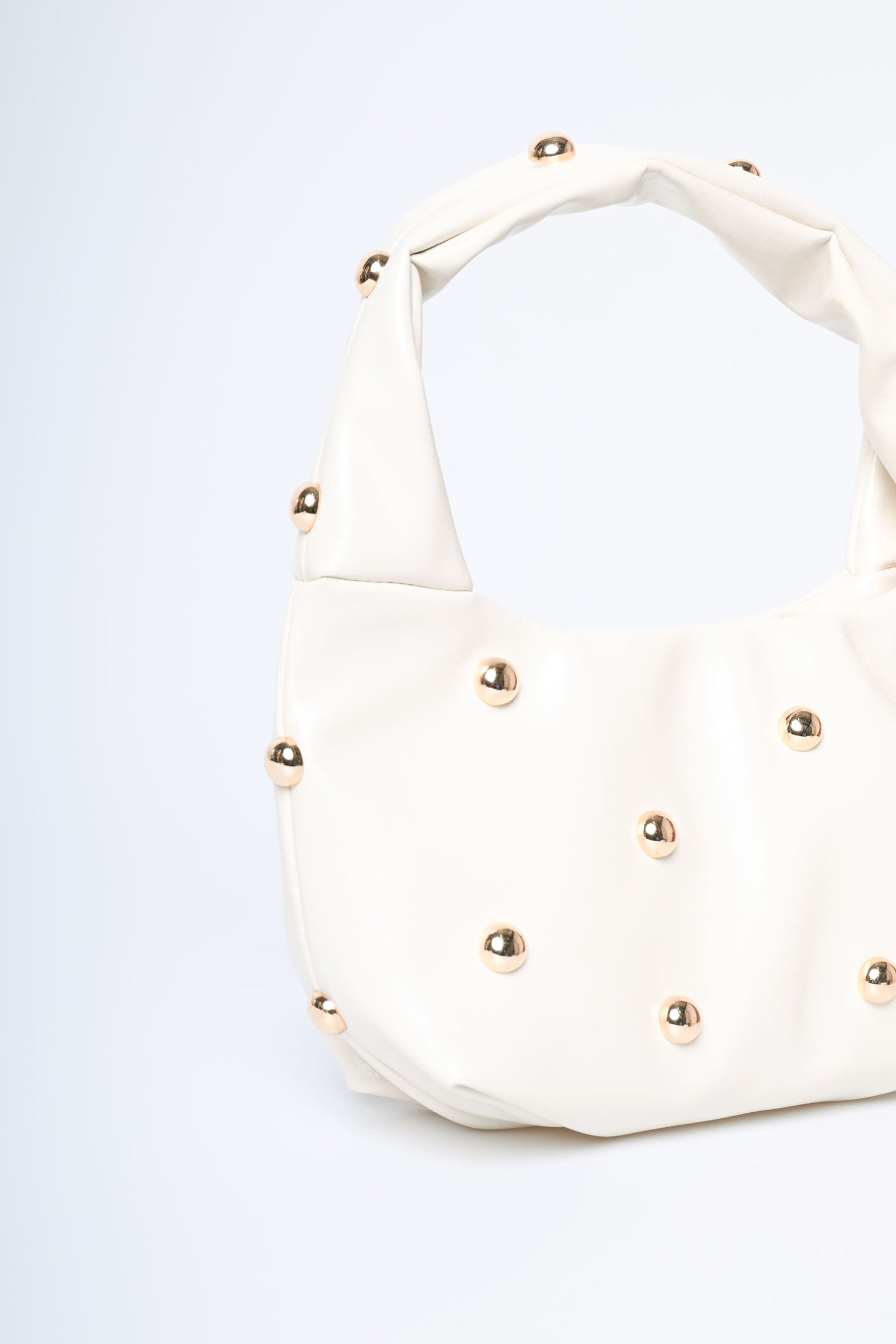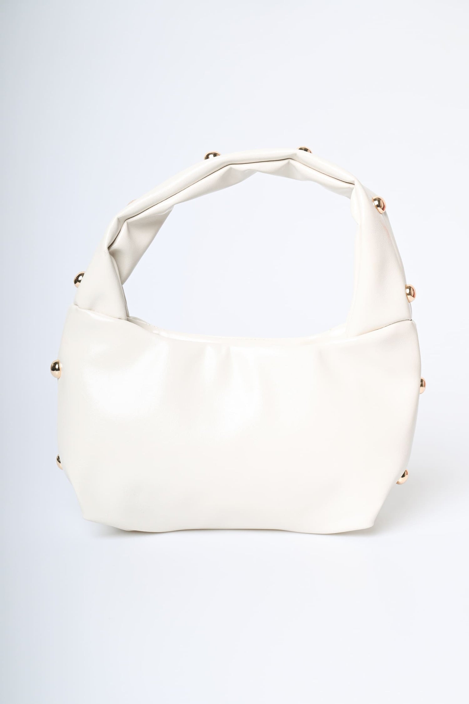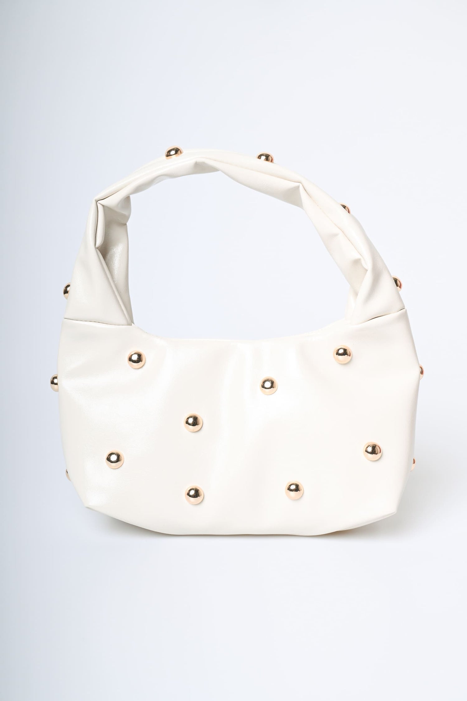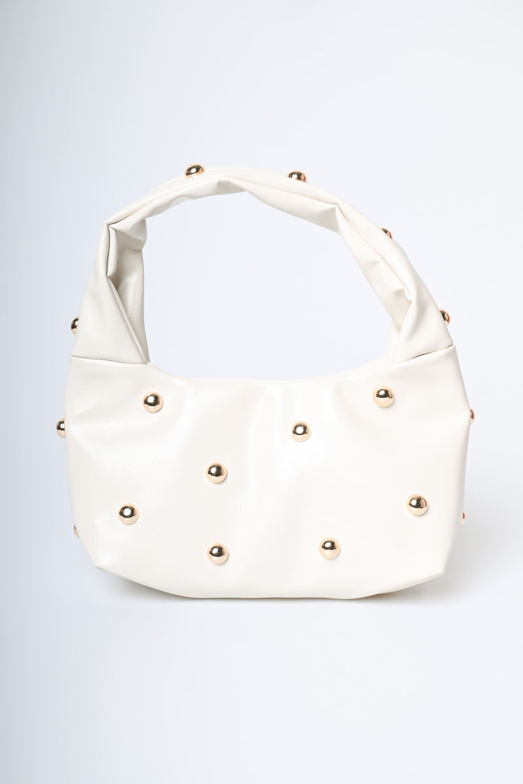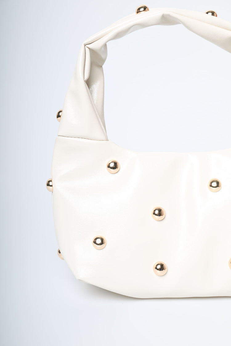 Borsa piccola hobo a mezzaluna in similpelle bianca con borchie decorative, manico superiore, chiusura con zip e hardware in metallo dorato.