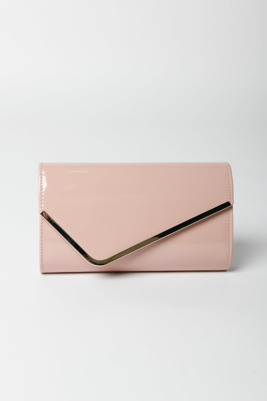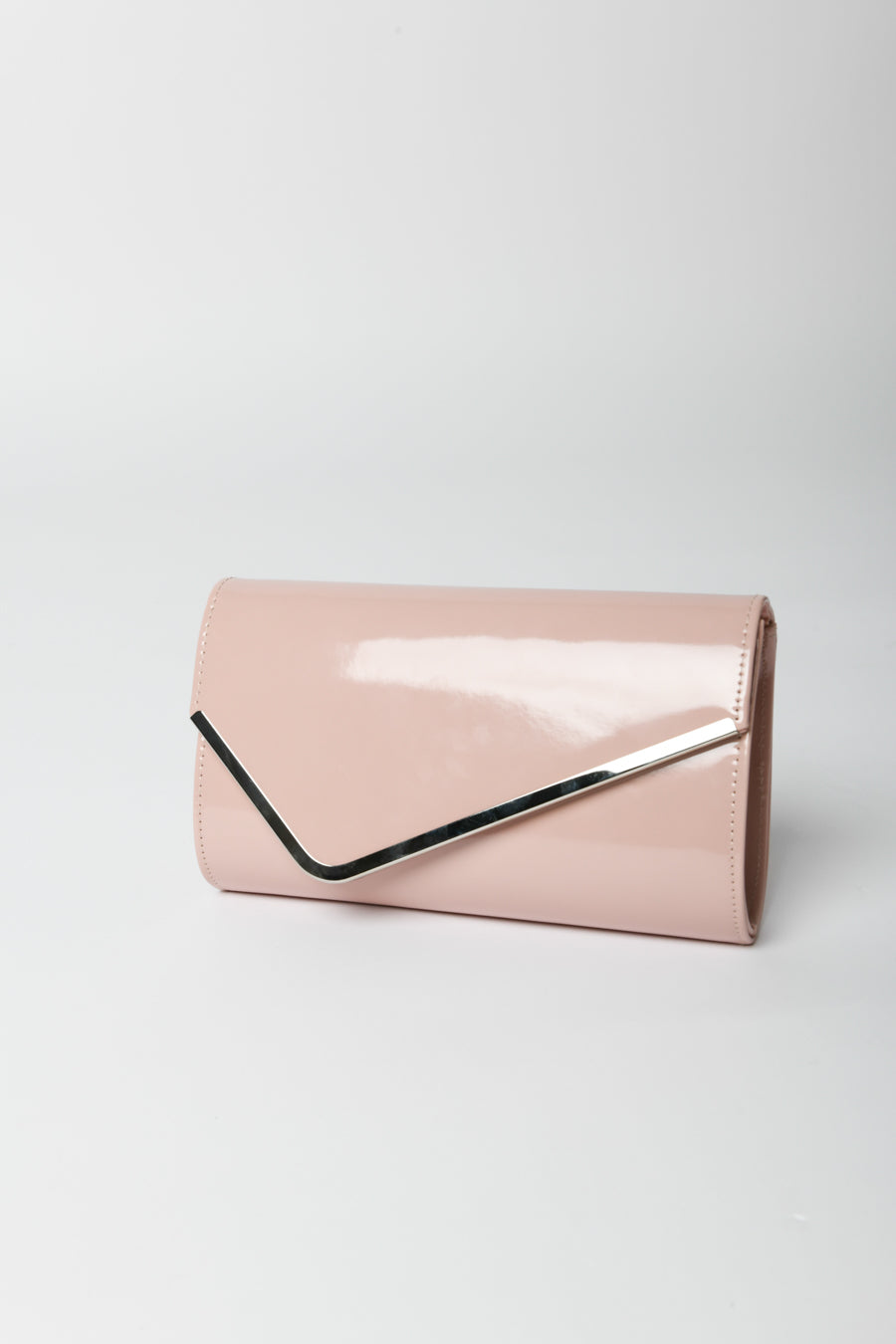 Clutch in similpelle effetto vernice rosa con risvolto asimmetrico sottolineato da profilo in metallo argentato, chiusura magnetica nascosta e tracolla sottile a catenella.