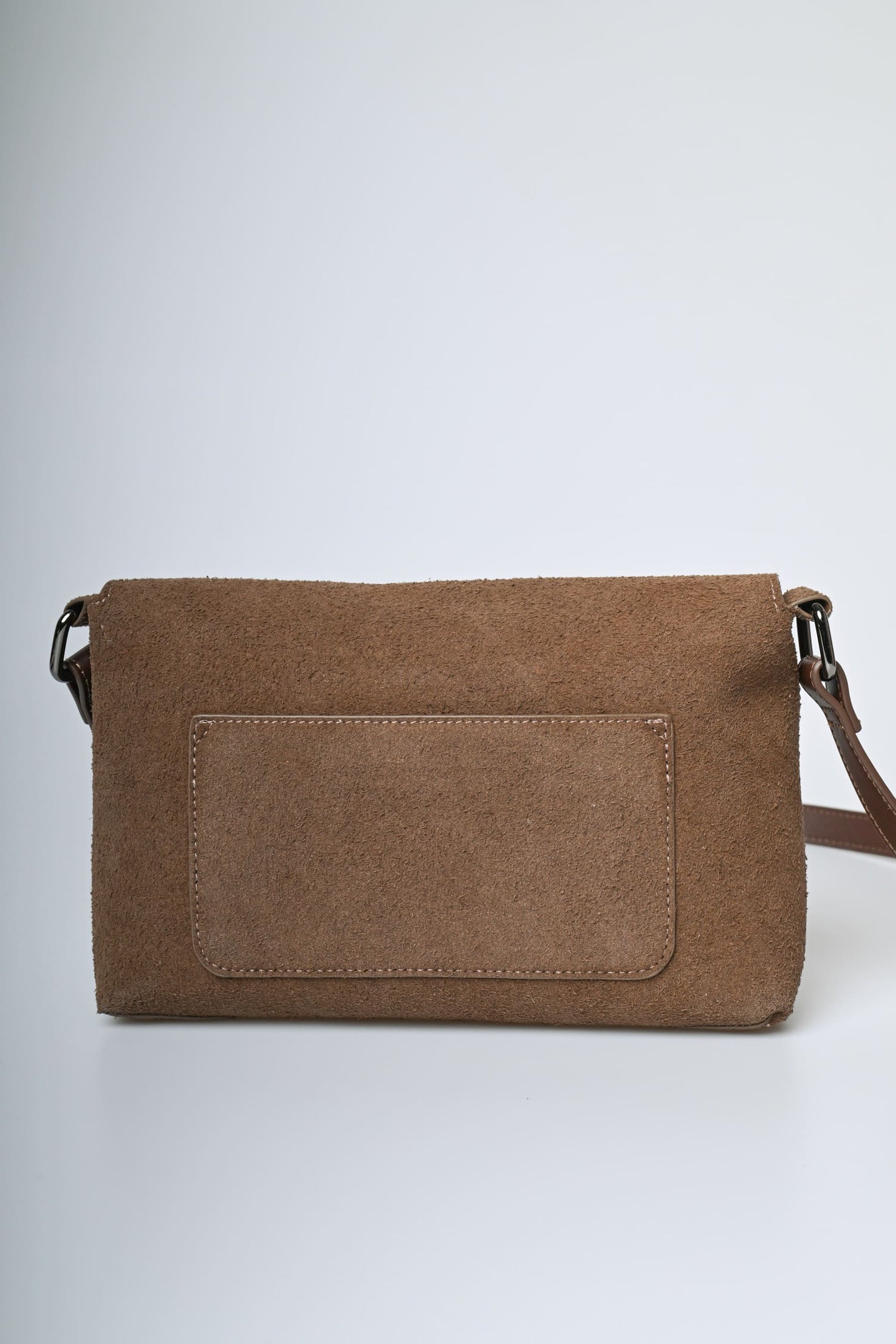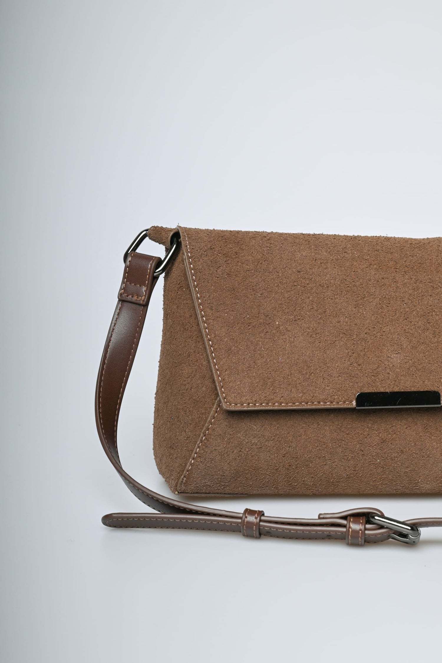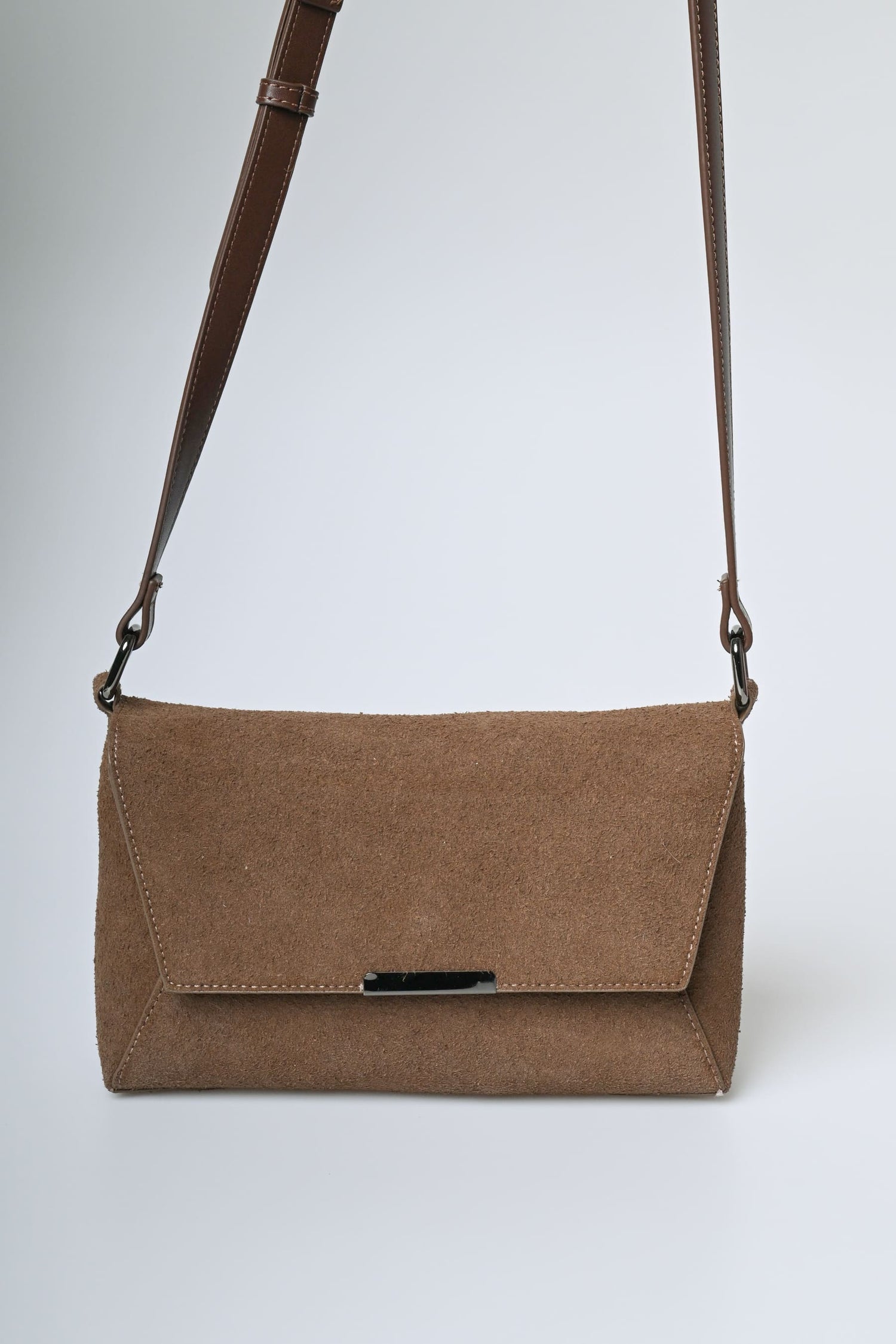 Borsa a busta in similpelle scamosciata marrone con tracolla in similpelle regolabile, risvolto con chiusura magnetic nascosta e tab in metallo, tasca piatta sul retro e hardware in metallo argentato scuro.