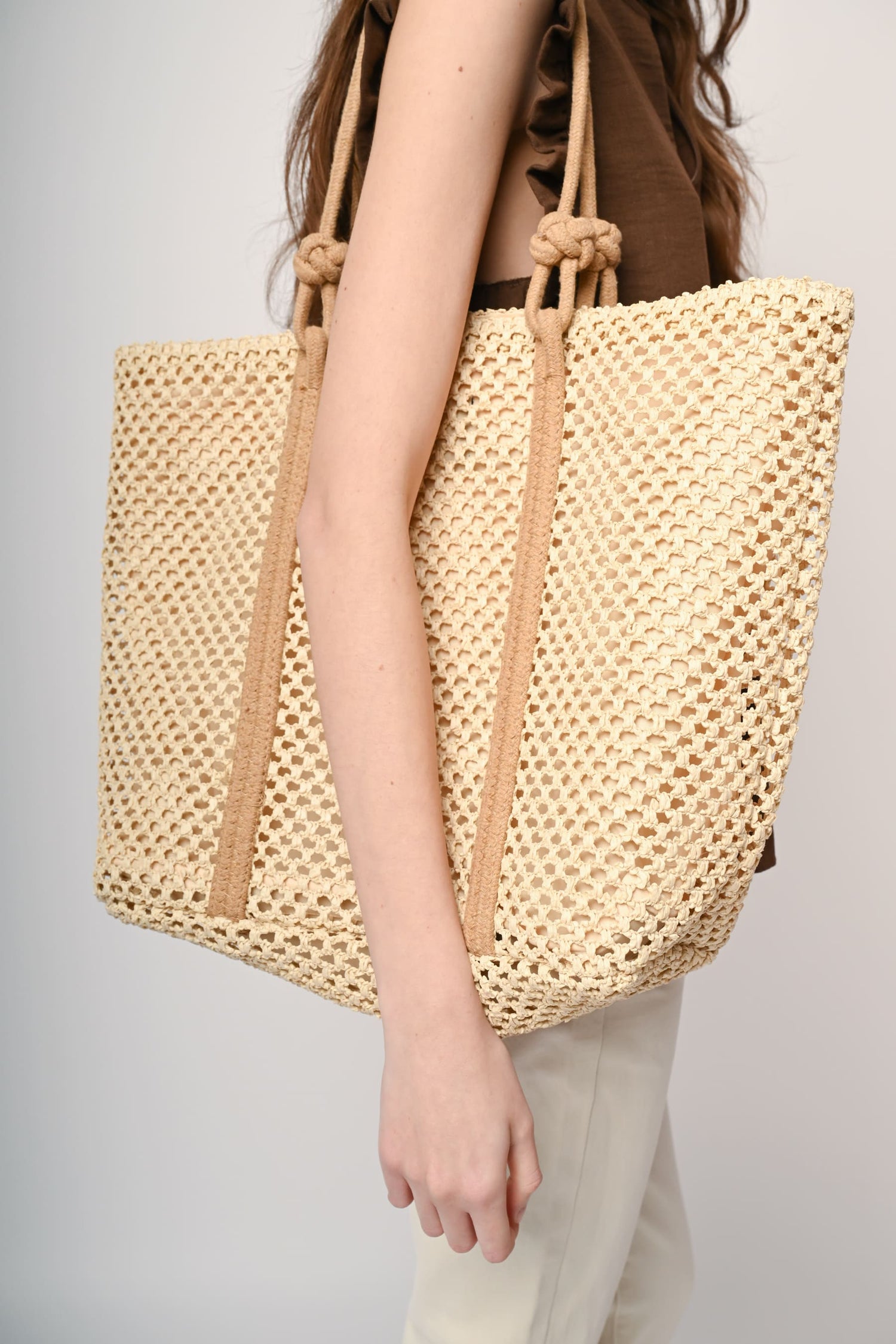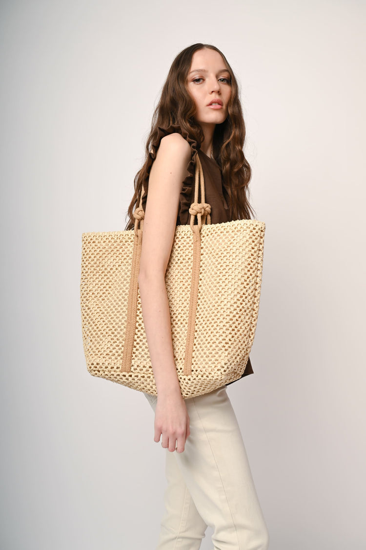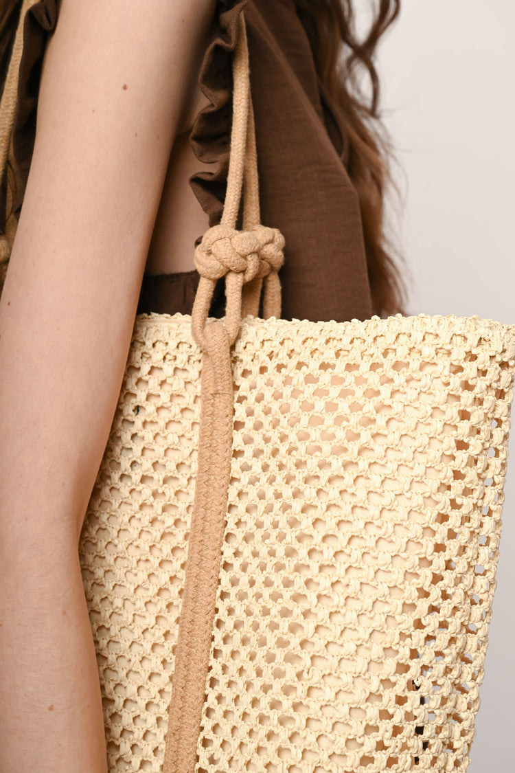 Borsa tote grande in paglia beige intrecciata a rete con doppi manici in tessuto marrone chiaro con nodi.