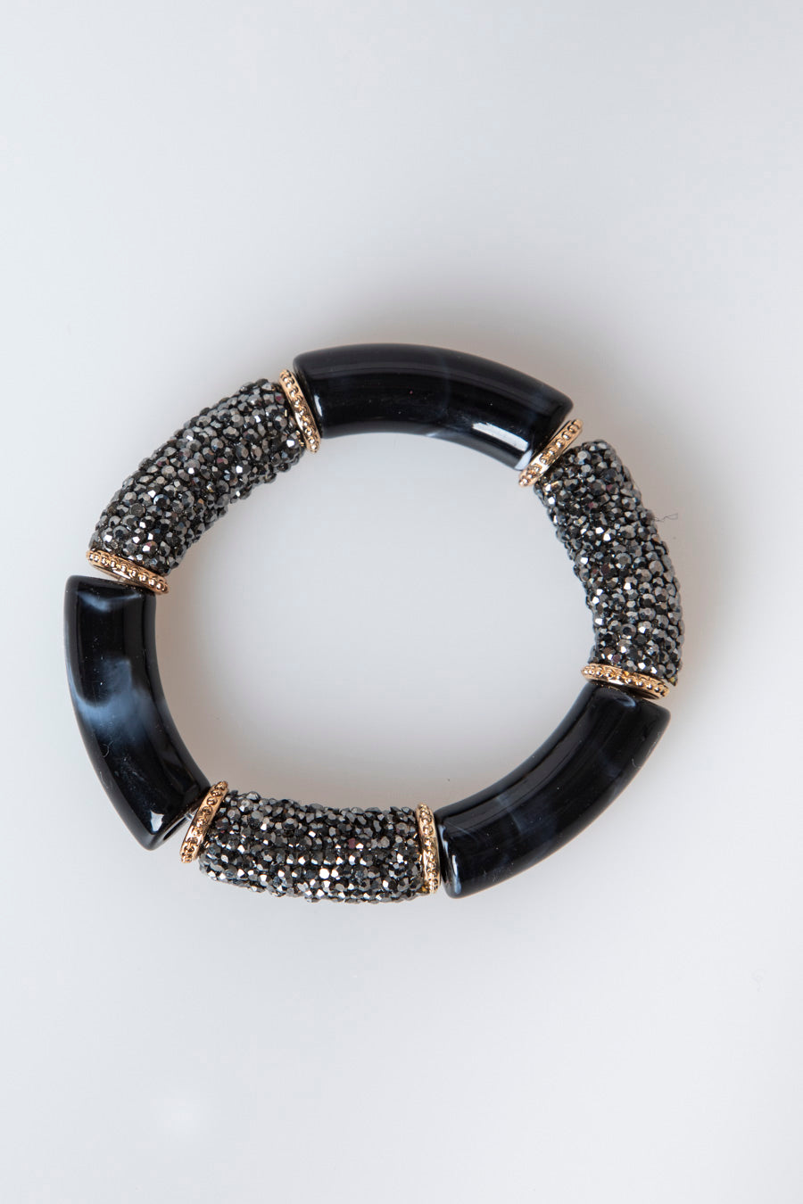 Bracciale rigido elasticizzato con inserti smaltati in nero, strass decorativi e anelli in metallo dorato.