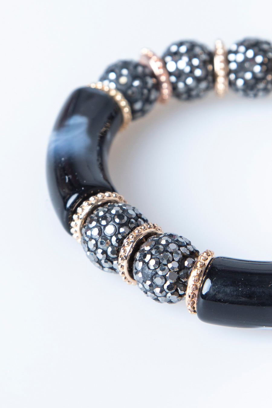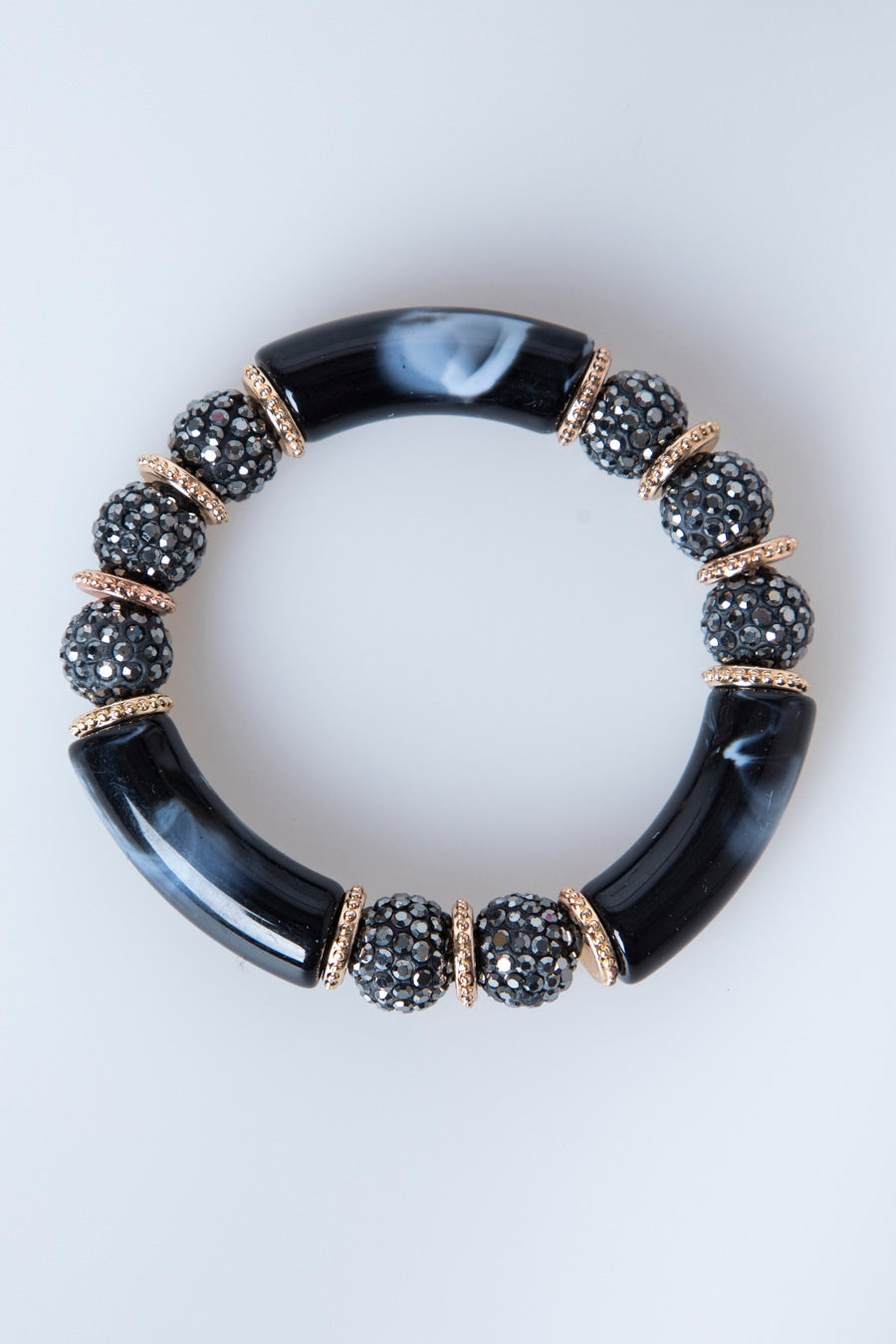 Bracciale rigido elasticizzato con inserti in plastica marmorizzata nei toni del nero, perle con strass e inserti in metallo dorato.