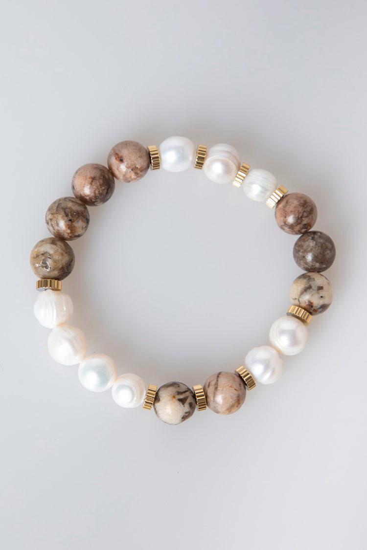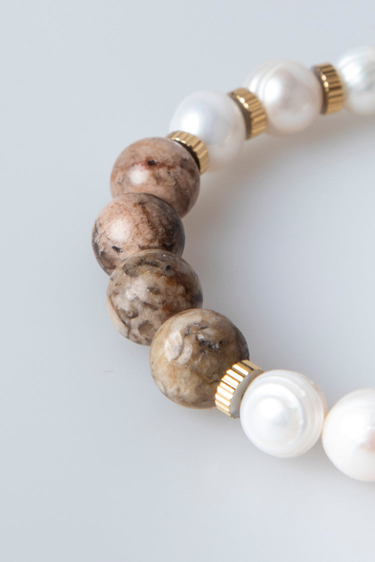 Braccialetto elasticizzato con sfere decorative nei toni del marrone e bianco e anelli in metallo dorato.
