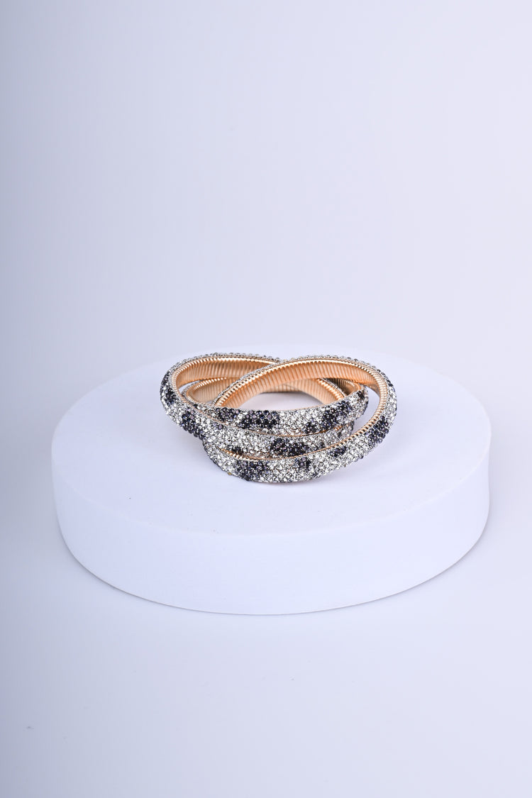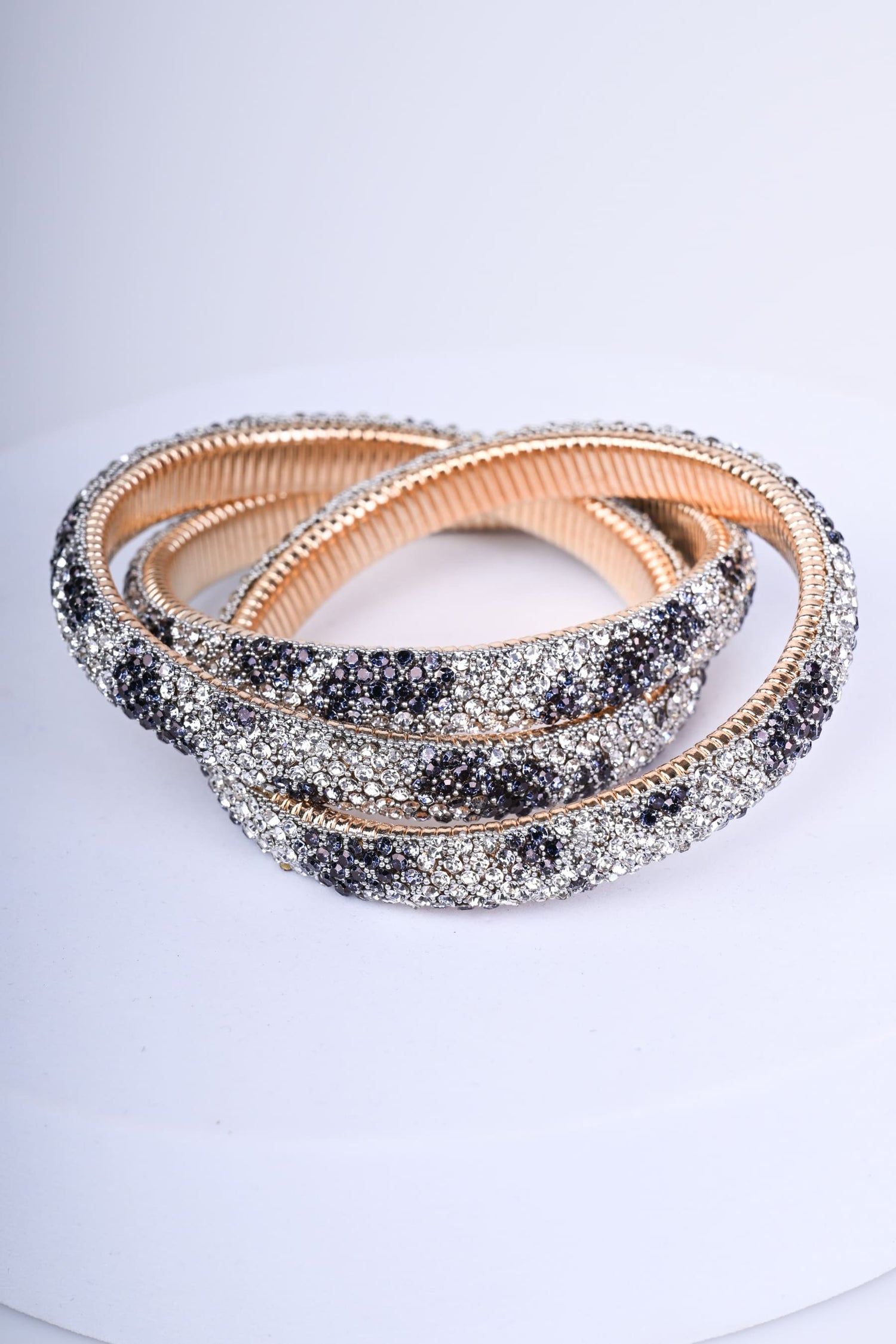 Bracciali rigidi intrecciati in metallo dorato impreziositi da strass a motivo animalier multicolor.
