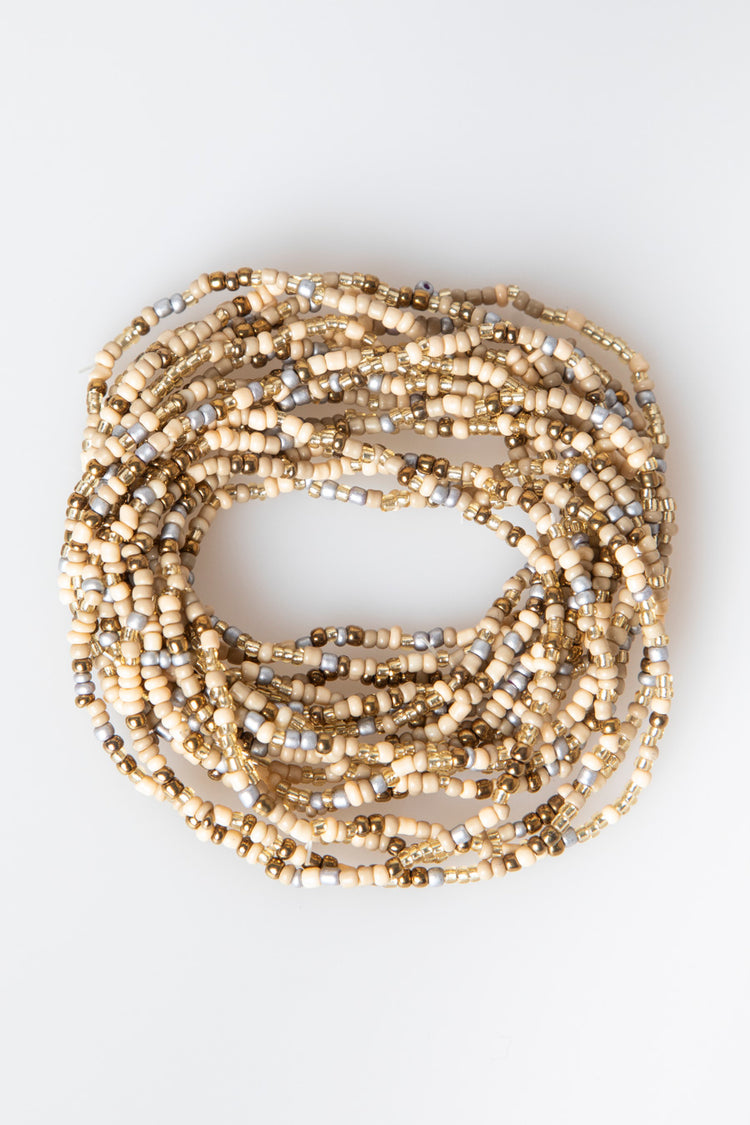 Bracciale a multifili elasticizzati con perline nei toni del beige, marrone, grigio e oro.