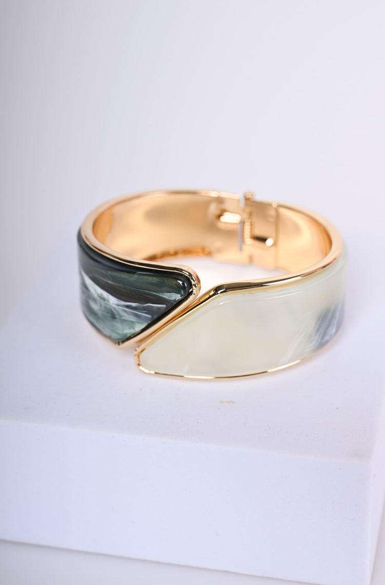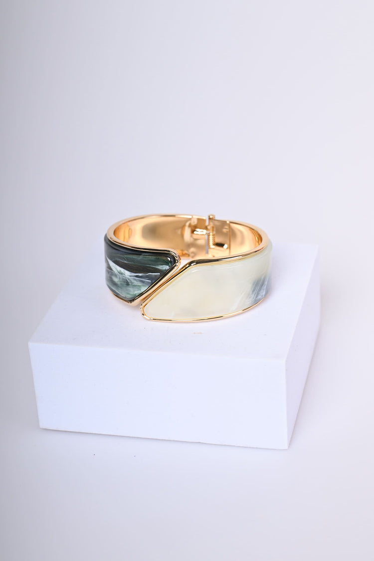 Bracciale rigido in metallo dorato con decorazione effetto marmo nei toni del verde e bianco.