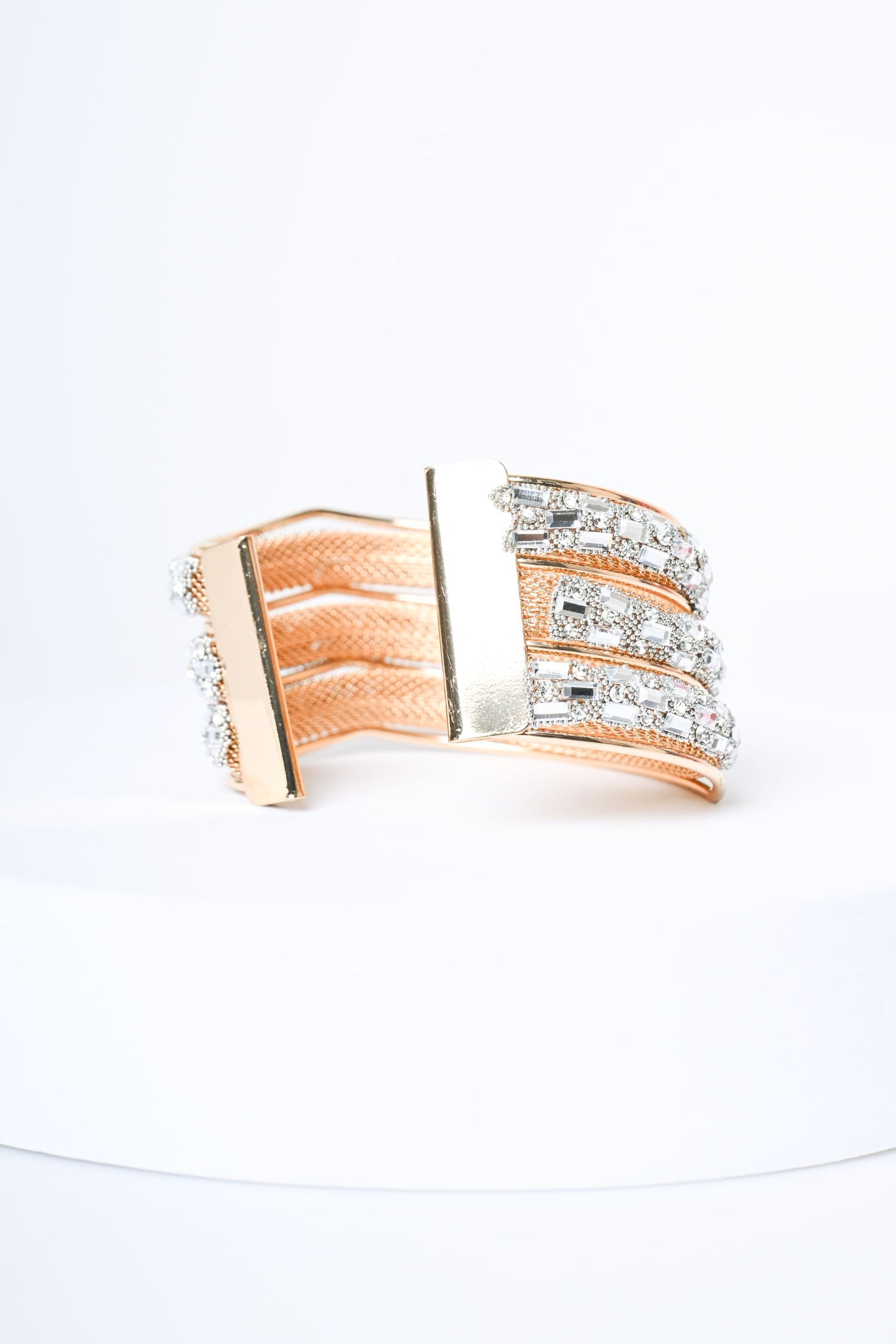 Bracciale rigido a fasce in metallo dorato con cristalli e strass decorativi argentati.