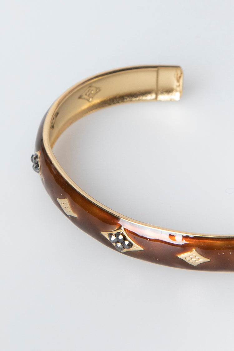 Bracciale rigido in metallo dorato e smalto marrone con decorazioni a diamante e strass.