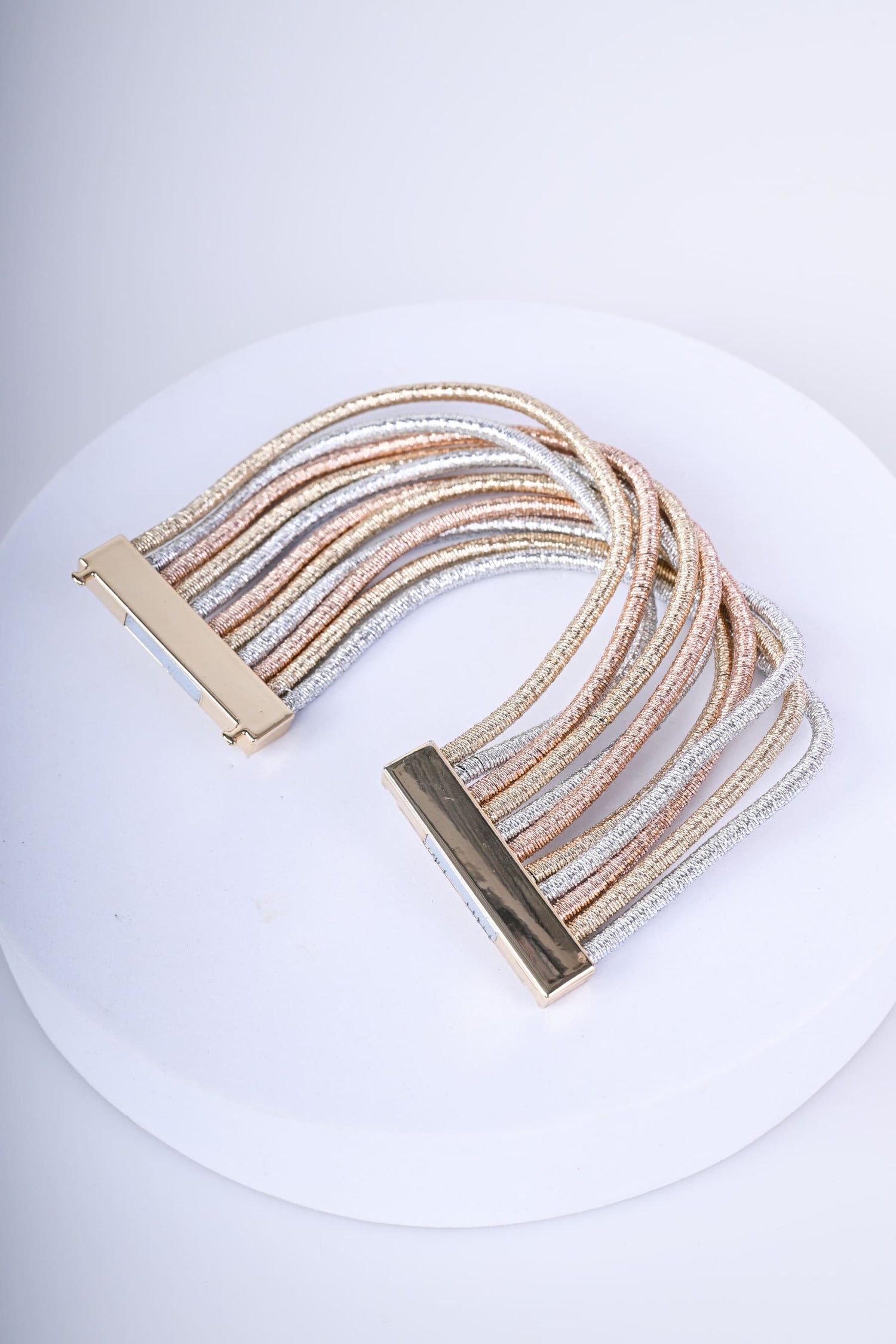 Bracciale con fili multipli in tessuto nei toni delloro, argento e oro rosa e tab di chiusura in metallo dorato.