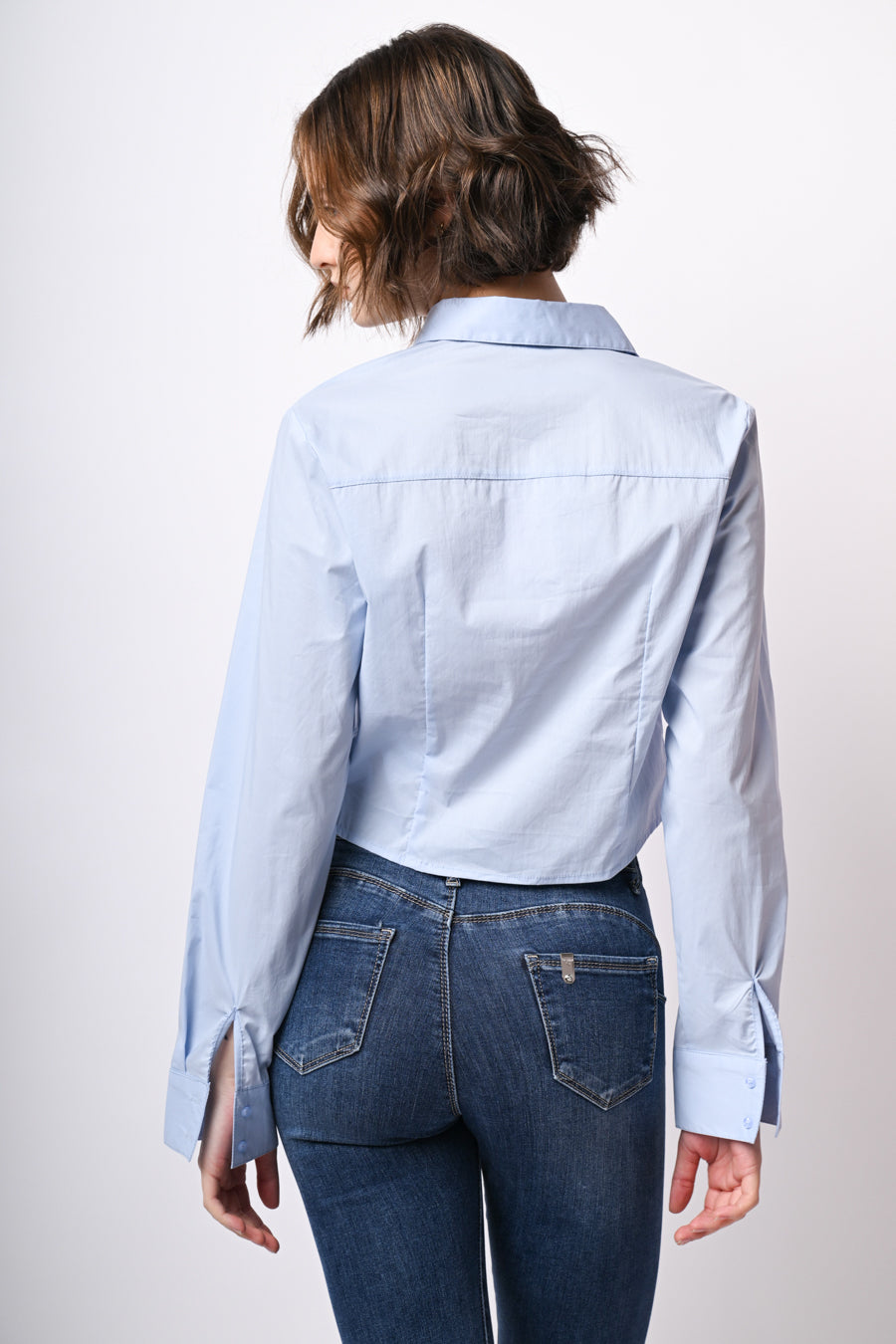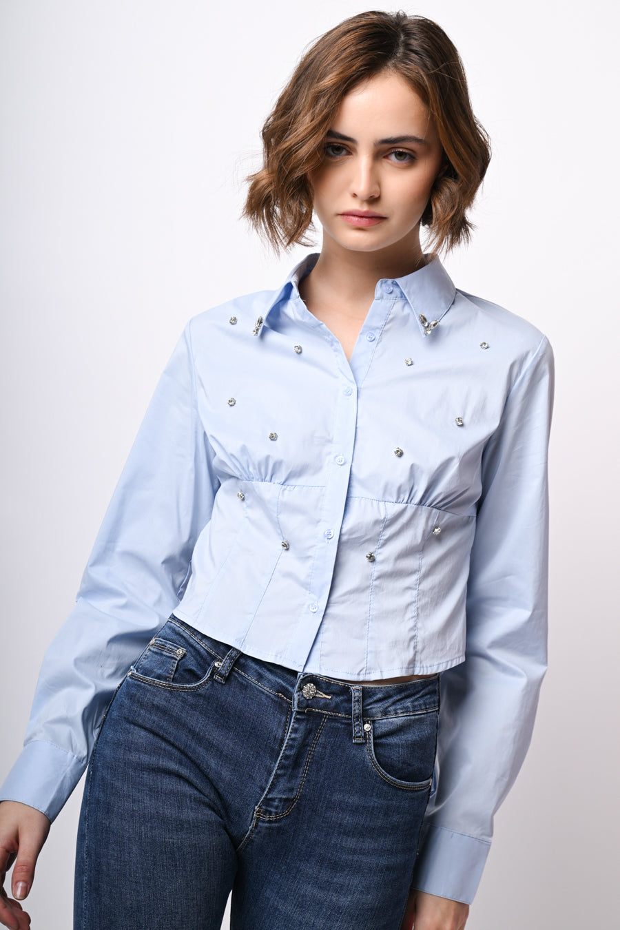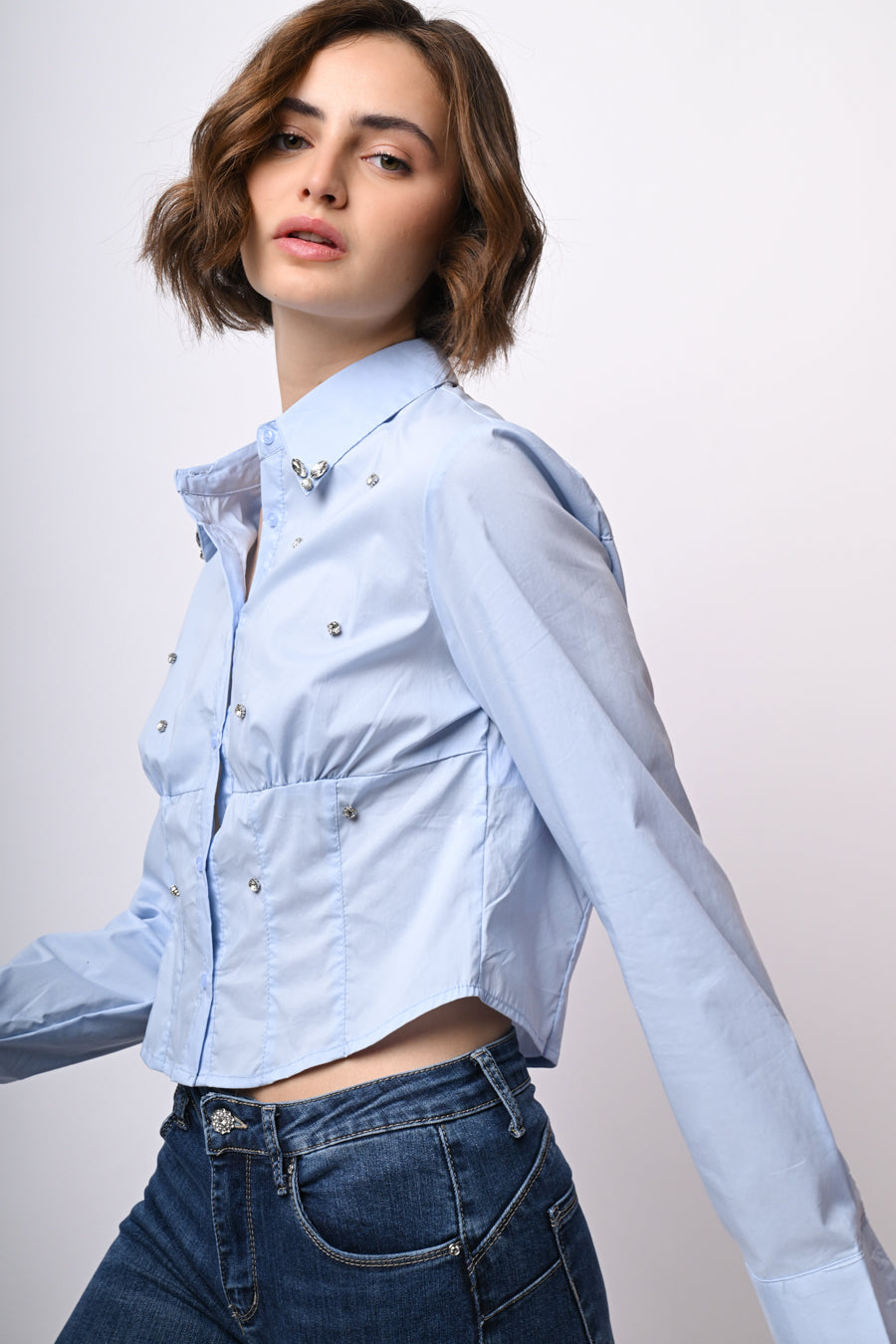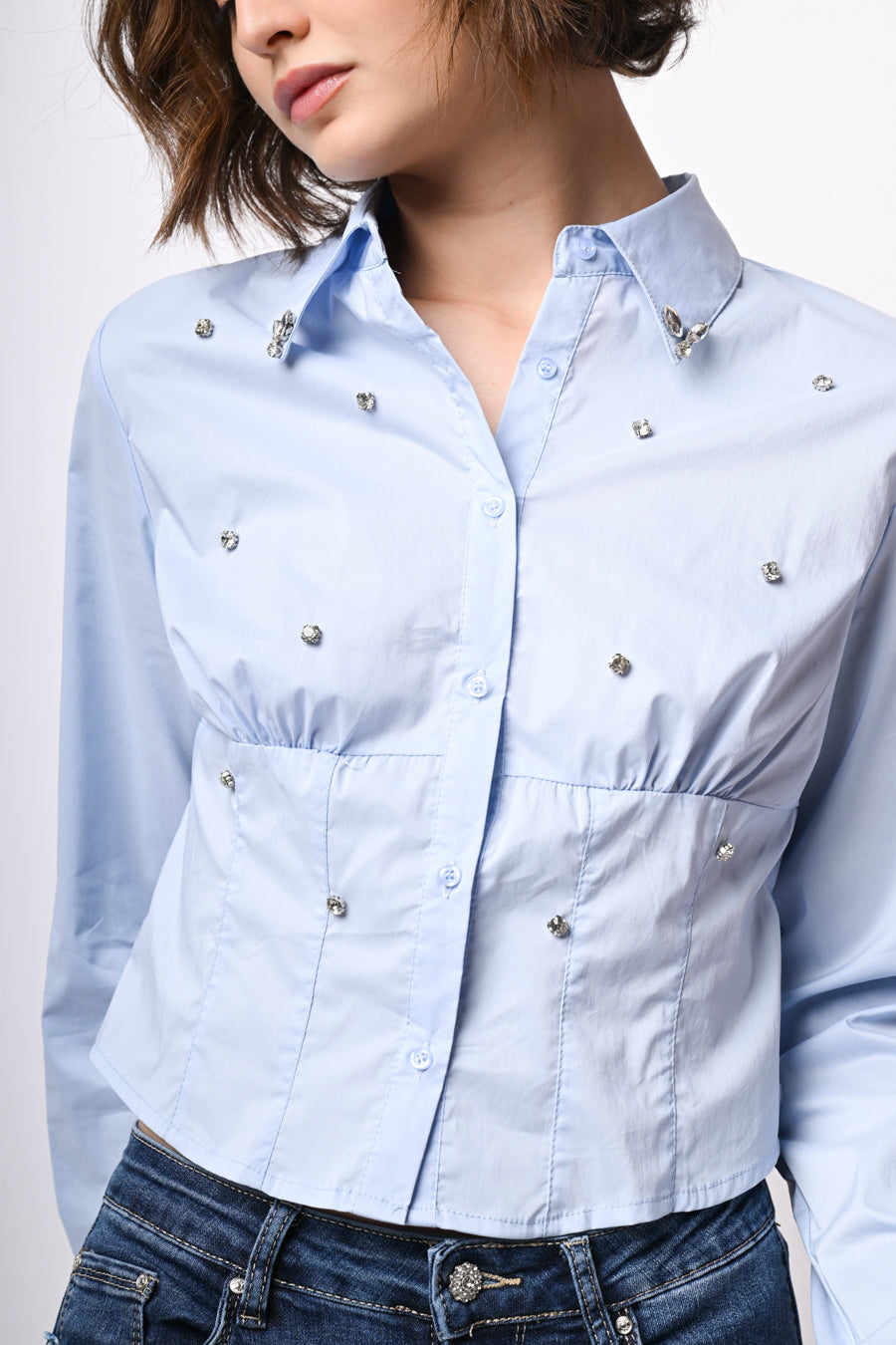 Camicia in cotone azzurro con cristalli decorativi sul davanti e sul colletto a punta, abbottonatura frontale e ai polsini, design alla vita effetto bustier e orlo stondato.