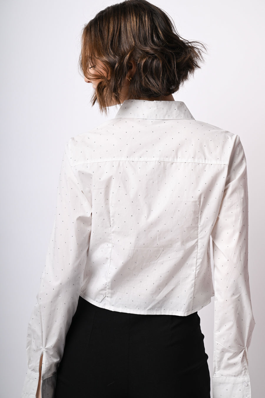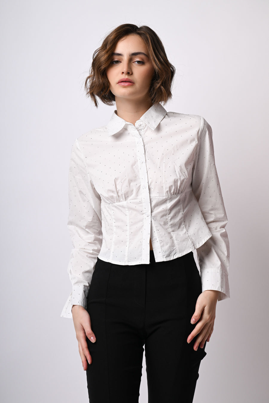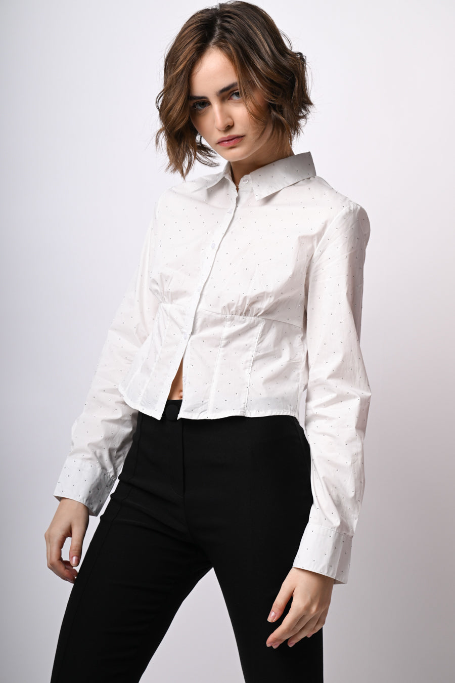 Camicia in cotone bianco con mini borchie all-over, colletto a punta, abbottonatura frontale e ai polsini, design alla vita effetto bustier e orlo stondato.