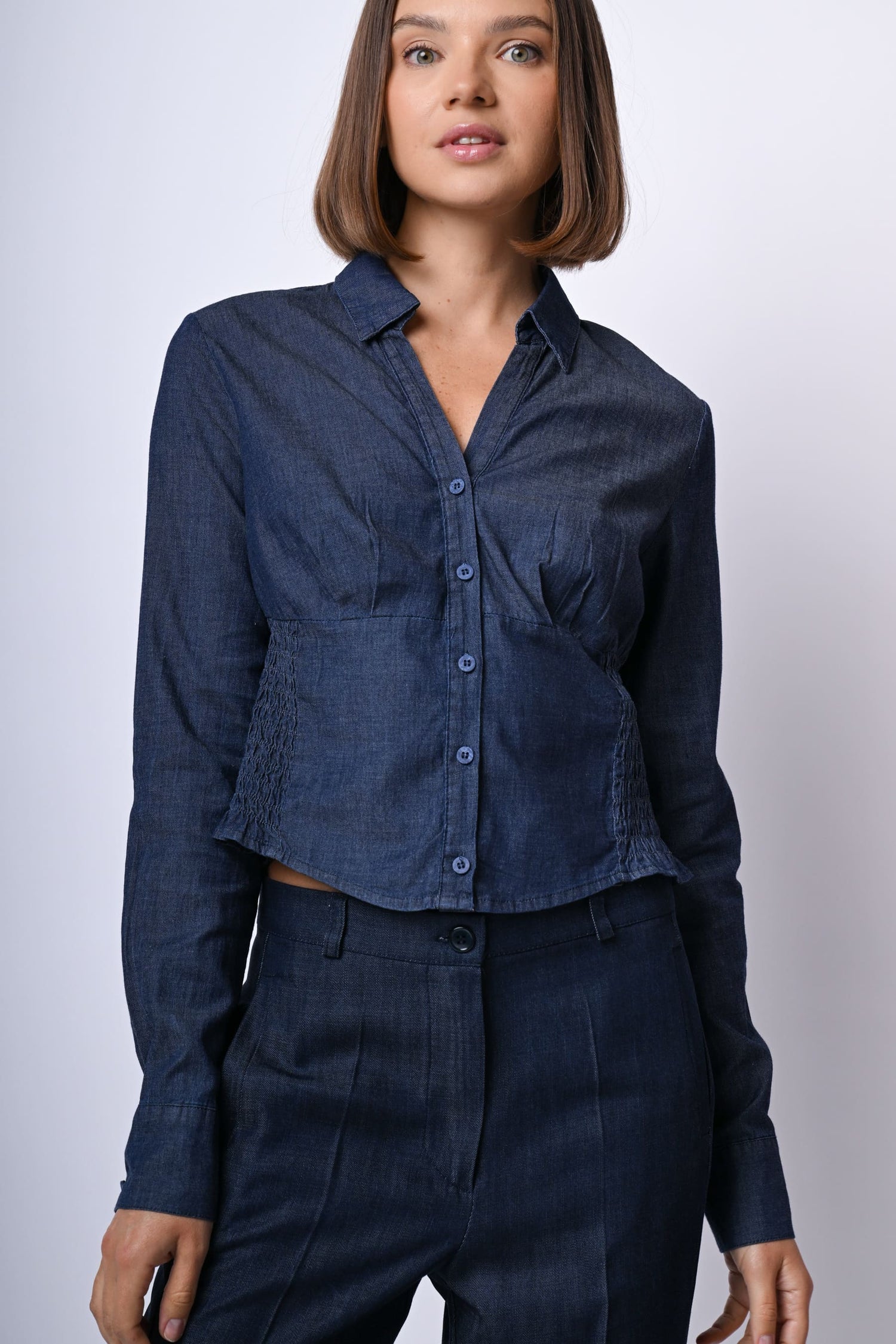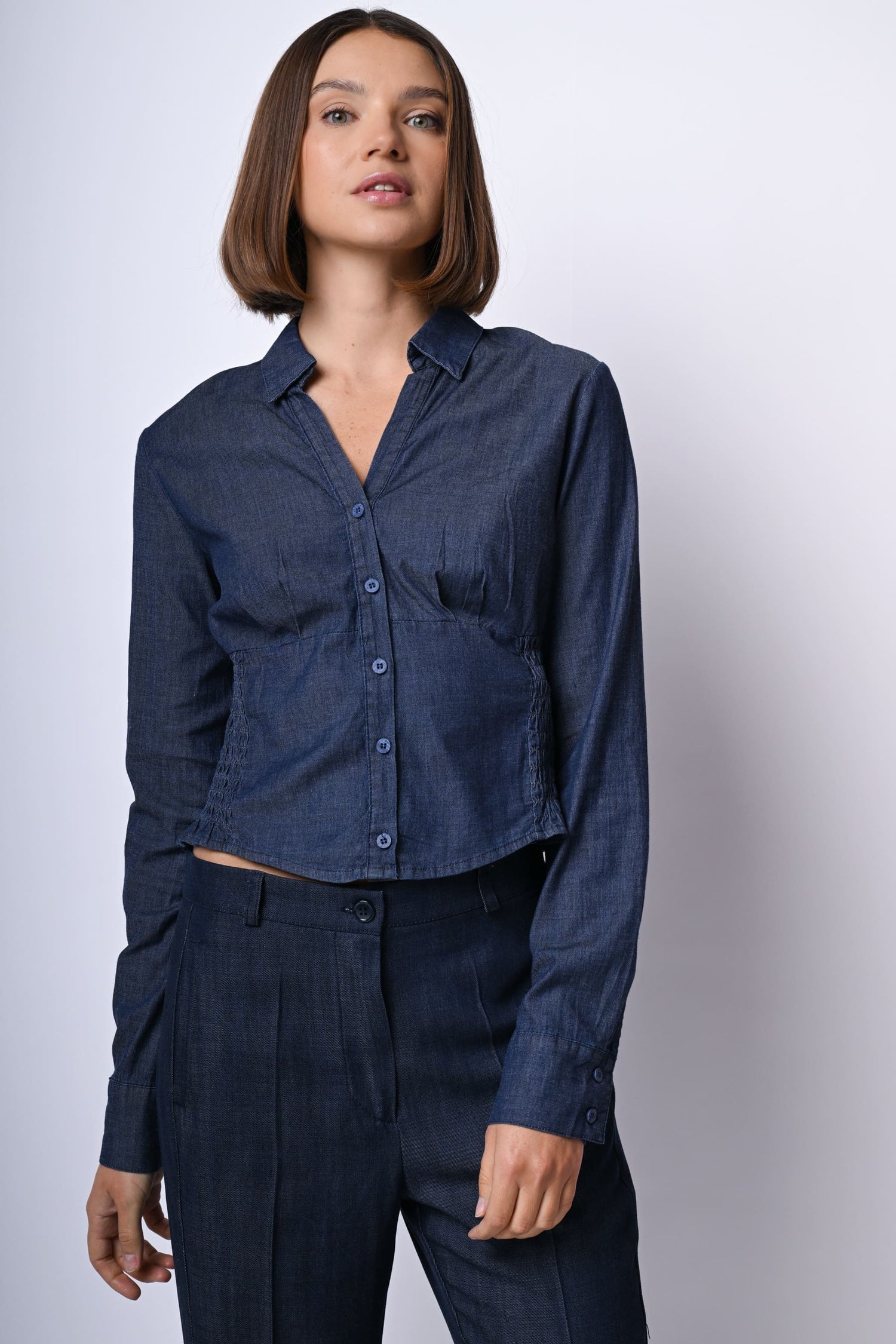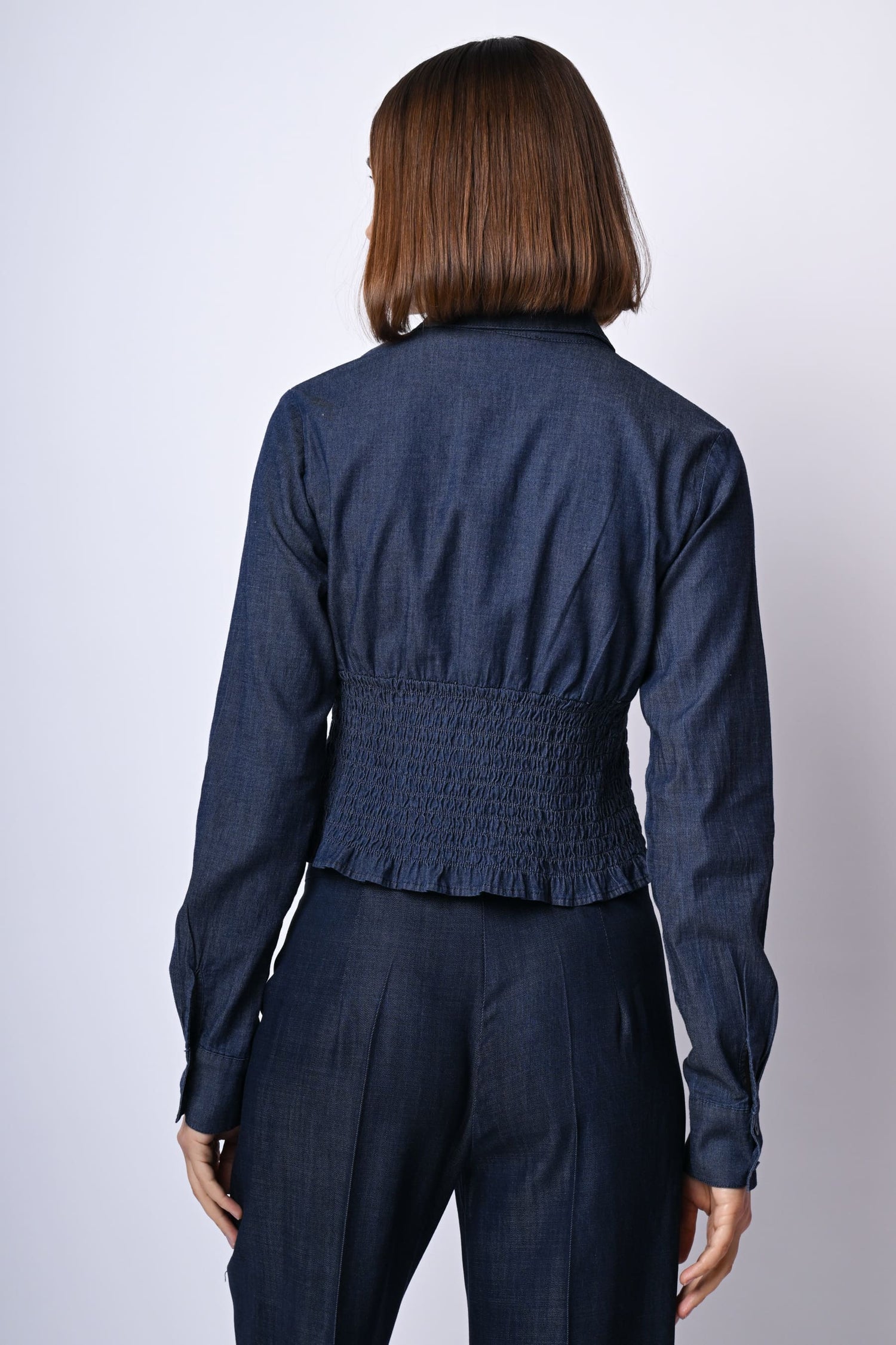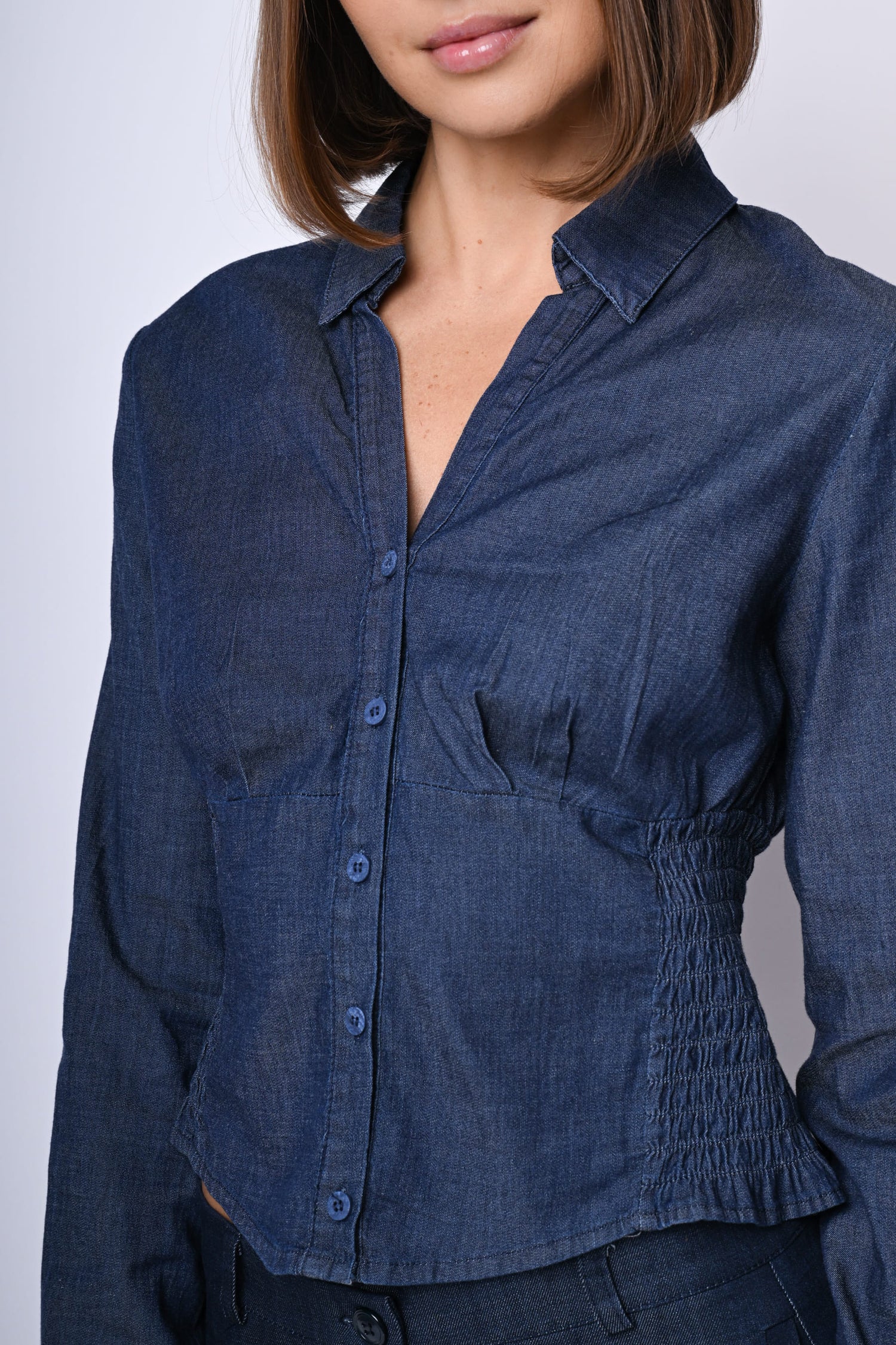Camicia in denim leggero misto cotone e lyocell blu con colletto a punta, scollo a V, abbottonatura frontale e ai polsini, taglio in vita stile bustier elasticizzato a punto smock sul retro e orlo stondato.