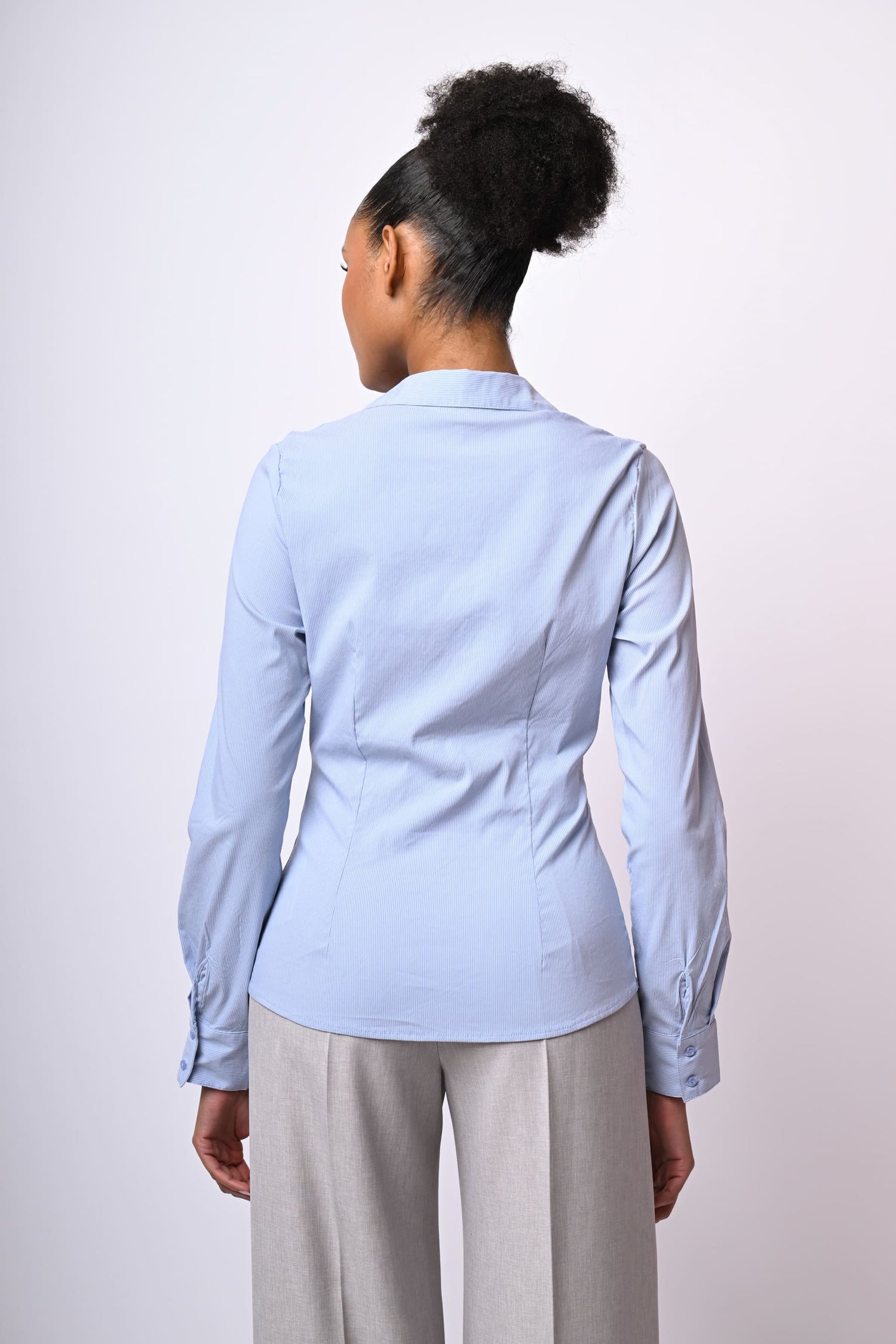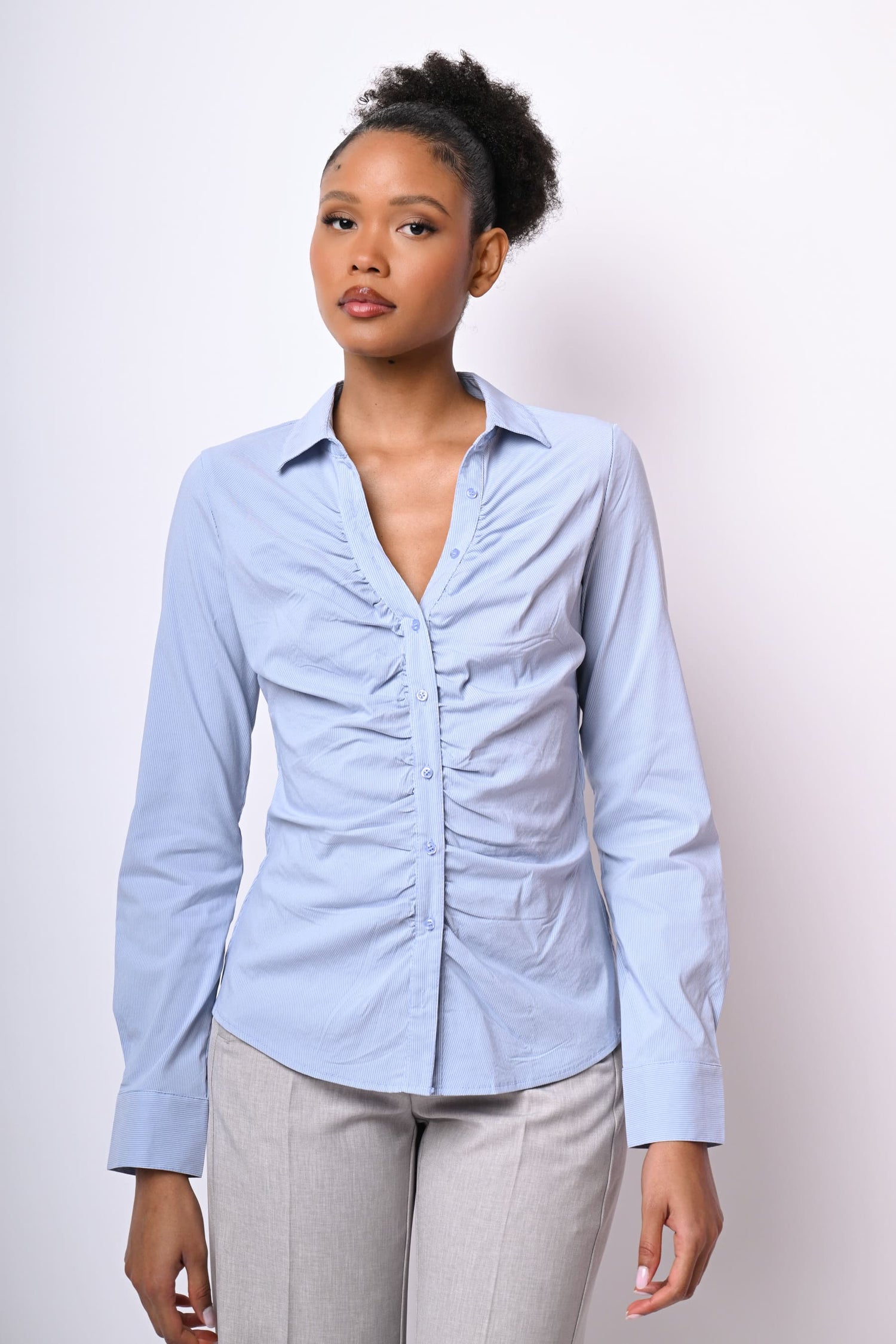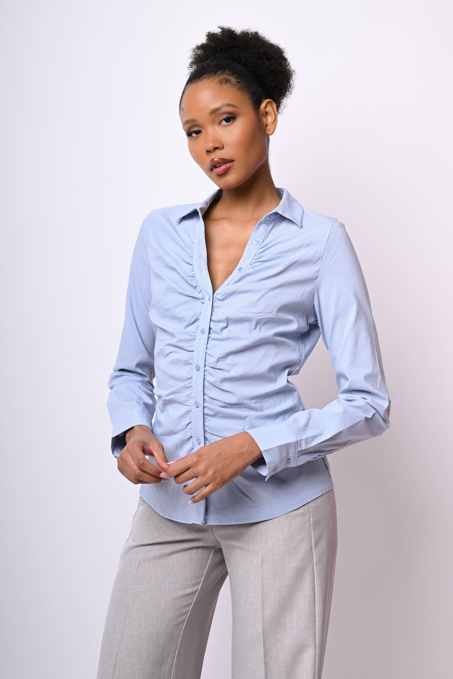 Camicia in cotone azzurro con colletto a punta, scollo a V, abbottonatura frontale e ai polsini, design arricciato e aderente e orlo stondato.