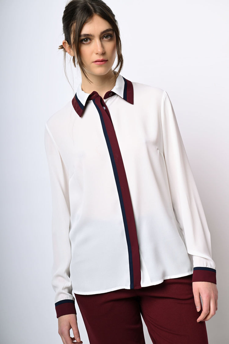 Camicia in crêpe bianco con colletto a punta, abbottonatura frontale nascosta, profili a contrasto a righe bordeaux e blu.