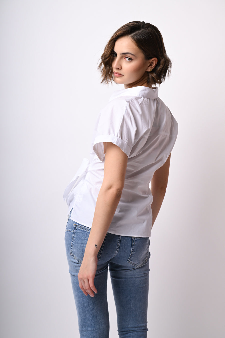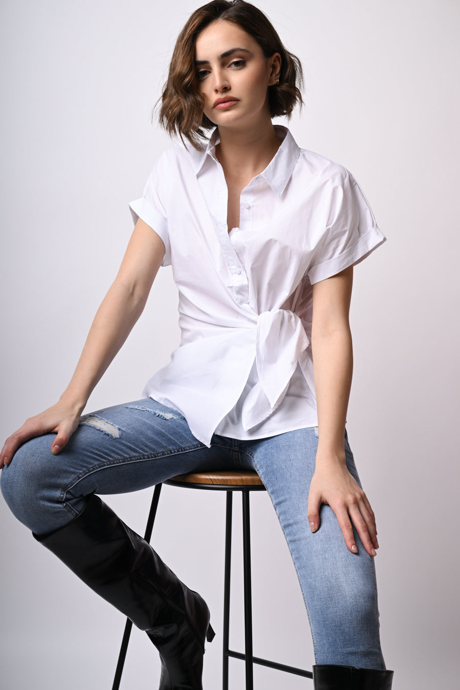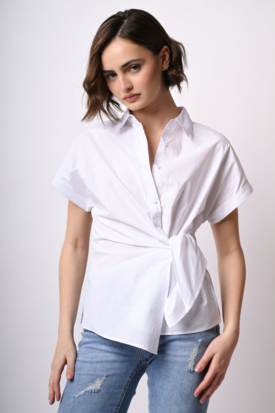 Camicia in cotone bianco con colletto a punta, abbottonatura frontale, maniche corte con risvolto e fiocco da annodare a lato.