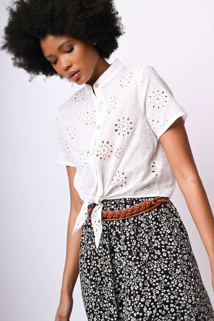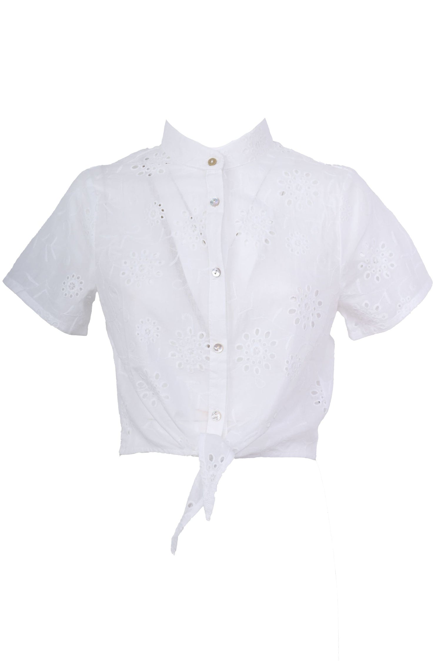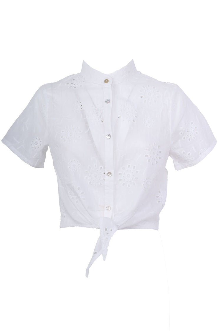 Camicia crop a mezze maniche in pizzo Sangallo bianco con colletto alla coreana, abbottonatura frontale e fiocco da annodare allorlo.