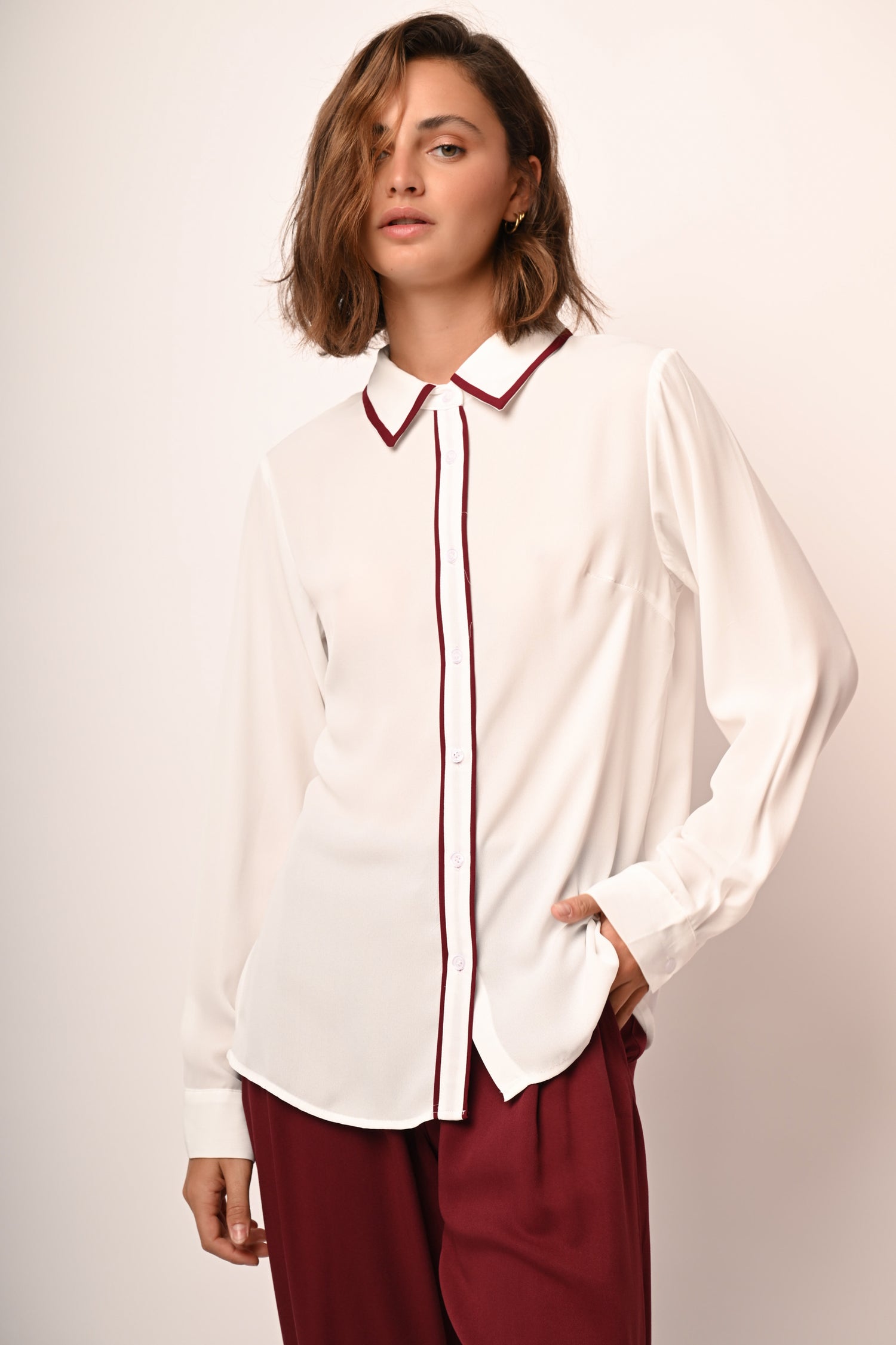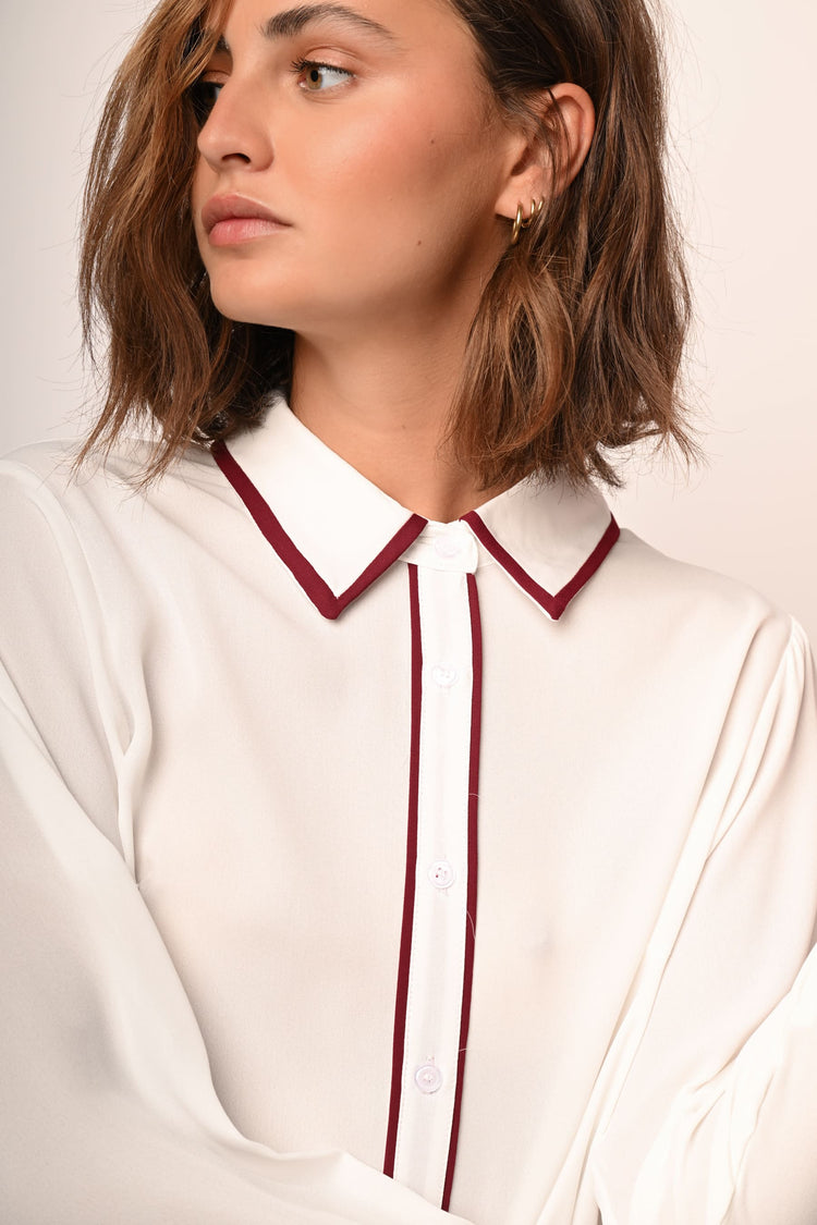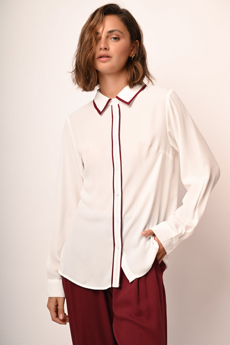 Camicia in cotone bianco con profili a contrasto bordeaux, colletto a punta, abbottonatura frontale e ai polsini e orlo stondato.