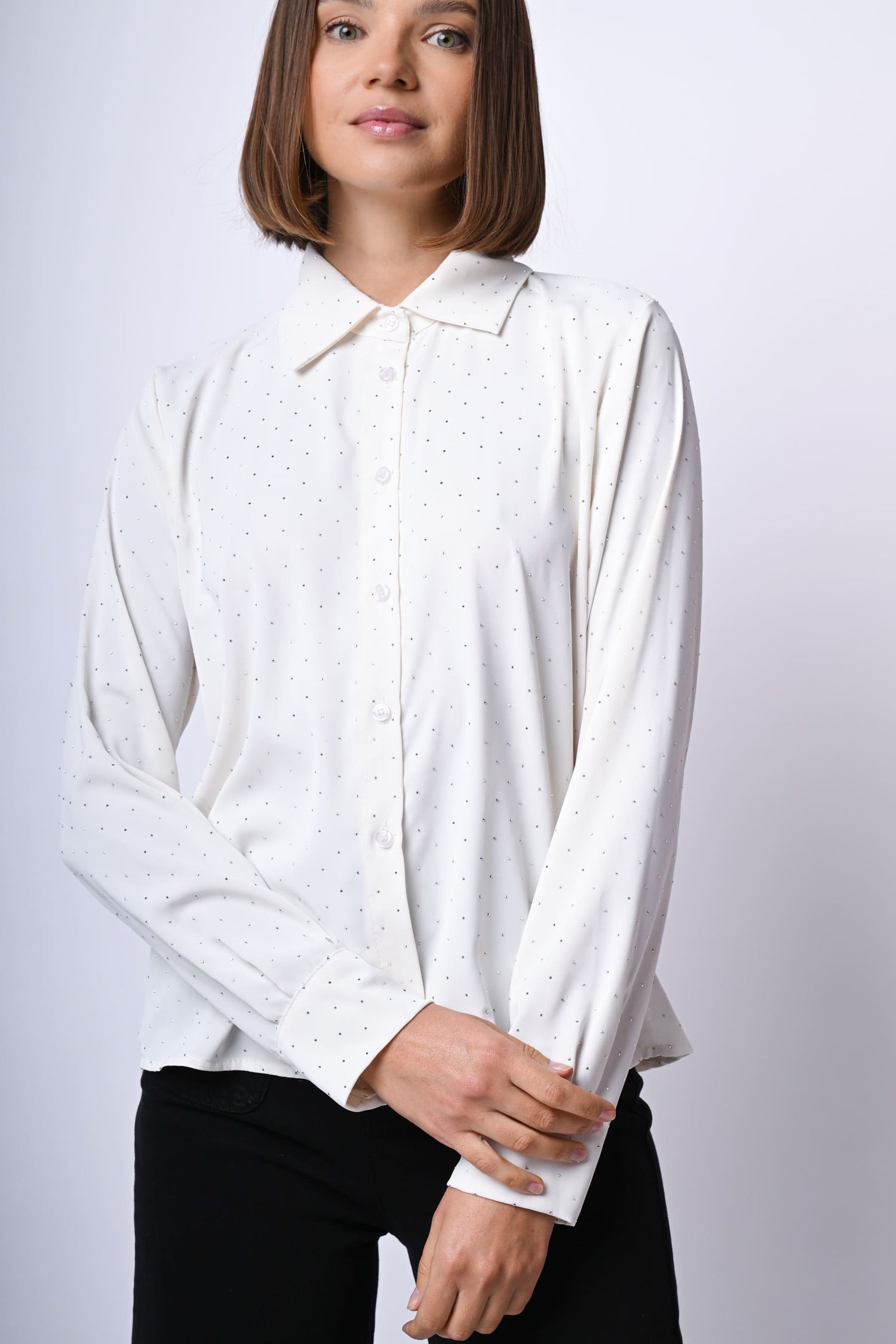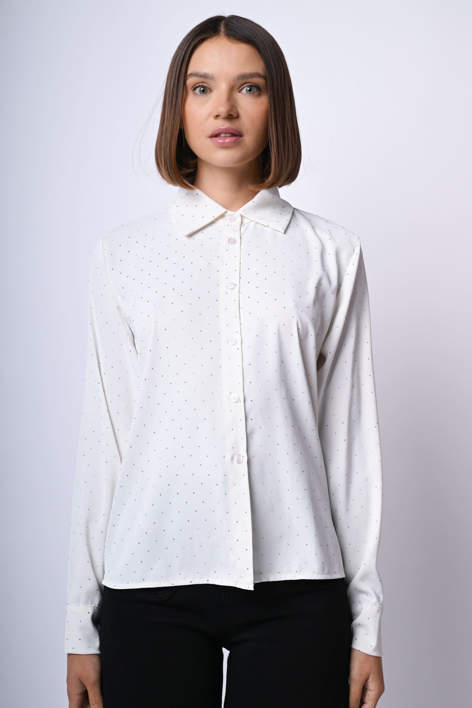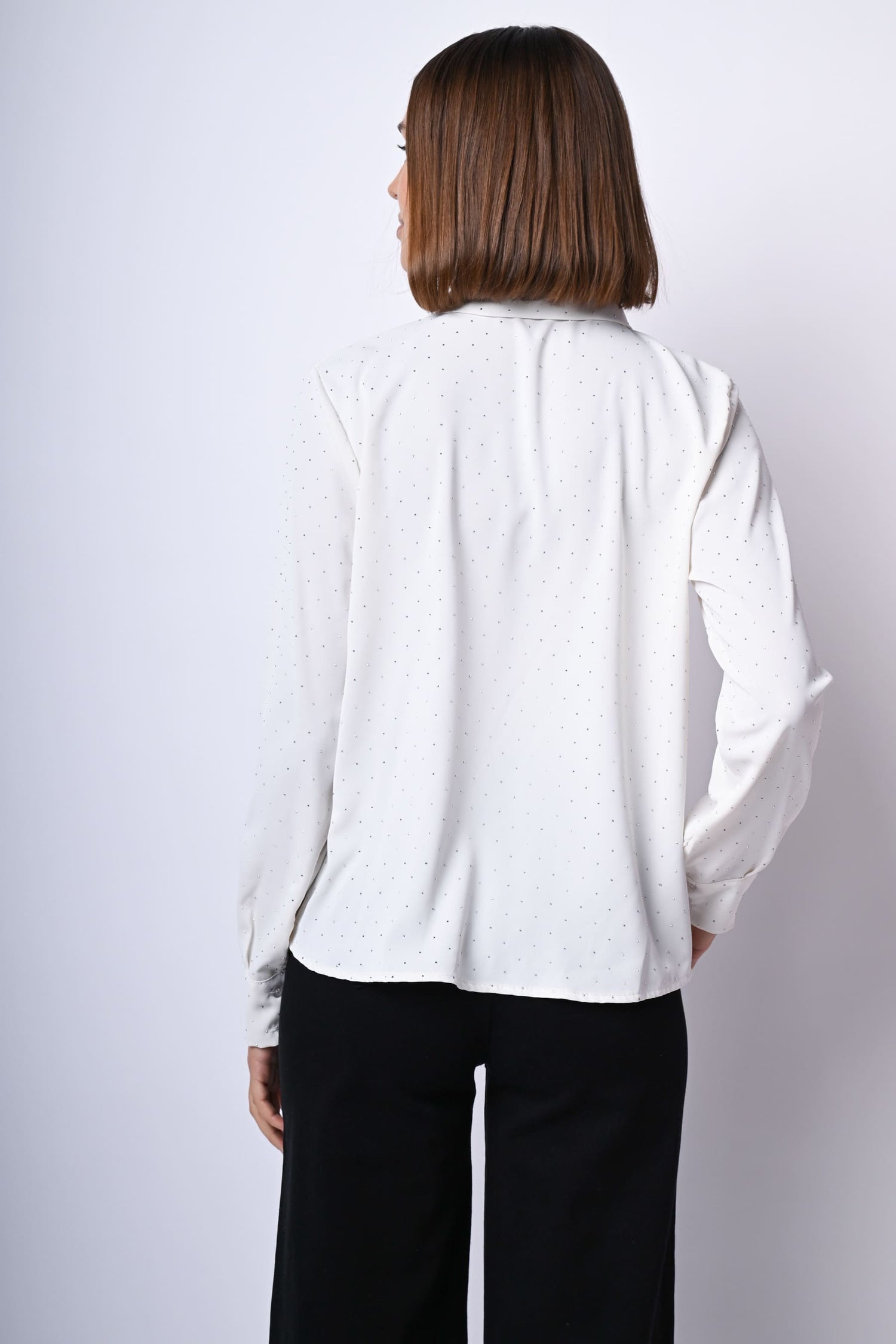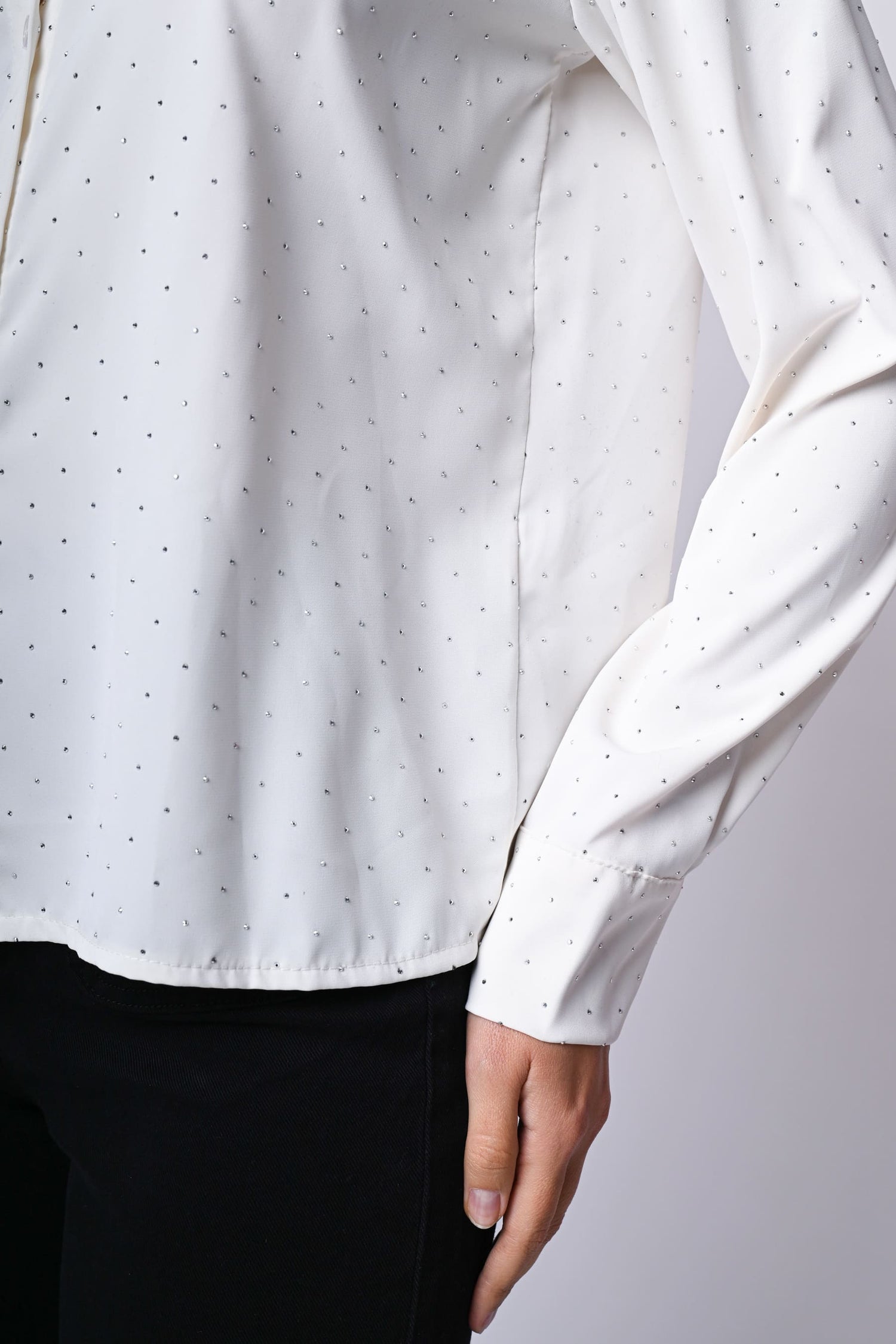 Camicia in tessuto bianco con colletto a punta, abbottonatura frontale e ai polsini, strass all-over e orlo stondato.